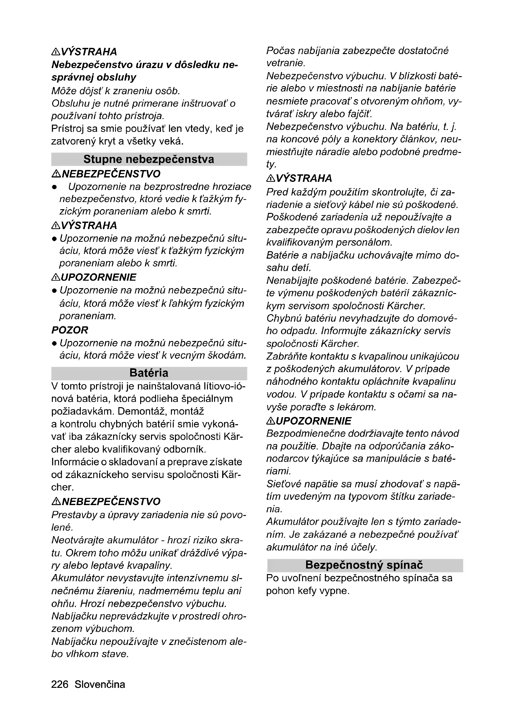 - Záruka 26 Slovenčina 몇 VÝSTRAHA Nebezpečenstvo úrazu v dôsledku ne- správnej obsluhy Môže dôjsť k zraneniu osôb. Obsluhu je nutné primerane inštruovať o používaní tohto prístroja. Prístroj sa smie používať len vtedy, keď je zatvorený kryt a všetky veká. Stupne nebezpečenstva NEBEZPEČENSTVO ● Upozornenie na bezprostredne hroziace nebezpečenstvo, ktoré vedie k ťažkým fy- zickým poraneniam alebo k smrti. 몇 VÝSTRAHA ● Upozornenie na možnú nebezpečnú situ- áciu, ktorá môže viesť k ťažkým fyzickým poraneniam alebo k smrti. 몇 UPOZORNENIE ● Upozornenie na možnú nebezpečnú situ- áciu, ktorá môže viesť k ľahkým fyzickým poraneniam. POZOR ● Upozornenie na možnú nebezpečnú situ- áciu, ktorá môže viesť k vecným škodám. Batéria V tomto prístroji je nainštalovaná lítiovo-ió- nová batéria, ktorá podlieha špeciálnym požiadavkám. Demontáž, montáž a kontrolu chybných batérií smie vykoná- vať iba zákaznícky servis spoločnosti Kär- cher alebo kvalifikovaný odborník. Informácie o skladovaní a preprave získate od zákazníckeho servisu spoločnosti Kär- cher. NEBEZPEČENSTVO Prestavby a úpravy zariadenia nie sú povo- lené. Neotvárajte akumulátor - hrozí riziko skra- tu. Okrem toho môžu unikať dráždivé výpa- ry alebo leptavé kvapaliny. Akumulátor nevystavujte intenzívnemu sl- nečnému žiareniu, nadmernému teplu ani ohňu. Hrozí nebezpečenstvo výbuchu. Nabíjačku neprevádzkujte v prostredí ohro- zenom výbuchom. Nabíjačku nepoužívajte v znečistenom ale- bo vlhkom stave. Počas nabíjania zabezpečte dostatočné vetranie. Nebezpečenstvo výbuchu. V blízkosti baté- rie alebo v miestnosti na nabíjanie batérie nesmiete pracovať s otvoreným ohňom, vy- tvárať iskry alebo fajčiť. Nebezpečenstvo výbuchu. Na batériu, t. j. na koncové póly a konektory článkov, neu- miestňujte náradie alebo podobné predme- ty. 몇 VÝSTRAHA Pred každým použitím skontrolujte, či za- riadenie a sieťový kábel nie sú poškodené. Poškodené zariadenia už nepoužívajte a zabezpečte opravu poškodených dielov len kvalifikovaným personálom. Batérie a nabíjačku uchovávajte mimo do- sahu detí. Nenabíjajte poškodené batérie. Zabezpeč- te výmenu poškodených batérií zákazníc- kym servisom spoločnosti Kärcher. Chybnú batériu nevyhadzujte do domové- ho odpadu. Informujte zákaznícky servis spoločnosti Kärcher. Zabráňte kontaktu s kvapalinou unikajúcou z poškodených akumulátorov. V prípade náhodného kontaktu opláchnite kvapalinu vodou. V prípade kontaktu s očami sa na- vyše poraďte s lekárom. 몇 UPOZORNENIE Bezpodmienečne dodržiavajte tento návod na použitie. Dbajte na odporúčania záko- nodarcov týkajúce sa manipulácie s baté- riami. Sieťové napätie sa musí zhodovať s napä- tím uvedeným na typovom štítku zariade- nia. Akumulátor používajte len s týmto zariade- ním. Je zakázané a nebezpečné používať akumulátor na iné účely. Bezpečnostný spínač Po uvoľnení bezpečnostného spínača sa pohon kefy vypne.Slovenčina 227 Používanie v súlade s účelom Toto zariadenie používajte výlučne v súla- de s údajmi uvedenými v tomto návode na použitie. Tento prístroj je vhodný na priemyselné použitie, napr. v hoteloch, školách, ne- mocniciach, továrňach, obchodoch, kanceláriách a prenajatých priestoroch. Prístroj používajte iba na čistenie tvr- dých povrchov, ktoré nie sú citlivé na vlhkosť a na leštenie. Prístroj nepoužívajte na čistenie zamrz- nutých podláh (napr. v chladiarňach). Na výbavu prístroja používajte iba origi- nálne príslušenstvo a náhradné diely. Prístroj používajte iba na čistenie interié- rových podláh. Ochrana životného prostredia Obalové materiály sú recyklovateľné. Obaly zlikvidujte ekologickým spôso- bom. Elektrické a elektronické prístroje ob- sahujú cenné recyklovateľné materiá- ly a často aj komponenty, akými sú napr. batérie, akumulátory alebo olej, ktoré môžu pri nesprávnej manipulácii alebo lik- vidácii predstavovať potenciálne nebezpe- čenstvo pre ľudské zdravie a životné prostredie. Tieto komponenty sú však po- trebné pre správnu prevádzku prístroja. Prístroje označené týmto symbolom nesmú byť likvidované spolu s domovým odpa- dom. Informácie o obsiahnutých látkach (RE- ACH) Aktuálne informácie o obsiahnutých lát- kach sú uvedené na: www.kaercher.de/ REACH Rozsah dodávky Rozsah dodávky zariadenia je znázornený na obale. Pri rozbaľovaní skontrolujte, či je obsah kompletný. V prípade chýbajúceho príslušenstva alebo pri výskyte poškodení spôsobených prepravou informujte Vášho predajcu.228 Slovenčina Prehľad zariadenia 1 Volant 2 Hviezdicová rukoväť, nastavenie výšky volantu 3 Hviezdicová rukoväť, prepravná poloha volantu 4 Veko nádrže na znečistenú vodu 5 Odblokovanie, veko nádrže na znečis- tenú vodu 6 Dávkovacie veko, nádrž na čistú vodu 7 Prepravné držadlo na zdvíhanie prístro- p. 2382