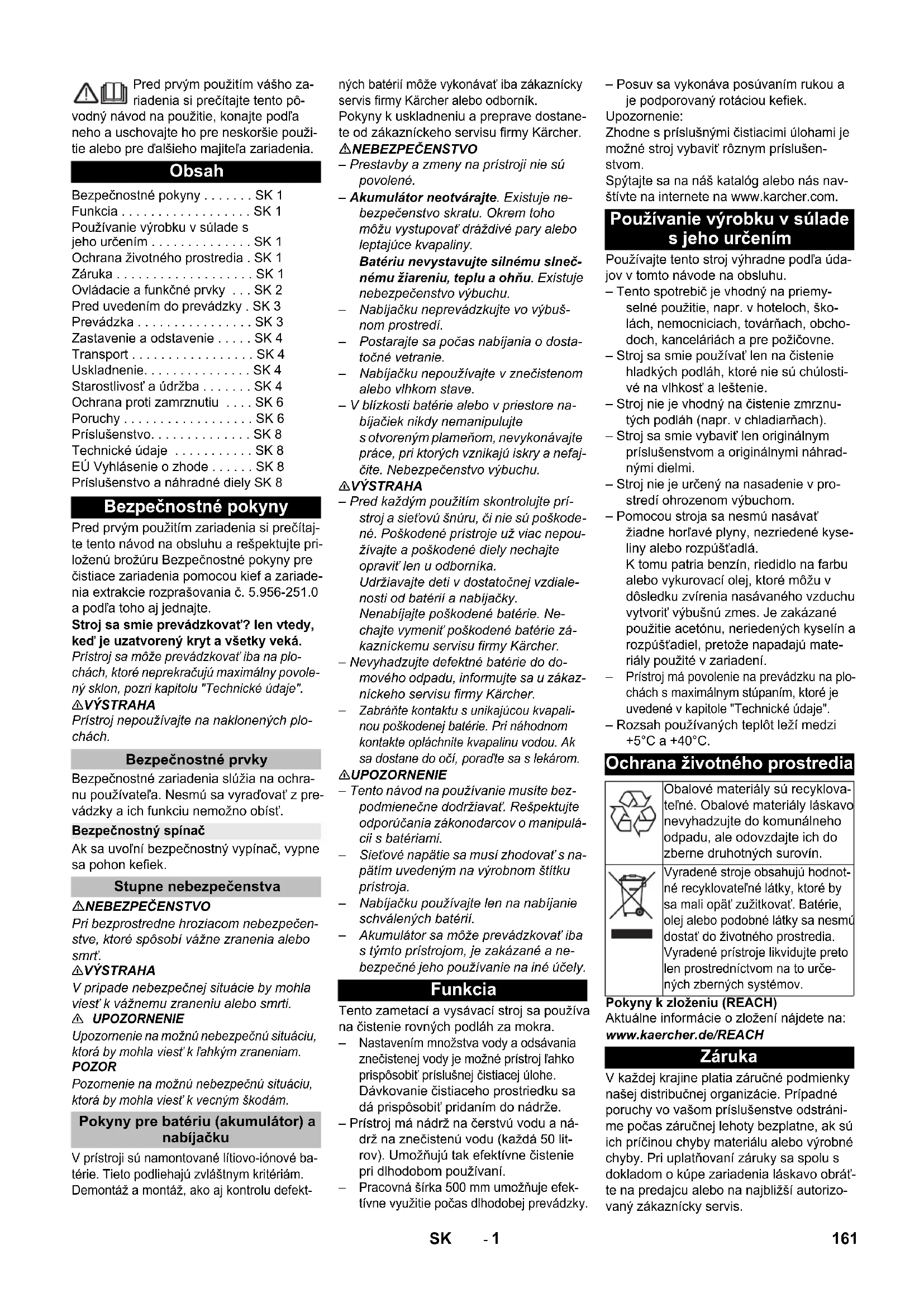 Prístroj má povolenie na prevádzku na plo- chách s maximálnym stúpaním, ktoré je uvedené v kapitole "Technické údaje". – Rozsah používaných teplôt leží medzi +5°C a +40°C. Pokyny k zloženiu (REACH) Aktuálne informácie o zložení nájdete na: www.kaercher.de/REACH V každej krajine platia záručné podmienky našej distribučnej organizácie. Prípadné poruchy vo vašom príslušenstve odstráni- me počas záručnej lehoty bezplatne, ak sú ich príčinou chyby materiálu alebo výrobné chyby. Pri uplatňovaní záruky sa spolu s dokladom o kúpe zariadenia láskavo obráť- te na predajcu alebo na najbližší autorizo- vaný zákaznícky servis. Obsah Bezpečnostné pokyny . . . . . . . SK 1 Funkcia . . . . . . . . . . . . . . . . . . SK 1 Používanie výrobku v súlade s jeho určením . . . . . . . . . . . . . . SK 1 Ochrana životného prostredia . SK 1 Záruka . . . . . . . . . . . . . . . . . . . SK 1 Ovládacie a funkčné prvky . . . SK 2 Pred uvedením do prevádzky . SK 3 Prevádzka . . . . . . . . . . . . . . . . SK 3 Zastavenie a odstavenie . . . . . SK 4 Transport . . . . . . . . . . . . . . . . . SK 4 Uskladnenie. . . . . . . . . . . . . . . SK 4 Starostlivosť a údržba . . . . . . . SK 4 Ochrana proti zamrznutiu . . . . SK 6 Poruchy . . . . . . . . . . . . . . . . . . SK 6 Príslušenstvo. . . . . . . . . . . . . . SK 8 Technické údaje . . . . . . . . . . . SK 8 EÚ Vyhlásenie o zhode . . . . . . SK 8 Príslušenstvo a náhradné diely SK 8 Bezpečnostné pokyny Bezpečnostné prvky Bezpečnostný spínač Stupne nebezpečenstva Pokyny pre batériu (akumulátor) a nabíjačku Funkcia Používanie výrobku v súlade s jeho určením Ochrana životného prostredia Obalové materiály sú recyklova- teľné. Obalové materiály láskavo nevyhadzujte do komunálneho odpadu, ale odovzdajte ich do zberne druhotných surovín. Vyradené stroje obsahujú hodnot- né recyklovateľné látky, ktoré by sa mali opäť zužitkovať. Batérie, olej alebo podobné látky sa nesmú dostať do životného prostredia. Vyradené prístroje likvidujte preto len prostredníctvom na to urče- ných zberných systémov. Záruka 161SK- 2 1 Filtračné sito 2 Bezpečnostné spínače 3 Batéria * 4 Vypúšťacia hadica na znečistenú vodu s dávkovacím zariadením 5 Upevňovacia lišta pre Homebase 6Plavák 7 Nádrž na čistú vodu 8 Uzáver nádrže na čistú vodu 9 Čistiaca hlava 10 Kefka na kotúče 11 Plniaci otvor nádrže na čistú vodu 12 Rukoväť na výmenu kefy 13 Nádrž znečistenej vody 14 Pedál prepravného podvozka 15 Zobrazenie stavu naplnenia čistou vo- dou 16 Otočná rukoväť na sklonenie nasáva- cieho nosníka 17 Výškovo nastaviteľný nasávací nadsta- vec 18 Krídlové matice na upevnenie sacej nadstavby 19 Sací nadstavec * 20 Vysávacia hadica 21 Regulačná hlava množstva vody 22 Zástrčka batérie 23 Páka spustenia sacej nadstavby 24 Ovládací panel 25 Posuvná rukoväť 26 Odstavná plocha pre čistiacu súpravu „Homebase Box“ 27 Kryt nádrže znečistenej vody