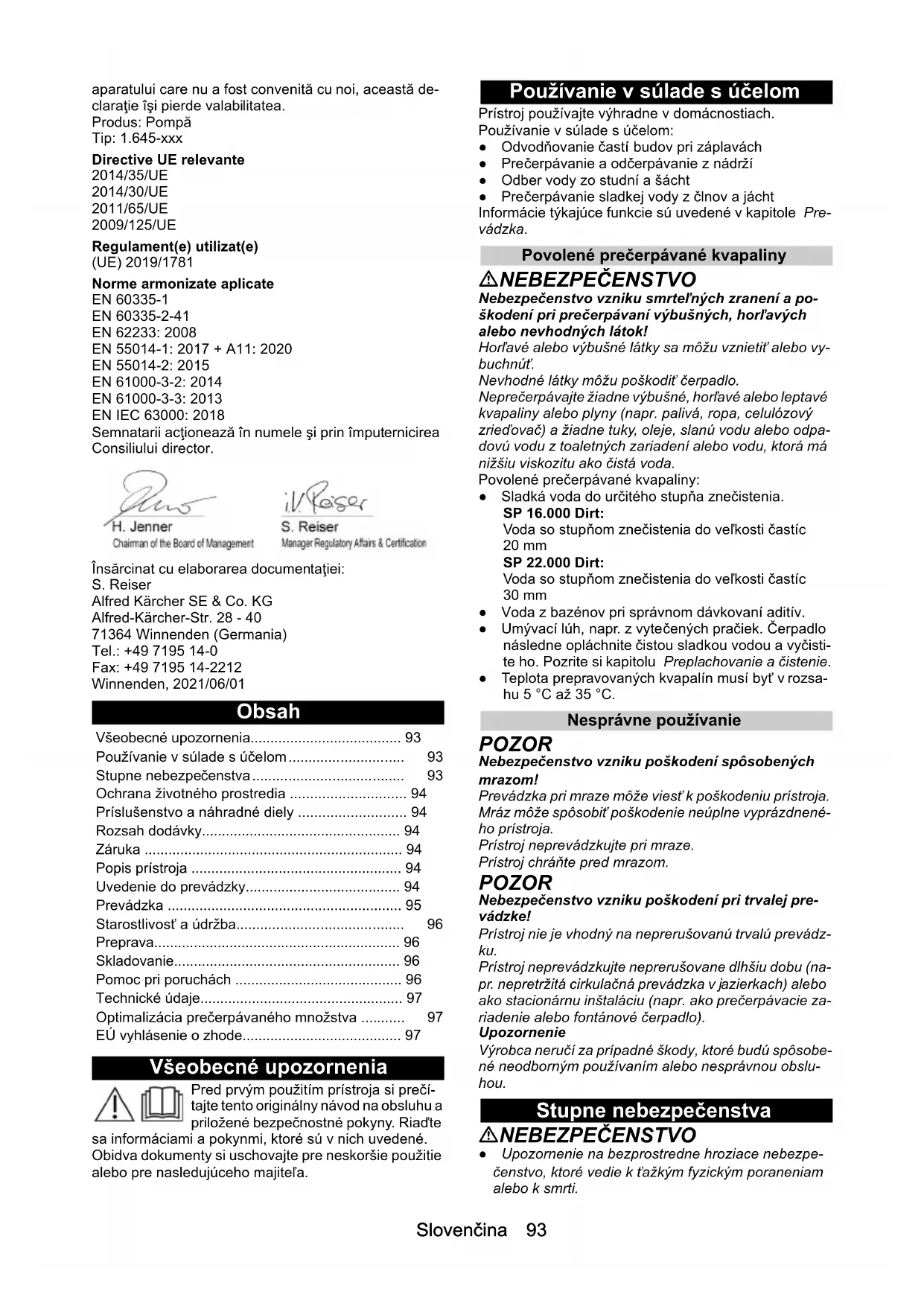 - Dimensiune particule (max.) pentru lichide pom- pate admisibile mm 20 30 Nivel minim lichid (mod manual) mm 60 50 Înălțime lichid rezidual mm 25 35 Greutate (fără accesorii) kg 4,9 6,5Slovenčina 93 aparatului care nu a fost convenită cu noi, această de- claraţie îşi pierde valabilitatea. Produs: Pompă Tip: 1.645-xxx Directive UE relevante 2014/35/UE 2014/30/UE 2011/65/UE 2009/125/UE Regulament(e) utilizat(e) (UE) 2019/1781 Norme armonizate aplicate EN 60335-1 EN 60335-2-41 EN 62233: 2008 EN 55014-1: 2017 + A11: 2020 EN 55014-2: 2015 EN 61000-3-2: 2014 EN 61000-3-3: 2013 EN IEC 63000: 2018 Semnatarii acţionează în numele şi prin împuternicirea Consiliului director. Însărcinat cu elaborarea documentaţiei: S. Reiser Alfred Kärcher SE & Co. KG Alfred-Kärcher-Str. 28 - 40 71364 Winnenden (Germania) Tel.: +49 7195 14-0 Fax: +49 7195 14-2212 Winnenden, 2021/06/01 Obsah Všeobecné upozornenia Pred prvým použitím prístroja si prečí- tajte tento originálny návod na obsluhu a priložené bezpečnostné pokyny. Riaďte sa informáciami a pokynmi, ktoré sú v nich uvedené. Obidva dokumenty si uschovajte pre neskoršie použitie alebo pre nasledujúceho majiteľa. Používanie v súlade s účelom Prístroj používajte výhradne v domácnostiach. Používanie v súlade s účelom: ● Odvodňovanie častí budov pri záplavách ● Prečerpávanie a odčerpávanie z nádrží ● Odber vody zo studní a šácht ● Prečerpávanie sladkej vody z člnov a jácht Informácie týkajúce funkcie sú uvedené v kapitole Pre- vádzka. Povolené prečerpávané kvapaliny NEBEZPEČENSTVO Nebezpečenstvo vzniku smrteľných zranení a po- škodení pri prečerpávaní výbušných, horľavých alebo nevhodných látok! Horľavé alebo výbušné látky sa môžu vznietiť alebo vy- buchnúť. Nevhodné látky môžu poškodiť čerpadlo. Neprečerpávajte žiadne výbušné, horľavé alebo leptavé kvapaliny alebo plyny (napr. palivá, ropa, celulózový zrieďovač) a žiadne tuky, oleje, slanú vodu alebo odpa- dovú vodu z toaletných zariadení alebo vodu, ktorá má nižšiu viskozitu ako čistá voda. Povolené prečerpávané kvapaliny: ● Sladká voda do určitého stupňa znečistenia. SP 16.000 Dirt: Voda so stupňom znečistenia do veľkosti častíc 20 mm SP 22.000 Dirt: Voda so stupňom znečistenia do veľkosti častíc 30 mm ● Voda z bazénov pri správnom dávkovaní aditív. ● Umývací lúh, napr. z vytečených pračiek. Čerpadlo následne opláchnite čistou sladkou vodou a vyčisti- te ho. Pozrite si kapitolu Preplachovanie a čistenie. ● Teplota prepravovaných kvapalín musí byť v rozsa- hu 5 °C až 35 °C. Nesprávne používanie POZOR Nebezpečenstvo vzniku poškodení spôsobených mrazom! Prevádzka pri mraze môže viesť k poškodeniu prístroja. Mráz môže spôsobiť poškodenie neúplne vyprázdnené- ho prístroja. Prístroj neprevádzkujte pri mraze. Prístroj chráňte pred mrazom. POZOR Nebezpečenstvo vzniku poškodení pri trvalej pre- vádzke! Prístroj nie je vhodný na neprerušovanú trvalú prevádz- ku. Prístroj neprevádzkujte neprerušovane dlhšiu dobu (na- pr. nepretržitá cirkulačná prevádzka v jazierkach) alebo ako stacionárnu inštaláciu (napr. ako prečerpávacie za- riadenie alebo fontánové čerpadlo). Upozornenie Výrobca neručí za prípadné škody, ktoré budú spôsobe- né neodborným používaním alebo nesprávnou obslu- hou. Stupne nebezpečenstva NEBEZPEČENSTVO ● Upozornenie na bezprostredne hroziace nebezpe- čenstvo, ktoré vedie k ťažkým fyzickým poraneniam alebo k smrti. Všeobecné upozornenia p. 93