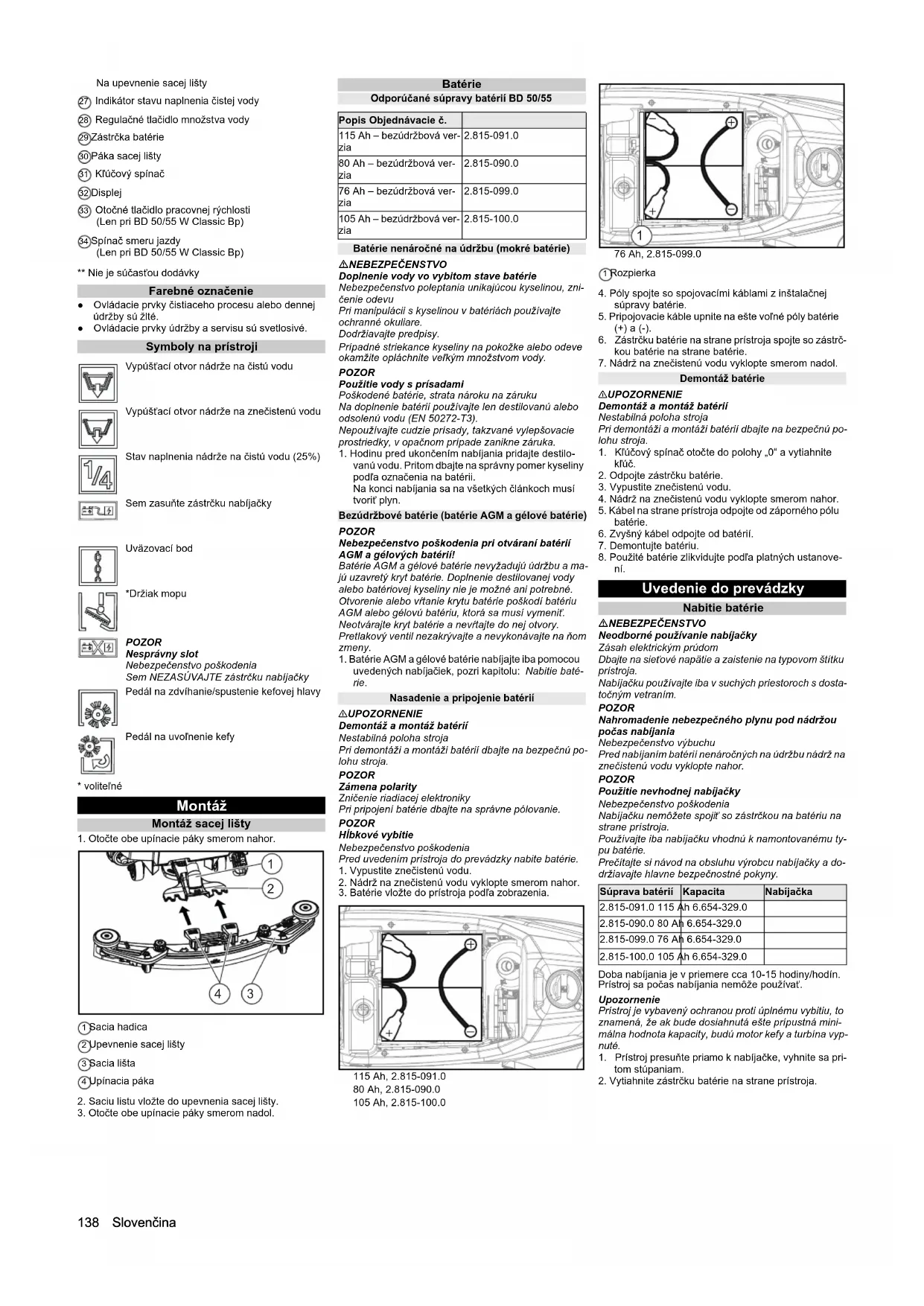 - voliteľné Montáž Montáž sacej lišty 1. Otočte obe upínacie páky smerom nahor.1 Sacia hadica2 Upevnenie sacej lišty3 Sacia lišta4 Upínacia páka2. Saciu listu vložte do upevnenia sacej lišty.3. Otočte obe upínacie páky smerom nadol. Batérie Odporúčané súpravy batérií BD 50/55Batérie nenáročné na údržbu (mokré batérie) NEBEZPEČENSTVODoplnenie vody vo vybitom stave batérieNebezpečenstvo poleptania unikajúcou kyselinou, zni-čenie odevuPri manipulácii s kyselinou v batériách používajte ochranné okuliare.Dodržiavajte predpisy.Prípadné striekance kyseliny na pokožke alebo odeve okamžite opláchnite veľkým množstvom vody.POZORPoužitie vody s prísadamiPoškodené batérie, strata nároku na zárukuNa doplnenie batérií používajte len destilovanú alebo odsolenú vodu (EN 50272-T3).Nepoužívajte cudzie prísady, takzvané vylepšovacie prostriedky, v opačnom prípade zanikne záruka.1. Hodinu pred ukončením nabíjania pridajte destilo-vanú vodu. Pritom dbajte na správny pomer kyseliny podľa označenia na batérii. Na konci nabíjania sa na všetkých článkoch musí tvoriť plyn.Bezúdržbové batérie (batérie AGM a gélové batérie)POZORNebezpečenstvo poškodenia pri otváraní batérií AGM a gélových batérií!Batérie AGM a gélové batérie nevyžadujú údržbu a ma-jú uzavretý kryt batérie. Doplnenie destilovanej vody alebo batériovej kyseliny nie je možné ani potrebné. Otvorenie alebo vŕtanie krytu batérie poškodí batériu AGM alebo gélovú batériu, ktorá sa musí vymeniť.Neotvárajte kryt batérie a nevŕtajte do nej otvory.Pretlakový ventil nezakrývajte a nevykonávajte na ňom zmeny.1. Batérie AGM a gélové batérie nabíjajte iba pomocou uvedených nabíjačiek, pozri kapitolu: Nabitie baté- rie.Nasadenie a pripojenie batérií몇 UPOZORNENIEDemontáž a montáž batériíNestabilná poloha strojaPri demontáži a montáži batérií dbajte na bezpečnú po-lohu stroja.POZORZámena polarityZničenie riadiacej elektronikyPri pripojení batérie dbajte na správne pólovanie.POZORHĺbkové vybitieNebezpečenstvo poškodeniaPred uvedením prístroja do prevádzky nabite batérie.1. Vypustite znečistenú vodu.2. Nádrž na znečistenú vodu vyklopte smerom nahor.3. Batérie vložte do prístroja podľa zobrazenia.115 Ah, 2.815-091.080 Ah, 2.815-090.0105 Ah, 2.815-100.076 Ah, 2.815-099.01 Rozpierka4. Póly spojte so spojovacími káblami z inštalačnejsúpravy batérie.5. Pripojovacie káble upnite na ešte voľné póly batérie(+) a (-).