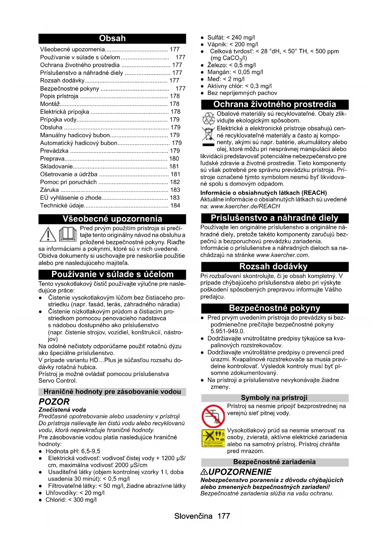 • /l) ● Železo: < 0,5 mg/l ● Mangán: < 0,05 mg/l ● Meď: < 2 mg/l ● Aktívny chlór: < 0,3 mg/l ● Bez nepríjemných pachov Ochrana životného prostredia Obalové materiály sú recyklovateľné. Obaly zlik- vidujte ekologickým spôsobom. Elektrické a elektronické prístroje obsahujú cen- né recyklovateľné materiály a často aj kompo- nenty, akými sú napr. batérie, akumulátory alebo olej, ktoré môžu pri nesprávnej manipulácii alebo likvidácii predstavovať potenciálne nebezpečenstvo pre ľudské zdravie a životné prostredie. Tieto komponenty sú však potrebné pre správnu prevádzku prístroja. Prí- stroje označené týmto symbolom nesmú byť likvidova- né spolu s domovým odpadom. Informácie o obsiahnutých látkach (REACH) Aktuálne informácie o obsiahnutých látkach sú uvedené na: www.kaercher.de/REACH Príslušenstvo a náhradné diely Používajte len originálne príslušenstvo a originálne ná- hradné diely, pretože takéto komponenty zaručujú bez- pečnú a bezporuchovú prevádzku zariadenia. Informácie o príslušenstve a náhradných dieloch sa na- chádzajú na stránke www.kaercher.com. Rozsah dodávky Pri rozbaľovaní skontrolujte, či je obsah kompletný. V prípade chýbajúceho príslušenstva alebo pri výskyte poškodení spôsobených prepravou informujte Vášho predajcu. Bezpečnostné pokyny ● Pred prvým uvedením prístroja do prevádzky si bez- podmienečne prečítajte bezpečnostné pokyny 5.951-949.0. ● Dodržiavajte vnútroštátne predpisy týkajúce sa kva- palinových rozstrekovačov. ● Dodržiavajte vnútroštátne predpisy o prevencii pred úrazmi. Kvapalinové rozstrekovače sa musia pravi- delne kontrolovať. Výsledok kontroly musí byť pí- somne zdokumentovaný. ● Na prístroji a príslušenstve nevykonávajte žiadne zmeny. Symboly na prístroji Prístroj sa nesmie pripojiť bezprostrednej na verejnú sieť pitnej vody. Vysokotlakový prúd sa nesmie smerovať na osoby, zvieratá, aktívne elektrické zariadenia alebo na samotný prístroj. Prístroj chráňte pred mrazom. Bezpečnostné zariadenia 몇 UPOZORNENIE Nebezpečenstvo poranenia z dôvodu chýbajúcich alebo zmenených bezpečnostných zariadení! Bezpečnostné zariadenia slúžia na vašu ochranu. Všeobecné upozornenia p. 177