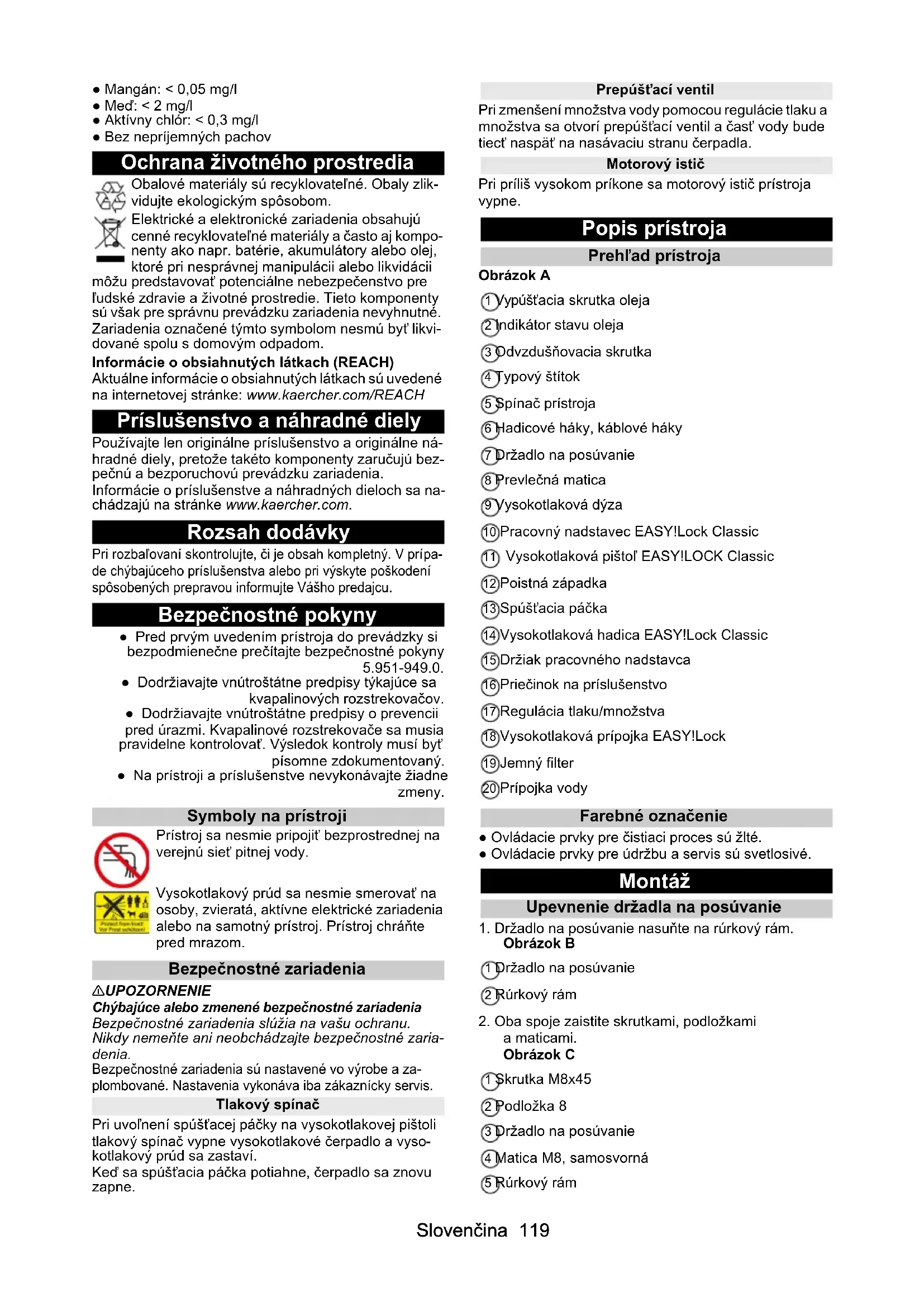 • EÚ vyhlásenie o zhode Slovenčina 119 ● Mangán: < 0,05 mg/l ● Meď: < 2 mg/l ● Aktívny chlór: < 0,3 mg/l ● Bez nepríjemných pachov Ochrana životného prostredia Obalové materiály sú recyklovateľné. Obaly zlik- vidujte ekologickým spôsobom. Elektrické a elektronické zariadenia obsahujú cenné recyklovateľné materiály a často aj kompo- nenty ako napr. batérie, akumulátory alebo olej, ktoré pri nesprávnej manipulácii alebo likvidácii môžu predstavovať potenciálne nebezpečenstvo pre ľudské zdravie a životné prostredie. Tieto komponenty sú však pre správnu prevádzku zariadenia nevyhnutné. Zariadenia označené týmto symbolom nesmú byť likvi- dované spolu s domovým odpadom. Informácie o obsiahnutých látkach (REACH) Aktuálne informácie o obsiahnutých látkach sú uvedené na internetovej stránke: www.kaercher.com/REACH Príslušenstvo a náhradné diely Používajte len originálne príslušenstvo a originálne ná- hradné diely, pretože takéto komponenty zaručujú bez- pečnú a bezporuchovú prevádzku zariadenia. Informácie o príslušenstve a náhradných dieloch sa na- chádzajú na stránke www.kaercher.com. Rozsah dodávky Pri rozbaľovaní skontrolujte, či je obsah kompletný. V prípa- de chýbajúceho príslušenstva alebo pri výskyte poškodení spôsobených prepravou informujte Vášho predajcu. Bezpečnostné pokyny ● Pred prvým uvedením prístroja do prevádzky si bezpodmienečne prečítajte bezpečnostné pokyny 5.951-949.0. ● Dodržiavajte vnútroštátne predpisy týkajúce sa kvapalinových rozstrekovačov. ● Dodržiavajte vnútroštátne predpisy o prevencii pred úrazmi. Kvapalinové rozstrekovače sa musia pravidelne kontrolovať. Výsledok kontroly musí byť písomne zdokumentovaný. ● Na prístroji a príslušenstve nevykonávajte žiadne zmeny. Symboly na prístroji Prístroj sa nesmie pripojiť bezprostrednej na verejnú sieť pitnej vody. Vysokotlakový prúd sa nesmie smerovať na osoby, zvieratá, aktívne elektrické zariadenia alebo na samotný prístroj. Prístroj chráňte pred mrazom. Bezpečnostné zariadenia 몇 UPOZORNENIE Chýbajúce alebo zmenené bezpečnostné zariadenia Bezpečnostné zariadenia slúžia na vašu ochranu. Nikdy nemeňte ani neobchádzajte bezpečnostné zaria- denia. Bezpečnostné zariadenia sú nastavené vo výrobe a za- plombované. Nastavenia vykonáva iba zákaznícky servis. Tlakový spínač Pri uvoľnení spúšťacej páčky na vysokotlakovej pištoli tlakový spínač vypne vysokotlakové čerpadlo a vyso- kotlakový prúd sa zastaví. Keď sa spúšťacia páčka potiahne, čerpadlo sa znovu zapne. Prepúšťací ventil Pri zmenšení množstva vody pomocou regulácie tlaku a množstva sa otvorí prepúšťací ventil a časť vody bude tiecť naspäť na nasávaciu stranu čerpadla. Motorový istič Pri príliš vysokom príkone sa motorový istič prístroja vypne. Popis prístroja Prehľad prístroja Obrázok A 1 Vypúšťacia skrutka oleja 2 Indikátor stavu oleja 3 Odvzdušňovacia skrutka 4 Typový štítok 5 Spínač prístroja 6 Hadicové háky, káblové háky 7 Držadlo na posúvanie 8 Prevlečná matica 9 Vysokotlaková dýza 10 Pracovný nadstavec EASY!Lock Classic 11 Vysokotlaková pištoľ EASY!LOCK Classic 12 Poistná západka 13 Spúšťacia páčka 14 Vysokotlaková hadica EASY!Lock Classic 15 Držiak pracovného nadstavca 16 Priečinok na príslušenstvo 17 Regulácia tlaku/množstva 18 Vysokotlaková prípojka EASY!Lock 19 Jemný filter 20 Prípojka vody Farebné označenie ● Ovládacie prvky pre čistiaci proces sú žlté. ● Ovládacie prvky pre údržbu a servis sú svetlosivé. Montáž Upevnenie držadla na posúvanie p. 124