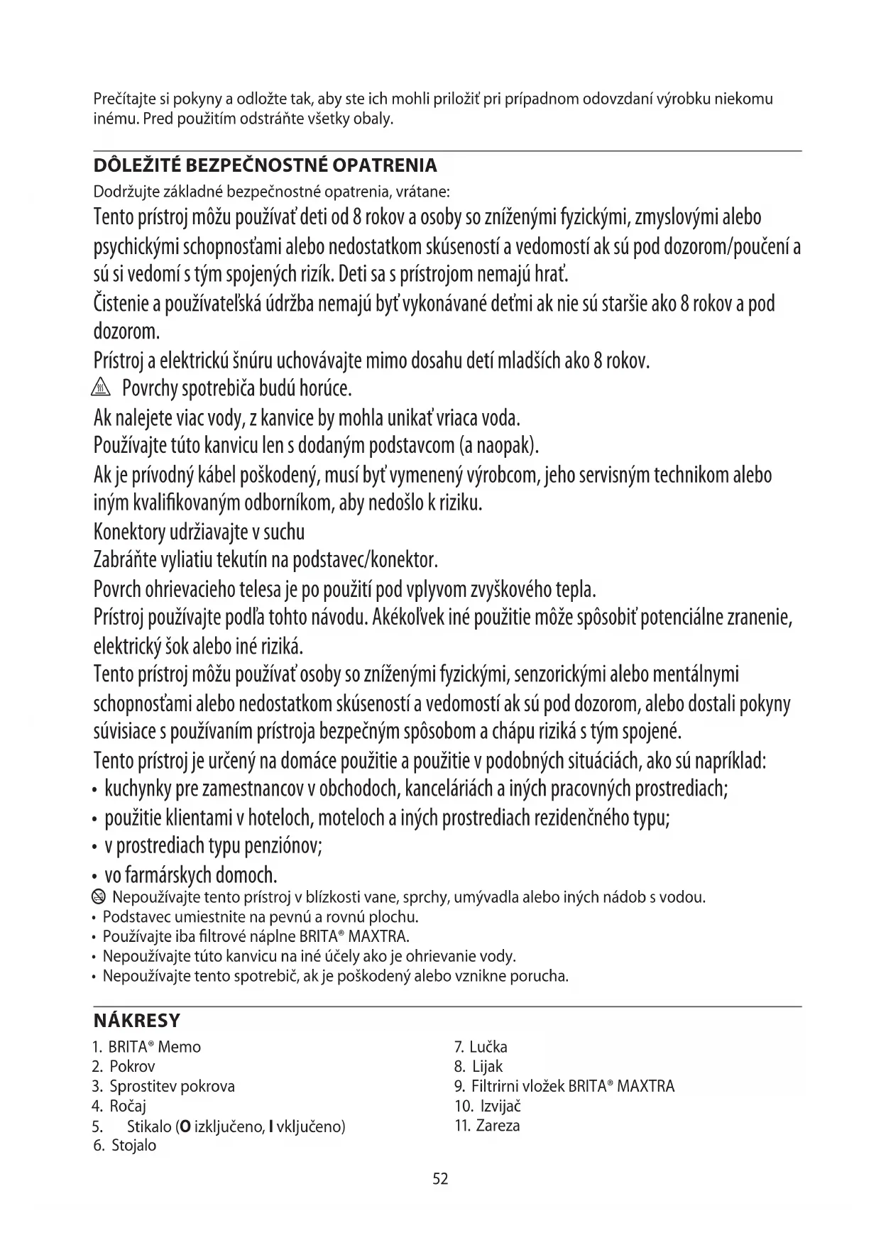 Dodržujte základné bezpečnostné opatrenia, vrátane: Tento prístroj môžu používať deti od 8 rokov a osoby so zníženými fyzickými, zmyslovými alebo psychickými schopnosťami alebo nedostatkom skúseností a vedomostí ak sú pod dozorom/poučení a sú si vedomí s tým spojených rizík. Deti sa s prístrojom nemajú hrať. Čistenie a používateľská údržba nemajú byť vykonávané deťmi ak nie sú staršie ako 8 rokov a pod dozorom. Prístroj a elektrickú šnúru uchovávajte mimo dosahu detí mladších ako 8 rokov. h Povrchy spotrebiča budú horúce. Ak nalejete viac vody, z kanvice by mohla unikať vriaca voda. Používajte túto kanvicu len s dodaným podstavcom (a naopak). Ak je prívodný kábel poškodený, musí byť vymenený výrobcom, jeho servisným technikom alebo iným kvalifikovaným odborníkom, aby nedošlo k riziku. Konektory udržiavajte v suchu Zabráňte vyliatiu tekutín na podstavec/konektor. Povrch ohrievacieho telesa je po použití pod vplyvom zvyškového tepla. Prístroj používajte podľa tohto návodu. Akékoľvek iné použitie môže spôsobiť potenciálne zranenie, elektrický šok alebo iné riziká. Tento prístroj môžu používať osoby so zníženými fyzickými, senzorickými alebo mentálnymi schopnosťami alebo nedostatkom skúseností a vedomostí ak sú pod dozorom, alebo dostali pokyny súvisiace s používaním prístroja bezpečným spôsobom a chápu riziká s tým spojené. Tento prístroj je určený na domáce použitie a použitie v podobných situáciách, ako sú napríklad: