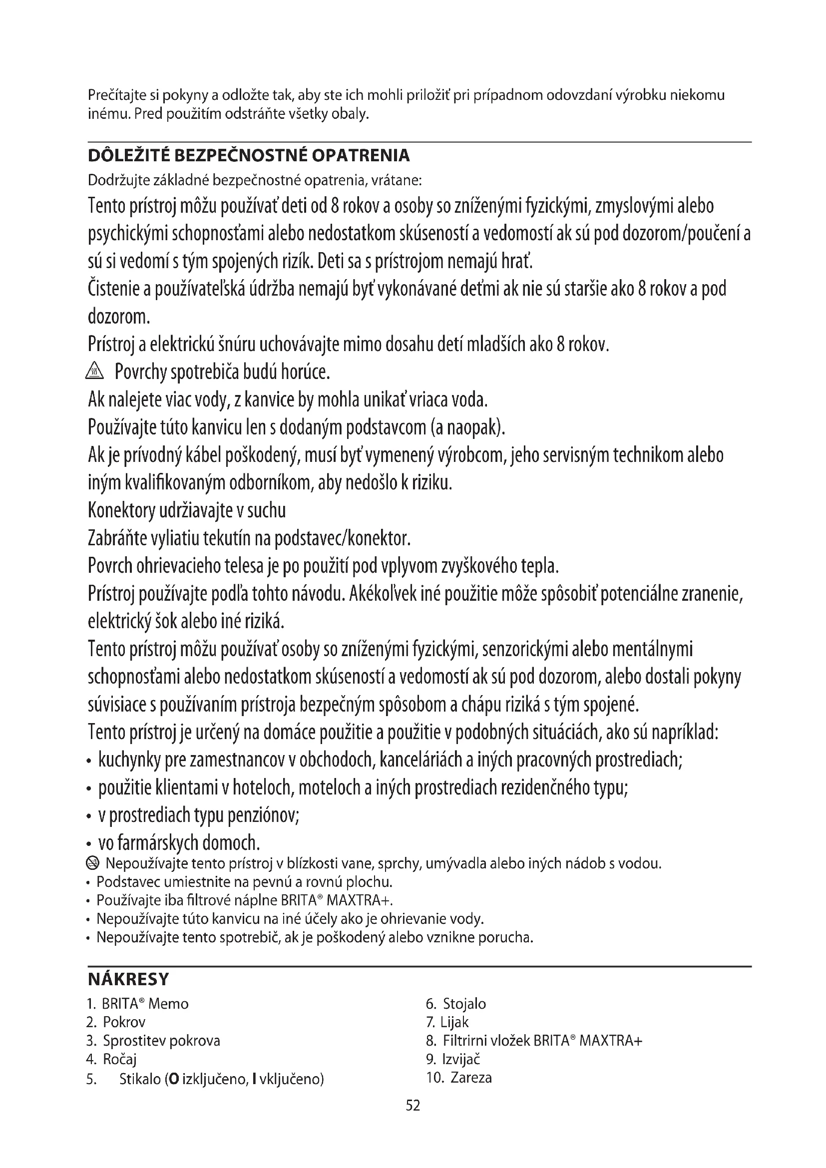Dodržujte základné bezpečnostné opatrenia, vrátane: Tento prístroj môžu používať deti od 8 rokov a osoby so zníženými fyzickými, zmyslovými alebo psychickými schopnosťami alebo nedostatkom skúseností a vedomostí ak sú pod dozorom/poučení a sú si vedomí s tým spojených rizík. Deti sa s prístrojom nemajú hrať. Čistenie a používateľská údržba nemajú byť vykonávané deťmi ak nie sú staršie ako 8 rokov a pod dozorom. Prístroj a elektrickú šnúru uchovávajte mimo dosahu detí mladších ako 8 rokov. h Povrchy spotrebiča budú horúce. Ak nalejete viac vody, z kanvice by mohla unikať vriaca voda. Používajte túto kanvicu len s dodaným podstavcom (a naopak). Ak je prívodný kábel poškodený, musí byť vymenený výrobcom, jeho servisným technikom alebo iným kvalikovaným odborníkom, aby nedošlo k riziku. Konektory udržiavajte v suchu Zabráňte vyliatiu tekutín na podstavec/konektor. Povrch ohrievacieho telesa je po použití pod vplyvom zvyškového tepla. Prístroj používajte podľa tohto návodu. Akékoľvek iné použitie môže spôsobiť potenciálne zranenie, elektrický šok alebo iné riziká. Tento prístroj môžu používať osoby so zníženými fyzickými, senzorickými alebo mentálnymi schopnosťami alebo nedostatkom skúseností a vedomostí ak sú pod dozorom, alebo dostali pokyny súvisiace s používaním prístroja bezpečným spôsobom a chápu riziká s tým spojené. Tento prístroj je určený na domáce použitie a použitie v podobných situáciách, ako sú napríklad: