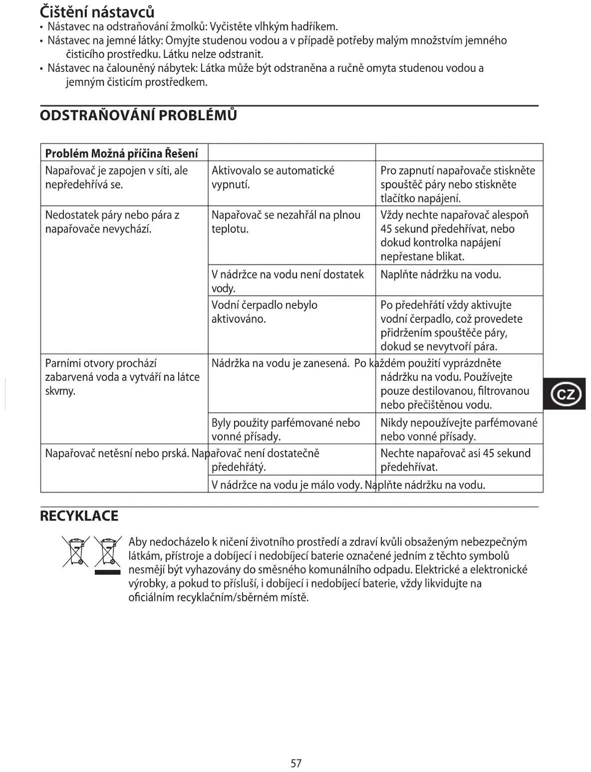 Problém Možná príčina Riešenie Naparovač je zapojený v zásuvke, ale nezohrieva sa. Aktivovalo sa automatické vypnutie. Stlačte spúšťač pary alebo stlačte vypínač, aby ste naparovač aktivovali. Z naparovača nevychádza dosť pary, alebo žiadna para. Naparovač nie je zahriaty na plnú teplotu. Vždy nechajte naparovač nahrievať aspoň 45 sekúnd, alebo dovtedy, kým svetielko vypínača prestane blikať. V nádržke na vodu nie je dostatok vody. Naplňte nádržku s vodou. Vodné čerpadlo nebolo naplnené. Po nahriatí vždy naplňte vodné čerpadlo podržaním spúšťača pary dovtedy, kým sa nevytvorí para. Cez otvory vychádza zafarbená voda a necháva na látke škvrny. Vo vodnej nádržke sa vytvorila usadenina. Vodnú nádržku vyprázdnite po každom použití. Používajte iba destilovanú, ltrovanú alebo vyčistenú vodu. Boli použité parfémované alebo voňavé prísady. Nikdy nepoužívajte parfémované alebo voňavé prísady. Naparovač tečie alebo prská vodu. Naparovač nie je dostatočne horúci. Nechajte naparovač zohrievať asi 45 sekúnd. V nádržke na vodu nie je dostatok vody. Naplňte nádržku s vodou. RECYKLÁCIA