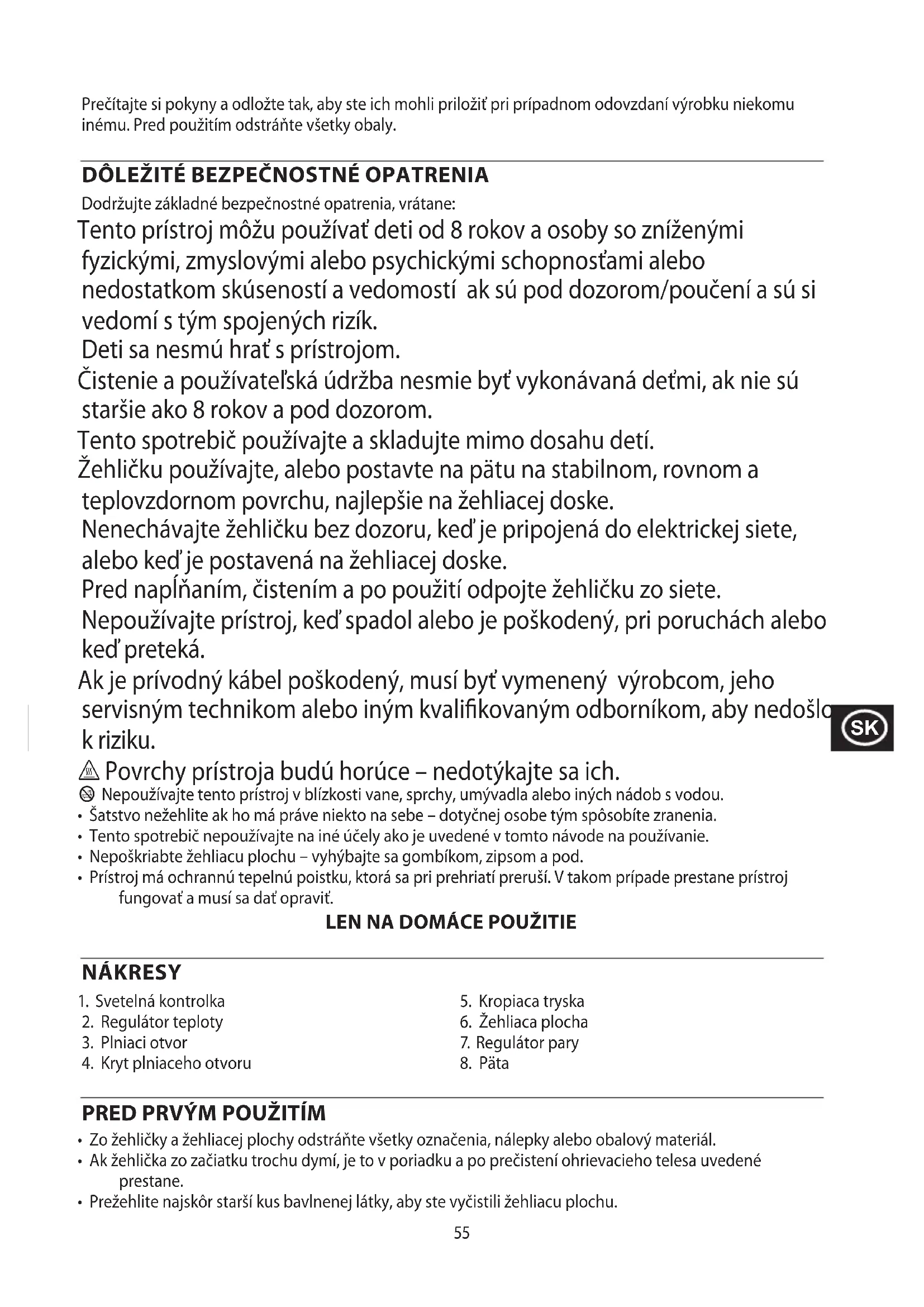 Dodržujte základné bezpečnostné opatrenia, vrátane: Tento prístroj môžu používať deti od 8 rokov a osoby so zníženými fyzickými, zmyslovými alebo psychickými schopnosťami alebo nedostatkom skúseností a vedomostí ak sú pod dozorom/poučení a sú si vedomí s tým spojených rizík. Deti sa nesmú hrať s prístrojom. Čistenie a používateľská údržba nesmie byť vykonávaná deťmi, ak nie sú staršie ako 8 rokov a pod dozorom. Tento spotrebič používajte a skladujte mimo dosahu detí. Žehličku používajte, alebo postavte na pätu na stabilnom, rovnom a teplovzdornom povrchu, najlepšie na žehliacej doske. Nenechávajte žehličku bez dozoru, keď je pripojená do elektrickej siete, alebo keď je postavená na žehliacej doske. Pred napĺňaním, čistením a po použití odpojte žehličku zo siete. Nepoužívajte prístroj, keď spadol alebo je poškodený, pri poruchách alebo keď preteká. Ak je prívodný kábel poškodený, musí byť vymenený výrobcom, jeho servisným technikom alebo iným kvalifikovaným odborníkom, aby nedošlo k riziku. h Povrchy prístroja budú horúce – nedotýkajte sa ich. b Nepoužívajte tento prístroj v blízkosti vane, sprchy, umývadla alebo iných nádob s vodou.