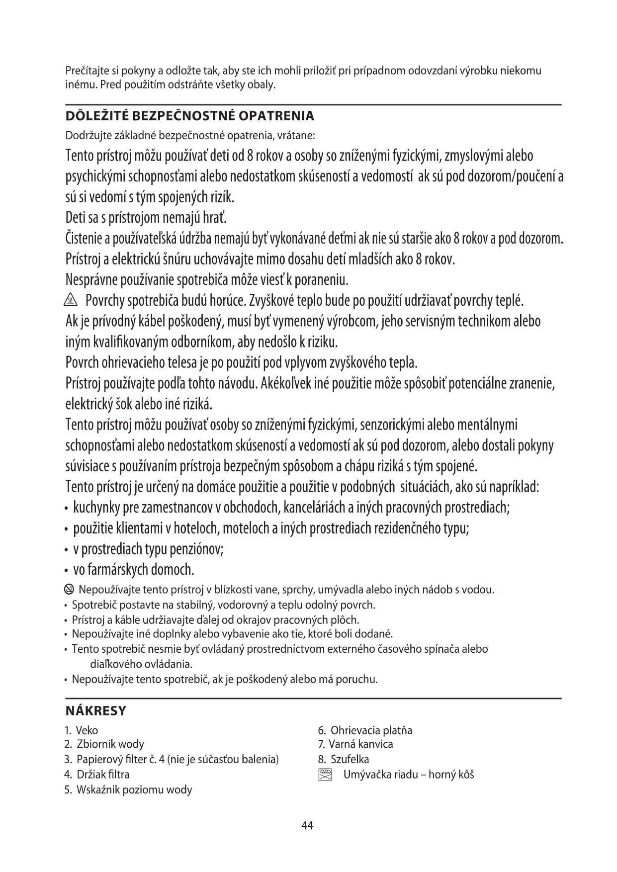 Dodržujte základné bezpečnostné opatrenia, vrátane: Tento prístroj môžu používať deti od 8 rokov a osoby so zníženými fyzickými, zmyslovými alebo psychickými schopnosťami alebo nedostatkom skúseností a vedomostí ak sú pod dozorom/poučení a sú si vedomí s tým spojených rizík. Deti sa s prístrojom nemajú hrať. Čistenie a používateľská údržba nemajú byť vykonávané deťmi ak nie sú staršie ako 8 rokov a pod dozorom. Prístroj a elektrickú šnúru uchovávajte mimo dosahu detí mladších ako 8 rokov. Nesprávne používanie spotrebiča môže viesť k poraneniu. h Povrchy spotrebiča budú horúce. Zvyškové teplo bude po použití udržiavať povrchy teplé. Ak je prívodný kábel poškodený, musí byť vymenený výrobcom, jeho servisným technikom alebo iným kvalikovaným odborníkom, aby nedošlo k riziku. Povrch ohrievacieho telesa je po použití pod vplyvom zvyškového tepla. Prístroj používajte podľa tohto návodu. Akékoľvek iné použitie môže spôsobiť potenciálne zranenie, elektrický šok alebo iné riziká. Tento prístroj môžu používať osoby so zníženými fyzickými, senzorickými alebo mentálnymi schopnosťami alebo nedostatkom skúseností a vedomostí ak sú pod dozorom, alebo dostali pokyny súvisiace s používaním prístroja bezpečným spôsobom a chápu riziká s tým spojené. Tento prístroj je určený na domáce použitie a použitie v podobných situáciách, ako sú napríklad:
