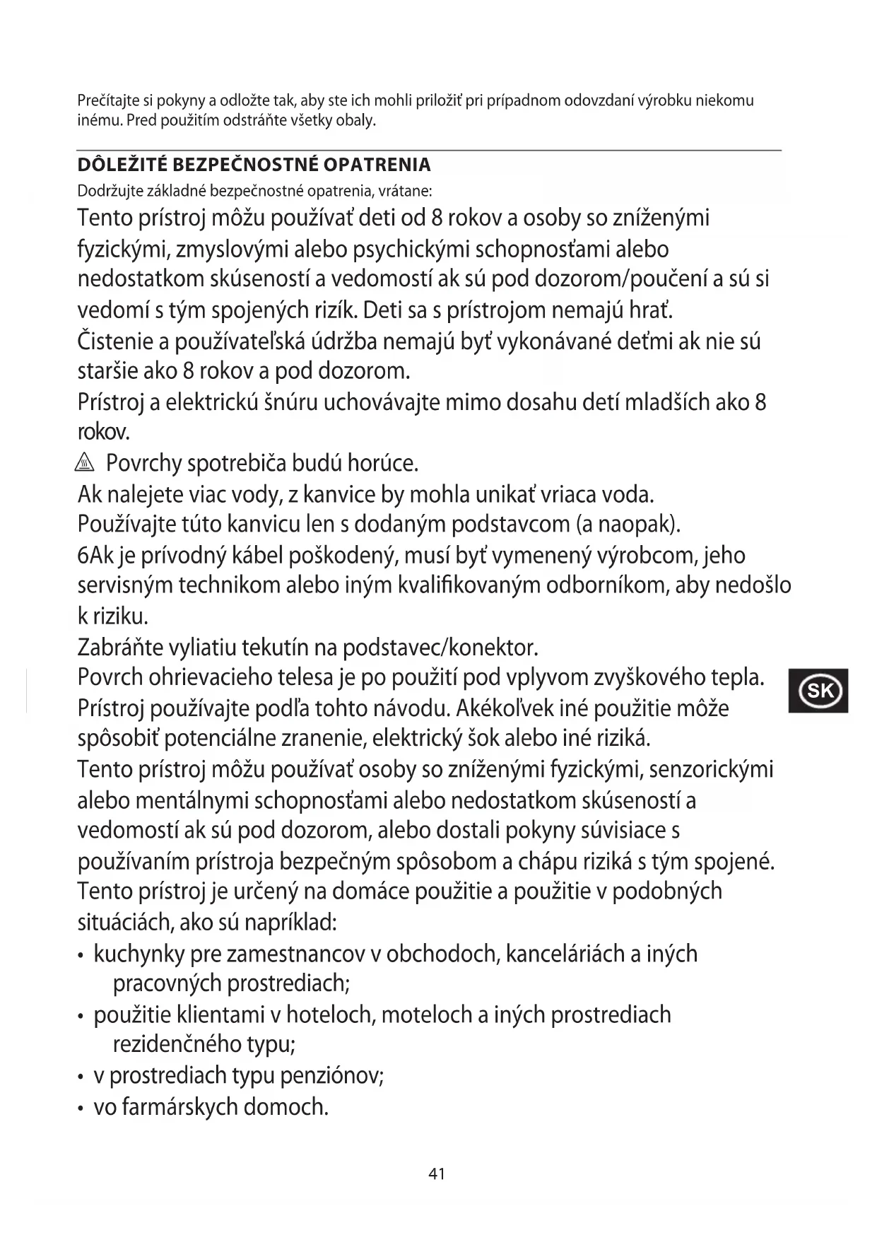 Dodržujte základné bezpečnostné opatrenia, vrátane: Tento prístroj môžu používať deti od 8 rokov a osoby so zníženými fyzickými, zmyslovými alebo psychickými schopnosťami alebo nedostatkom skúseností a vedomostí ak sú pod dozorom/poučení a sú si vedomí s tým spojených rizík. Deti sa s prístrojom nemajú hrať. Čistenie a používateľská údržba nemajú byť vykonávané deťmi ak nie sú staršie ako 8 rokov a pod dozorom. Prístroj a elektrickú šnúru uchovávajte mimo dosahu detí mladších ako 8 rokov. h Povrchy spotrebiča budú horúce. Ak nalejete viac vody, z kanvice by mohla unikať vriaca voda. Používajte túto kanvicu len s dodaným podstavcom (a naopak). 6Ak je prívodný kábel poškodený, musí byť vymenený výrobcom, jeho servisným technikom alebo iným kvalikovaným odborníkom, aby nedošlo k riziku. Zabráňte vyliatiu tekutín na podstavec/konektor. Povrch ohrievacieho telesa je po použití pod vplyvom zvyškového tepla. Prístroj používajte podľa tohto návodu. Akékoľvek iné použitie môže spôsobiť potenciálne zranenie, elektrický šok alebo iné riziká. Tento prístroj môžu používať osoby so zníženými fyzickými, senzorickými alebo mentálnymi schopnosťami alebo nedostatkom skúseností a vedomostí ak sú pod dozorom, alebo dostali pokyny súvisiace s používaním prístroja bezpečným spôsobom a chápu riziká s tým spojené. Tento prístroj je určený na domáce použitie a použitie v podobných situáciách, ako sú napríklad: