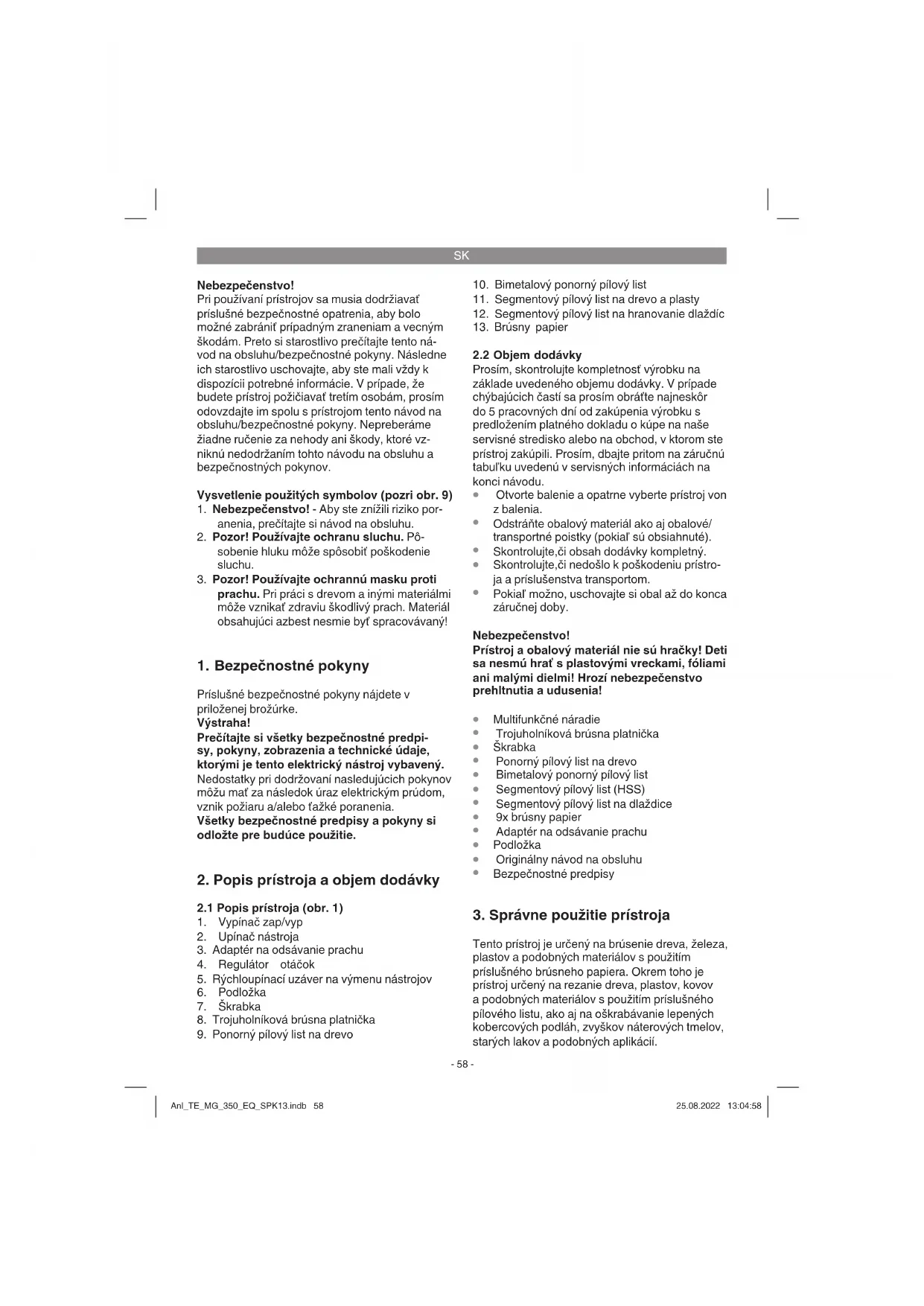 Tento prístroj je určený na brúsenie dreva, železa, plastov a podobných materiálov s použitím príslušného brúsneho papiera. Okrem toho je prístroj určený na rezanie dreva, plastov, kovov a podobných materiálov s použitím príslušného pílového listu, ako aj na oškrabávanie lepených kobercových podláh, zvyškov náterových tmelov, starých lakov a podobných aplikácií. Anl_TE_MG_350_EQ_SPK13.indb 58Anl_TE_MG_350_EQ_SPK13.indb 58 25.08.2022 13:04:5825.08.2022 13:04:58SK