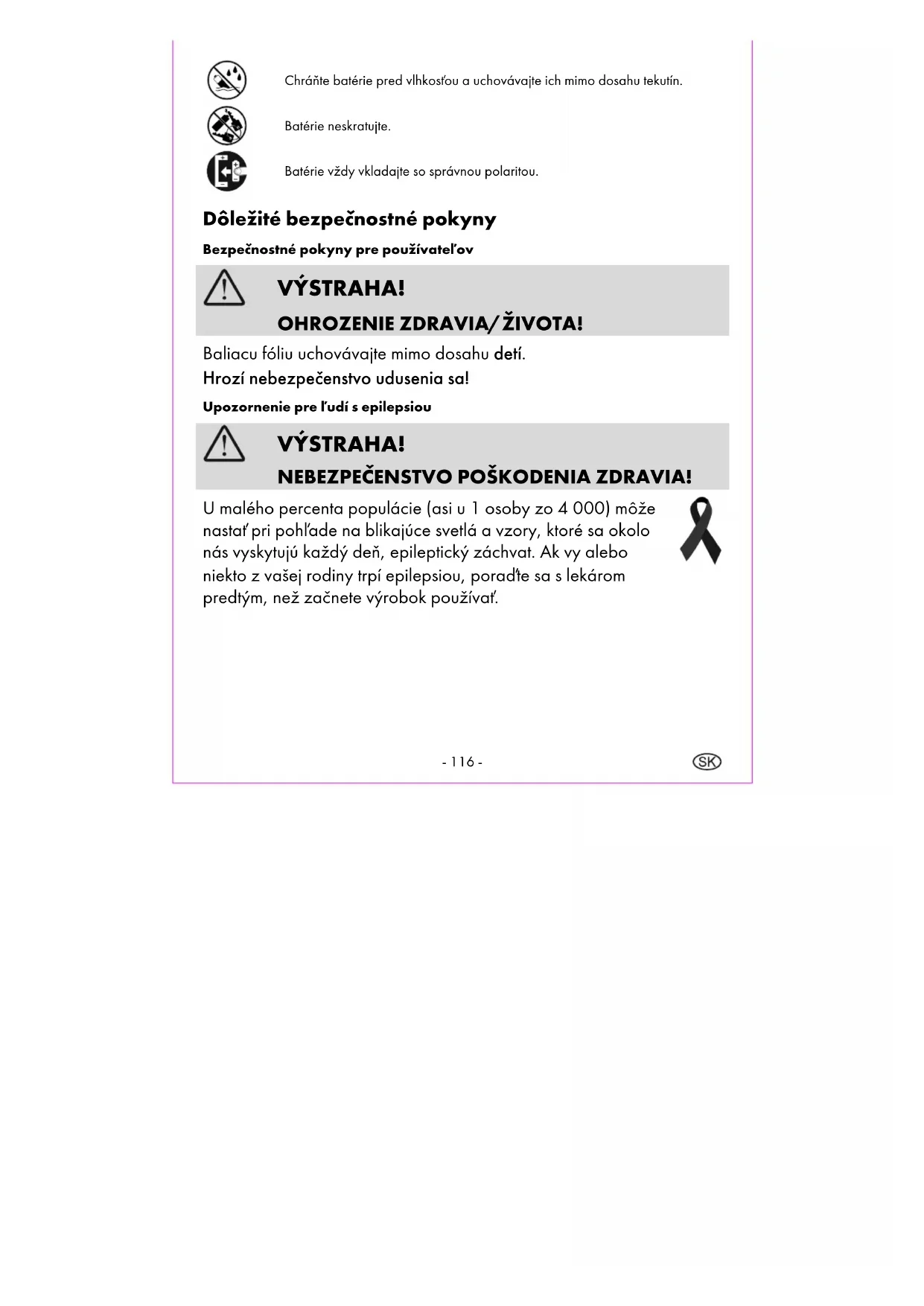U malého percenta populácie (asi u 1 osoby zo 4 000) môže nastať pri pohľade na blikajúce svetlá a vzory, ktoré sa okolo nás vyskytujú každý deň, epileptický záchvat. Ak vy alebo niekto z vašej rodiny trpí epilepsiou, poraďte sa s lekárom predtým, než začnete výrobok používať.- 117 - Bezpečnostné pokyny pre batérie