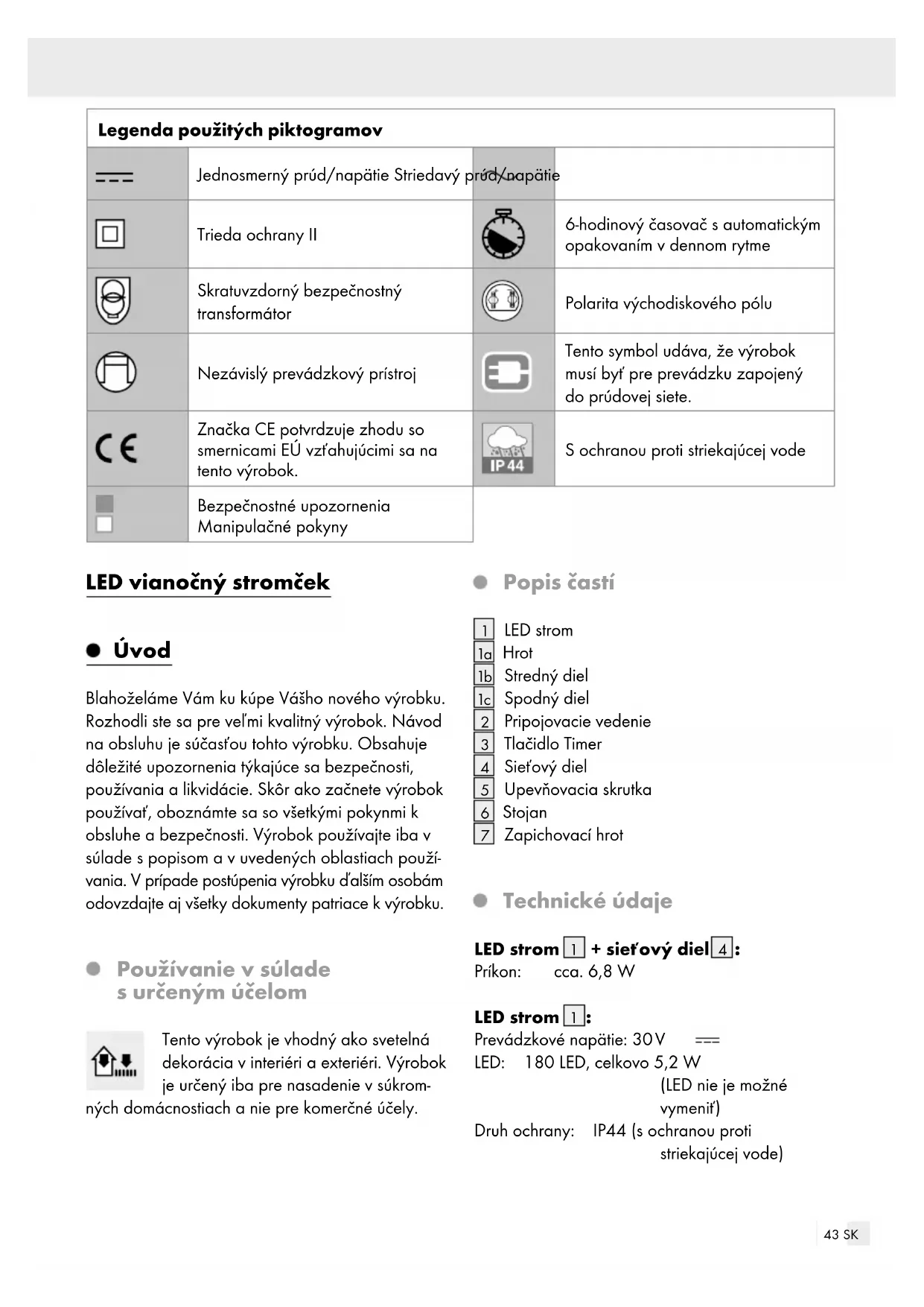 50/60Hz Prevádzkové napätie sekundárne: 30 V , 7,2 W Trieda ochrany: Druh ochrany: IP44 (s ochranou proti striekajúcej vode) Sieťový diel (Model č.: GP-SW300DC0240T-IP44(EU)) GS certifikované. SELV: Ochranné nízke napätie (Safety extra low voltage) Ta: Maximálna teplota okolia Tc: Teplota schránky na uvedenom bode Obsah dodávky 1 LED strom (1 hrot, 1 stredný diel, 1 spodný diel) 1 stojan 1 sieťový diel 3 upevňovacie skrutky 2 zapichovacie hroty 1 návod na používanie Bezpečnostné upozornenia PRED POUŽITÍM VÝROBKU SA OBOZNÁMTE SO VŠETKÝMI UPOZORNENIAMI K OBSLUHE A S BEZPEČNOSTNÝMI UPOZORNENIAMI. PRI PREDANÍ VÝROBKU TRETÍM OSOBÁM IM S NÍM ODOVZDAJTE AJ VŠETKY PODKLADY! NEBEZPE-