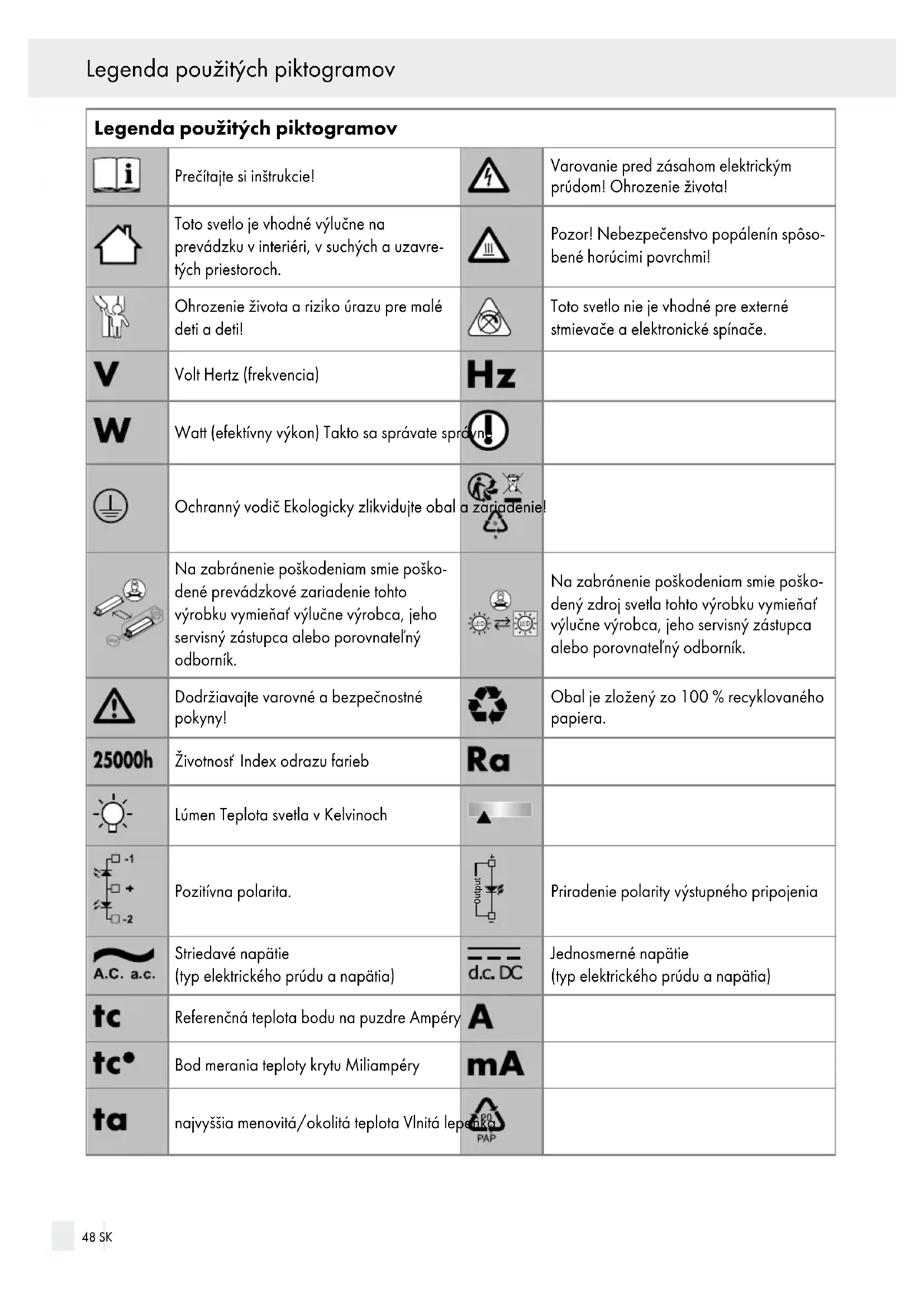 ÚRAZU PRE MALÉ I STARŠIE DETI! Nikdy nenechávajte deti bez dozoru s obalovým materiálom. Existuje nebezpečenstvo zadusenia obalovým materiálom. Deti často podceňujú nebez pečenstvo. Držte deti vždy v bezpečnej vzdialenosti od výrobku. SK 49 Úvod / Bezpečnosť■ Nenechajte svetlá alebo obalový materiál položený bez dohľadu. Plastové fólie/tašky, plastové diely atď. by mohli byť pre deti nebezpečnou hračkou. ■ Tento prístroj môžu používať deti od 8 rokov ako aj osoby so zníženými psychickými, senzorickými alebo duševnými schopnosťami alebo s nedo statkom skúseností a vedomostí, ak sú pod dozorom, alebo ak boli poučené ohľadom bezpeč ného používania prístroja, a ak porozumeli nebez pečenstvám spojeným s jeho používaním. Deti sa s prístrojom nesmú hrať. Čistenie a údržbu nesmú vykonávať deti bez dozoru. Zabráňte ohrozeniu života zásahom elektrickým prúdom ■ Elektrickú inštaláciu prenechajte kvalifikovanému elektrikárovi alebo osobe zaškolenej pre elektroin štalácie.