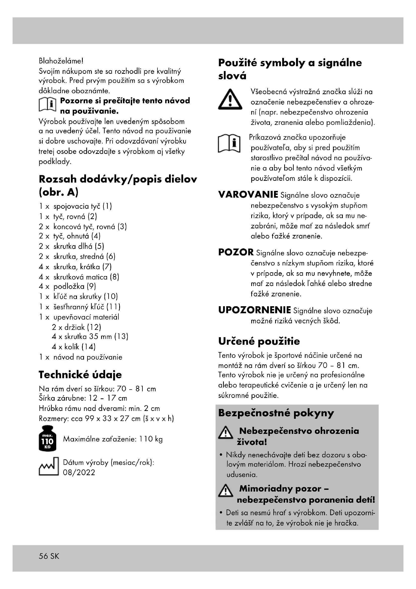 Maximálne zaťaženie: 110 kg Dátum výroby (mesiac/rok): 08/2022 Použité symboly a signálne slová Všeobecná výstražná značka slúži na označenie nebezpečenstiev a ohroze- ní (napr. nebezpečenstvo ohrozenia života, zranenia alebo pomliaždenia). Príkazová značka upozorňuje používateľa, aby si pred použitím starostlivo prečítal návod na používa- nie a aby bol tento návod všetkým používateľom stále k dispozícii. VAROVANIE Signálne slovo označuje nebezpečenstvo s vysokým stupňom rizika, ktorý v prípade, ak sa mu ne- zabráni, môže mať za následok smrť alebo ťažké zranenie. POZOR Signálne slovo označuje nebezpe- čenstvo s nízkym stupňom rizika, ktoré v prípade, ak sa mu nevyhnete, môže mať za následok ľahké alebo stredne ťažké zranenie. UPOZORNENIE Signálne slovo označuje možné riziká vecných škôd. Určené použitie Tento výrobok je športové náčinie určené na montáž na rám dverí so šírkou 70 – 81 cm. Tento výrobok nie je určený na profesionálne alebo terapeutické cvičenie a je určený len na súkromné použitie. Bezpečnostné pokyny Nebezpečenstvo ohrozenia života!