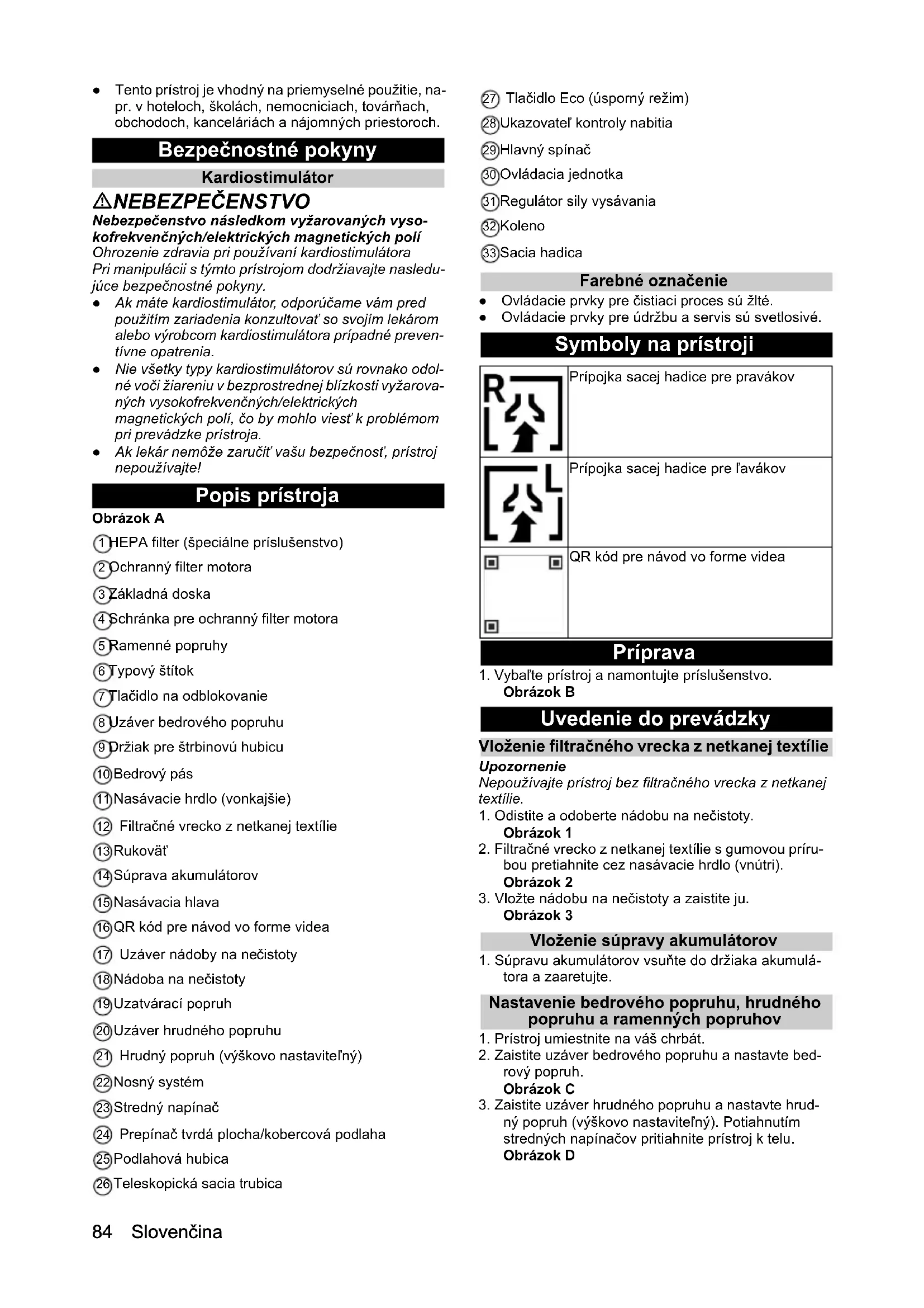 - Technické údaje Slovenčina ● Tento prístroj je vhodný na priemyselné použitie, na- pr. v hoteloch, školách, nemocniciach, továrňach, obchodoch, kanceláriách a nájomných priestoroch. Bezpečnostné pokyny Kardiostimulátor NEBEZPEČENSTVO Nebezpečenstvo následkom vyžarovaných vyso- kofrekvenčných/elektrických magnetických polí Ohrozenie zdravia pri používaní kardiostimulátora Pri manipulácii s týmto prístrojom dodržiavajte nasledu- júce bezpečnostné pokyny. ● Ak máte kardiostimulátor, odporúčame vám pred použitím zariadenia konzultovať so svojím lekárom alebo výrobcom kardiostimulátora prípadné preven- tívne opatrenia. ● Nie všetky typy kardiostimulátorov sú rovnako odol- né voči žiareniu v bezprostrednej blízkosti vyžarova- ných vysokofrekvenčných/elektrických magnetických polí, čo by mohlo viesť k problémom pri prevádzke prístroja. ● Ak lekár nemôže zaručiť vašu bezpečnosť, prístroj nepoužívajte! Popis prístroja Obrázok A 1 HEPA filter (špeciálne príslušenstvo) 2 Ochranný filter motora 3 Základná doska 4 Schránka pre ochranný filter motora 5 Ramenné popruhy 6 Typový štítok 7 Tlačidlo na odblokovanie 8 Uzáver bedrového popruhu 9 Držiak pre štrbinovú hubicu 10 Bedrový pás 11 Nasávacie hrdlo (vonkajšie) 12 Filtračné vrecko z netkanej textílie 13 Rukoväť 14 Súprava akumulátorov 15 Nasávacia hlava 16 QR kód pre návod vo forme videa 17 Uzáver nádoby na nečistoty 18 Nádoba na nečistoty 19 Uzatvárací popruh 20 Uzáver hrudného popruhu 21 Hrudný popruh (výškovo nastaviteľný) 22 Nosný systém 23 Stredný napínač 24 Prepínač tvrdá plocha/kobercová podlaha 25 Podlahová hubica 26 Teleskopická sacia trubica 27 Tlačidlo Eco (úsporný režim) 28 Ukazovateľ kontroly nabitia 29 Hlavný spínač 30 Ovládacia jednotka 31 Regulátor sily vysávania 32 Koleno 33 Sacia hadica Farebné označenie ● Ovládacie prvky pre čistiaci proces sú žlté. ● Ovládacie prvky pre údržbu a servis sú svetlosivé. Symboly na prístroji Príprava p. 8784