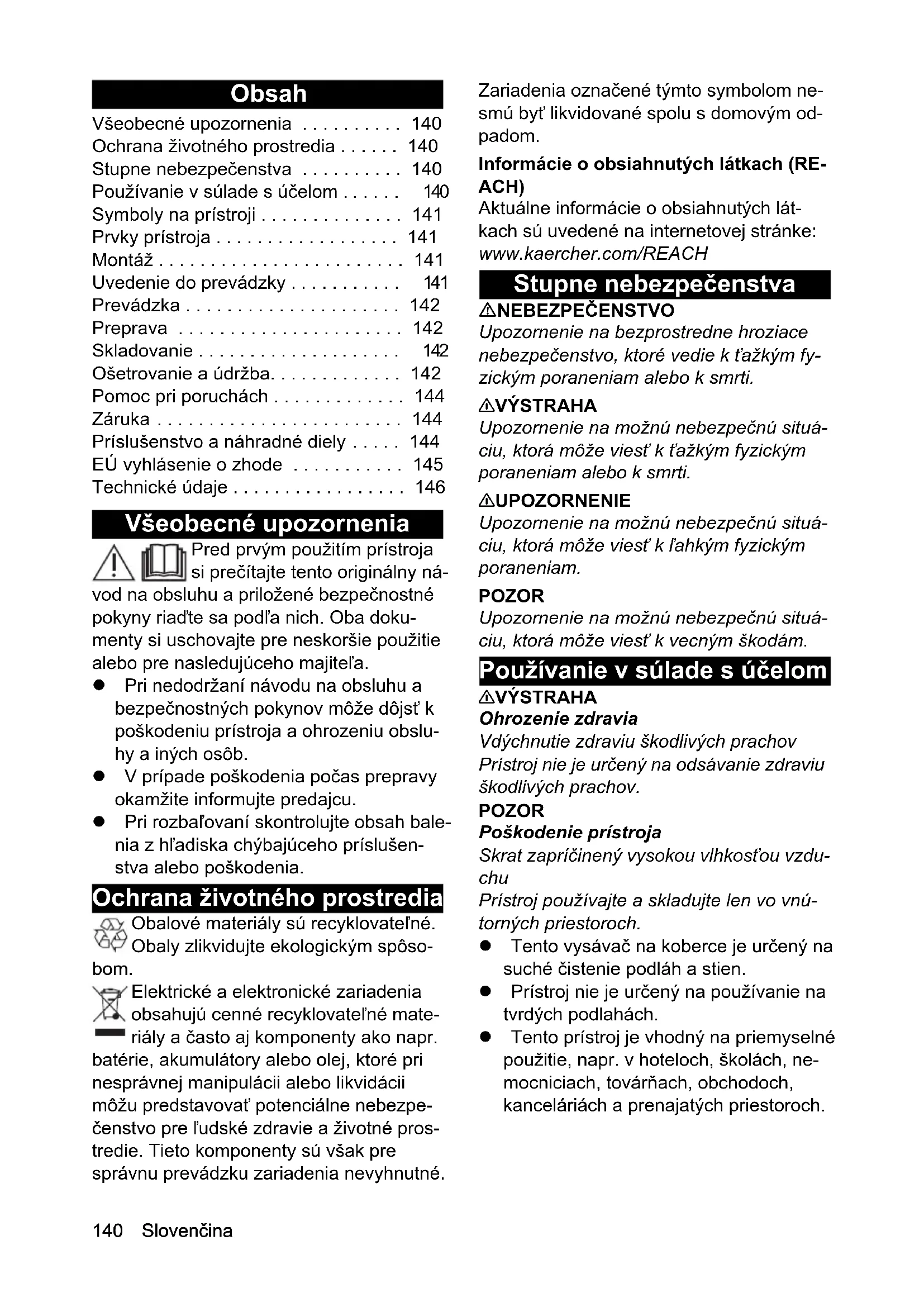 - H05VV-F 2x1,0 H05VV-F 2x1,0 Număr piesă (EU/GB) 6.650-913.0 6.650-913.0 Lungime cablu m 0,1 0,1140 Slovenčina Obsah Všeobecné upozornenia Pred prvým použitím prístroja si prečítajte tento originálny ná- vod na obsluhu a priložené bezpečnostné pokyny riaďte sa podľa nich. Oba doku- menty si uschovajte pre neskoršie použitie alebo pre nasledujúceho majiteľa. Pri nedodržaní návodu na obsluhu a bezpečnostných pokynov môže dôjsť k poškodeniu prístroja a ohrozeniu obslu- hy a iných osôb. V prípade poškodenia počas prepravy okamžite informujte predajcu. Pri rozbaľovaní skontrolujte obsah bale- nia z hľadiska chýbajúceho príslušen- stva alebo poškodenia. Ochrana životného prostredia Obalové materiály sú recyklovateľné. Obaly zlikvidujte ekologickým spôso- bom. Elektrické a elektronické zariadenia obsahujú cenné recyklovateľné mate- riály a často aj komponenty ako napr. batérie, akumulátory alebo olej, ktoré pri nesprávnej manipulácii alebo likvidácii môžu predstavovať potenciálne nebezpe- čenstvo pre ľudské zdravie a životné pros- tredie. Tieto komponenty sú však pre správnu prevádzku zariadenia nevyhnutné. Zariadenia označené týmto symbolom ne- smú byť likvidované spolu s domovým od- padom. Informácie o obsiahnutých látkach (RE- ACH) Aktuálne informácie o obsiahnutých lát- kach sú uvedené na internetovej stránke: www.kaercher.com/REACH Stupne nebezpečenstva NEBEZPEČENSTVO Upozornenie na bezprostredne hroziace nebezpečenstvo, ktoré vedie k ťažkým fy- zickým poraneniam alebo k smrti. 몇 VÝSTRAHA Upozornenie na možnú nebezpečnú situá- ciu, ktorá môže viesť k ťažkým fyzickým poraneniam alebo k smrti. 몇 UPOZORNENIE Upozornenie na možnú nebezpečnú situá- ciu, ktorá môže viesť k ľahkým fyzickým poraneniam. POZOR Upozornenie na možnú nebezpečnú situá- ciu, ktorá môže viesť k vecným škodám. Používanie v súlade s účelom 몇 VÝSTRAHA Ohrozenie zdravia Vdýchnutie zdraviu škodlivých prachov Prístroj nie je určený na odsávanie zdraviu škodlivých prachov. POZOR Poškodenie prístroja Skrat zapríčinený vysokou vlhkosťou vzdu- chu Prístroj používajte a skladujte len vo vnú- torných priestoroch. Tento vysávač na koberce je určený na suché čistenie podláh a stien. Prístroj nie je určený na používanie na tvrdých podlahách. Tento prístroj je vhodný na priemyselné použitie, napr. v hoteloch, školách, ne- mocniciach, továrňach, obchodoch, kanceláriách a prenajatých priestoroch. Všeobecné upozornenia p. 140