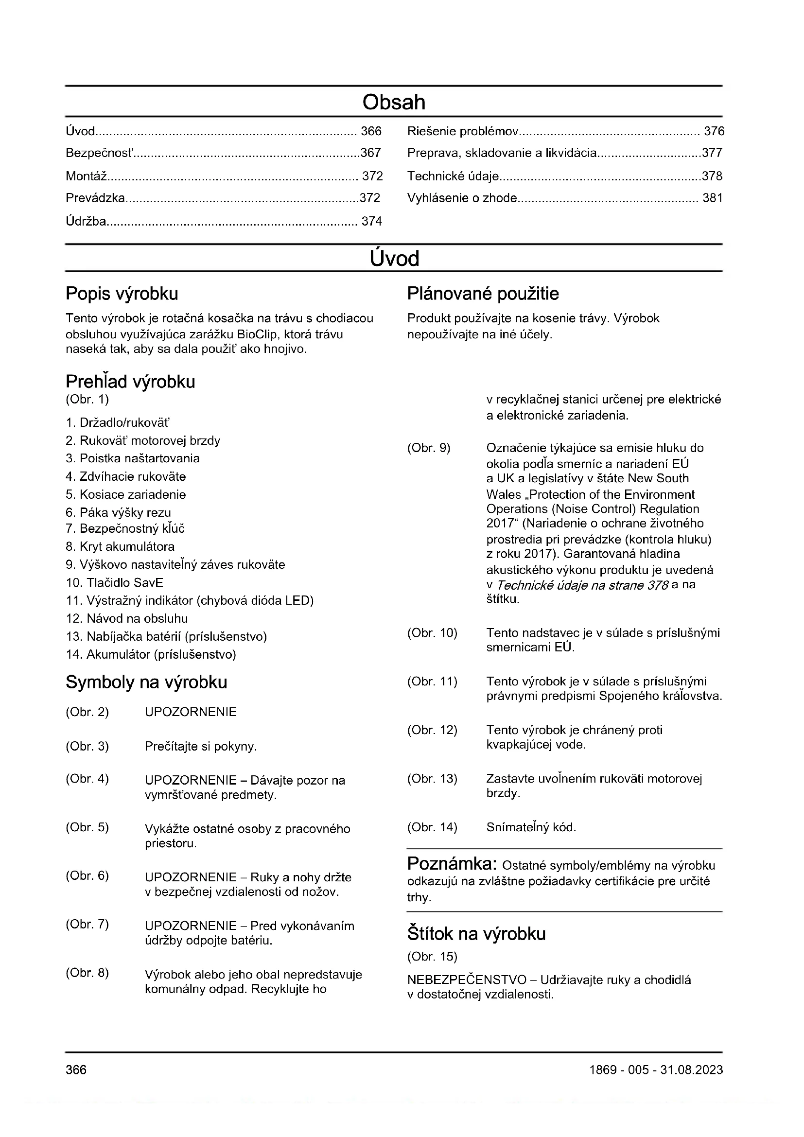 Symboly na výrobku (Obr. 2) UPOZORNENIE (Obr. 3) Prečítajte si pokyny. (Obr. 4) UPOZORNENIE – Dávajte pozor na vymršťované predmety. (Obr. 5) Vykážte ostatné osoby zpracovného priestoru. (Obr. 6) UPOZORNENIE – Ruky anohy držte vbezpečnej vzdialenosti od nožov. (Obr. 7) UPOZORNENIE – Pred vykonávaním údržby odpojte batériu. (Obr. 8) Výrobok alebo jeho obal nepredstavuje komunálny odpad. Recyklujte ho vrecyklačnej stanici určenej pre elektrické aelektronické zariadenia. (Obr. 9) Označenie týkajúce sa emisie hluku do okolia podľa smerníc anariadení EÚ a UK alegislatívy vštáte New South Wales „Protection of the Environment Operations (Noise Control) Regulation 2017“ (Nariadenie oochrane životného prostredia pri prevádzke (kontrola hluku) zroku 2017). Garantovaná hladina akustického výkonu produktu je uvedená