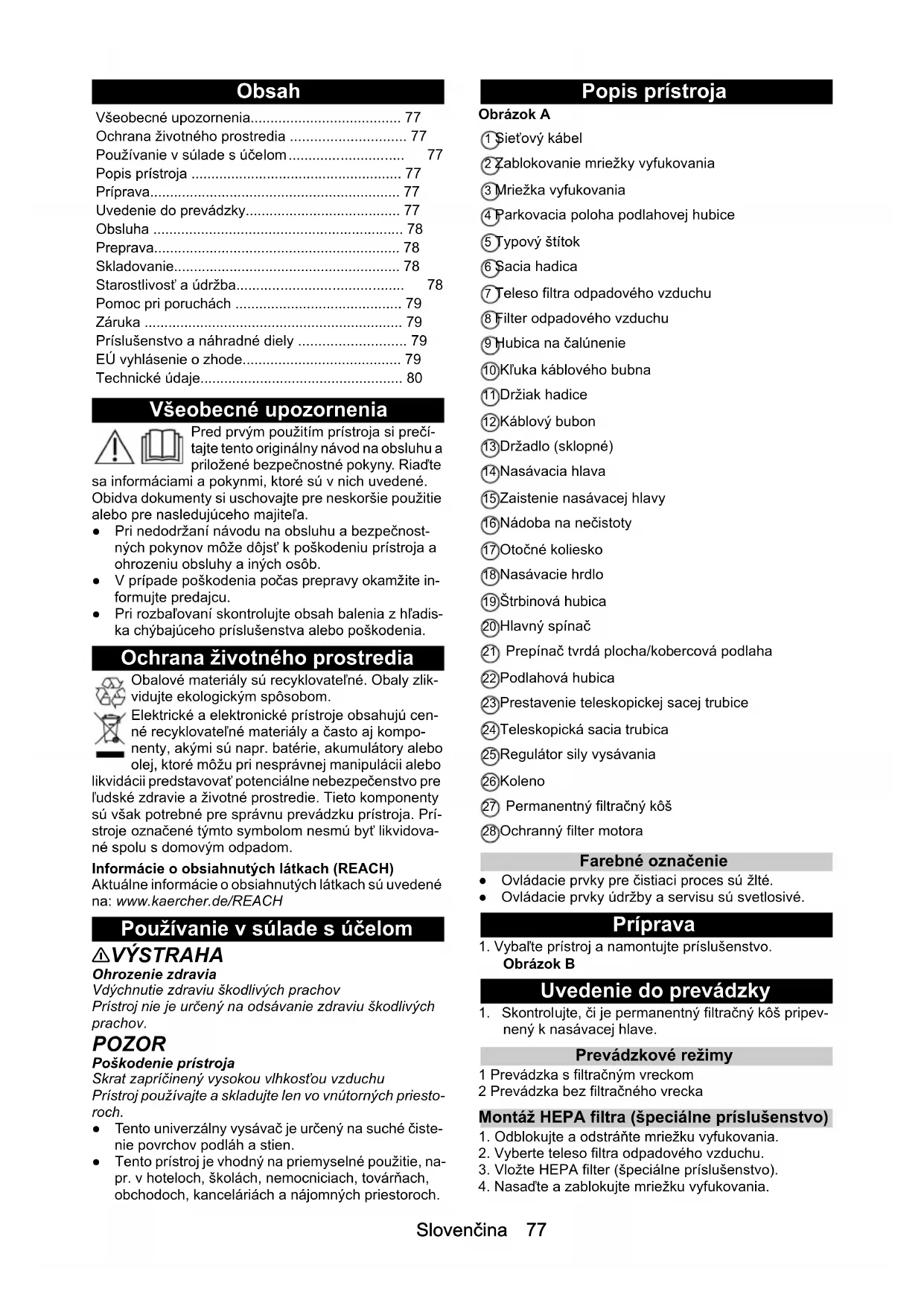H05VV 2x1,0 GF H05VV 2x1,0 GF Objednací číslo (EU) 6.650-915.0 6.650-915.0 Objednací číslo (GB) 6.652-282.0 6.652-282.0 Objednací číslo (CH) 6.652-281.0 6.652-281.0 Délka kabelu m 12 12Slovenčina 77 Obsah Všeobecné upozornenia Pred prvým použitím prístroja si prečí- tajte tento originálny návod na obsluhu a priložené bezpečnostné pokyny. Riaďte sa informáciami a pokynmi, ktoré sú v nich uvedené. Obidva dokumenty si uschovajte pre neskoršie použitie alebo pre nasledujúceho majiteľa. ● Pri nedodržaní návodu na obsluhu a bezpečnost- ných pokynov môže dôjsť k poškodeniu prístroja a ohrozeniu obsluhy a iných osôb. ● V prípade poškodenia počas prepravy okamžite in- formujte predajcu. ● Pri rozbaľovaní skontrolujte obsah balenia z hľadis- ka chýbajúceho príslušenstva alebo poškodenia. Ochrana životného prostredia Obalové materiály sú recyklovateľné. Obaly zlik- vidujte ekologickým spôsobom. Elektrické a elektronické prístroje obsahujú cen- né recyklovateľné materiály a často aj kompo- nenty, akými sú napr. batérie, akumulátory alebo olej, ktoré môžu pri nesprávnej manipulácii alebo likvidácii predstavovať potenciálne nebezpečenstvo pre ľudské zdravie a životné prostredie. Tieto komponenty sú však potrebné pre správnu prevádzku prístroja. Prí- stroje označené týmto symbolom nesmú byť likvidova- né spolu s domovým odpadom. Informácie o obsiahnutých látkach (REACH) Aktuálne informácie o obsiahnutých látkach sú uvedené na: www.kaercher.de/REACH Používanie v súlade s účelom 몇 VÝSTRAHA Ohrozenie zdravia Vdýchnutie zdraviu škodlivých prachov Prístroj nie je určený na odsávanie zdraviu škodlivých prachov. POZOR Poškodenie prístroja Skrat zapríčinený vysokou vlhkosťou vzduchu Prístroj používajte a skladujte len vo vnútorných priesto- roch. ● Tento univerzálny vysávač je určený na suché čiste- nie povrchov podláh a stien. ● Tento prístroj je vhodný na priemyselné použitie, na- pr. v hoteloch, školách, nemocniciach, továrňach, obchodoch, kanceláriách a nájomných priestoroch. Popis prístroja Obrázok A 1 Sieťový kábel 2 Zablokovanie mriežky vyfukovania 3 Mriežka vyfukovania 4 Parkovacia poloha podlahovej hubice 5 Typový štítok 6 Sacia hadica 7 Teleso filtra odpadového vzduchu 8 Filter odpadového vzduchu 9 Hubica na čalúnenie 10 Kľuka káblového bubna 11 Držiak hadice 12 Káblový bubon 13 Držadlo (sklopné) 14 Nasávacia hlava 15 Zaistenie nasávacej hlavy 16 Nádoba na nečistoty 17 Otočné koliesko 18 Nasávacie hrdlo 19 Štrbinová hubica 20 Hlavný spínač 21 Prepínač tvrdá plocha/kobercová podlaha 22 Podlahová hubica 23 Prestavenie teleskopickej sacej trubice 24 Teleskopická sacia trubica 25 Regulátor sily vysávania 26 Koleno 27 Permanentný filtračný kôš 28 Ochranný filter motora Farebné označenie ● Ovládacie prvky pre čistiaci proces sú žlté. ● Ovládacie prvky údržby a servisu sú svetlosivé. Príprava