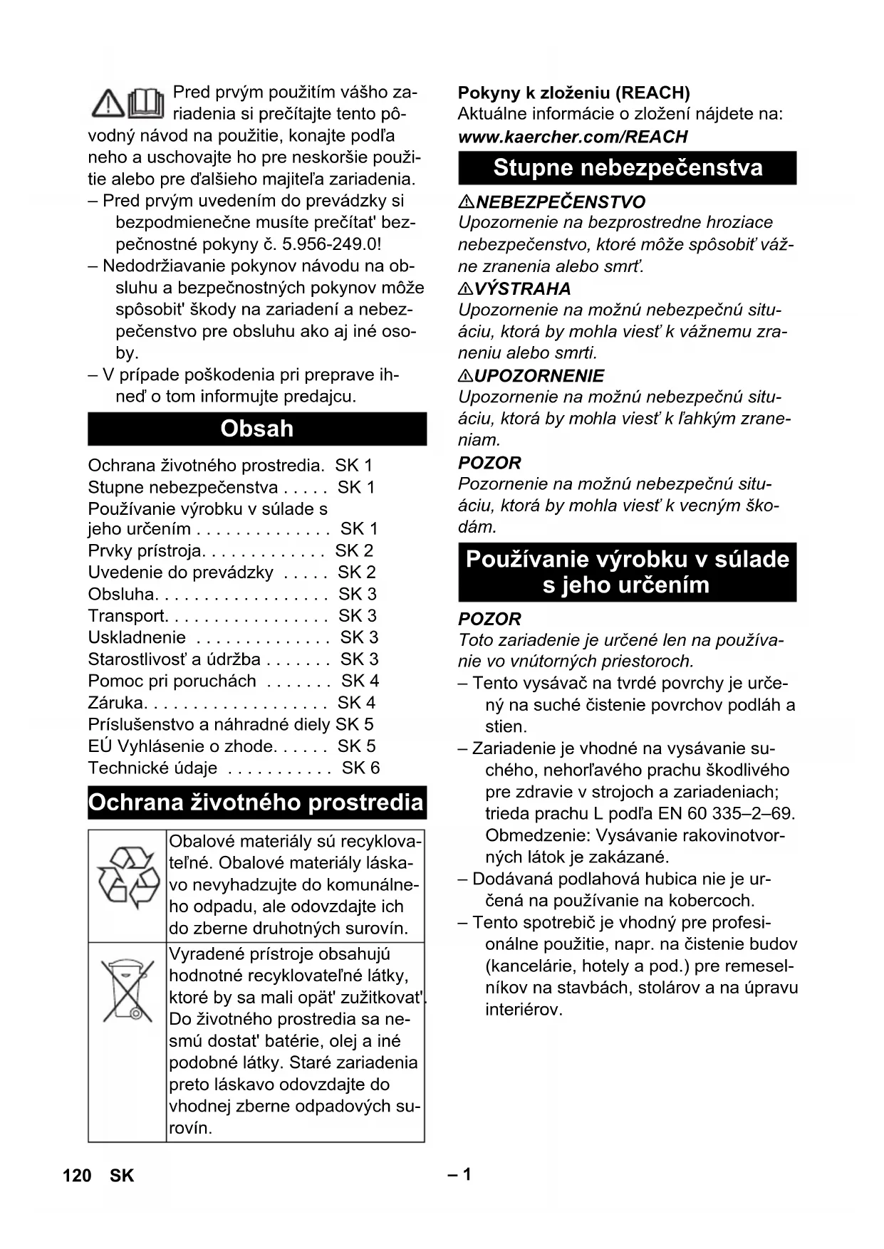 Nr. piesă Lungimea cablului CH 6.650-837.0 7,5 m 119RO– 1 Pred prvým použitím vášho za- riadenia si prečítajte tento pô- vodný návod na použitie, konajte podľa neho a uschovajte ho pre neskoršie použi- tie alebo pre ďalšieho majiteľa zariadenia. – Pred prvým uvedením do prevádzky si bezpodmienečne musíte prečítat' bez- pečnostné pokyny č. 5.956-249.0! – Nedodržiavanie pokynov návodu na ob- sluhu a bezpečnostných pokynov môže spôsobit' škody na zariadení a nebez- pečenstvo pre obsluhu ako aj iné oso- by. – V prípade poškodenia pri preprave ih- neď o tom informujte predajcu. Pokyny k zloženiu (REACH) Aktuálne informácie o zložení nájdete na: www.kaercher.com/REACH NEBEZPEČENSTVO Upozornenie na bezprostredne hroziace nebezpečenstvo, ktoré môže spôsobiť váž- ne zranenia alebo smrť. 몇 VÝSTRAHA Upozornenie na možnú nebezpečnú situ- áciu, ktorá by mohla viesť k vážnemu zra- neniu alebo smrti. 몇 UPOZORNENIE Upozornenie na možnú nebezpečnú situ- áciu, ktorá by mohla viesť k ľahkým zrane- niam. POZOR Pozornenie na možnú nebezpečnú situ- áciu, ktorá by mohla viesť k vecným ško- dám. POZOR Toto zariadenie je určené len na používa- nie vo vnútorných priestoroch. – Tento vysávač na tvrdé povrchy je urče- ný na suché čistenie povrchov podláh a stien. – Zariadenie je vhodné na vysávanie su- chého, nehorľavého prachu škodlivého pre zdravie v strojoch a zariadeniach; trieda prachu L podľa EN 60 335–2–69. Obmedzenie: Vysávanie rakovinotvor- ných látok je zakázané. – Dodávaná podlahová hubica nie je ur- čená na používanie na kobercoch. – Tento spotrebič je vhodný pre profesi- onálne použitie, napr. na čistenie budov (kancelárie, hotely a pod.) pre remesel- níkov na stavbách, stolárov a na úpravu interiérov. Obsah Ochrana životného prostredia. SK 1 Stupne nebezpečenstva . . . . . SK 1 Používanie výrobku v súlade s jeho určením . . . . . . . . . . . . . . SK 1 Prvky prístroja. . . . . . . . . . . . . SK 2 Uvedenie do prevádzky . . . . . SK 2 Obsluha. . . . . . . . . . . . . . . . . . SK 3 Transport. . . . . . . . . . . . . . . . . SK 3 Uskladnenie . . . . . . . . . . . . . . SK 3 Starostlivosť a údržba . . . . . . . SK 3 Pomoc pri poruchách . . . . . . . SK 4 Záruka. . . . . . . . . . . . . . . . . . . SK 4 Príslušenstvo a náhradné diely SK 5 EÚ Vyhlásenie o zhode. . . . . . SK 5 Technické údaje . . . . . . . . . . . SK 6 Ochrana životného prostredia Obalové materiály sú recyklova- teľné. Obalové materiály láska- vo nevyhadzujte do komunálne- ho odpadu, ale odovzdajte ich do zberne druhotných surovín. Vyradené prístroje obsahujú hodnotné recyklovateľné látky, ktoré by sa mali opät' zužitkovat'. Do životného prostredia sa ne- smú dostat' batérie, olej a iné podobné látky. Staré zariadenia preto láskavo odovzdajte do vhodnej zberne odpadových su- rovín. Stupne nebezpečenstva Používanie výrobku v súlade s jeho určením 120 SK– 2 1 Tkaninová filtračná vložka 2Sacie hrdlo 3 Sacia hadica 4 Nosný popruh 5 Držiak hadice 6 Rukovät' na prenášanie 7 Upevňovacie oká pre nosný popruh 8 Siet'ový kábel 9 Vysávacia hlava 10 Uzáver vysávacej hlavy 11 Nádrž na nečistoty 12 Hlavný vypínač 13 Podlahová hubica 14 Vysávacia rúra 15 Držiak na nasávaciu rúrku 16 Držiak káblov 17 Výrobný štítok 18 Koleno 19 Hlavný filtračný kôš 20 Ochranný filter motora NEBEZPEČENSTVO – Ak sa vyfukovaný vzduch vedie späť do miestnosti, musí byť v miestnosti za- bezpečený dostatočný koeficient výme- ny vzduchu L. Aby mohli byť dodržané požadované medzné hodnoty, objemo- vý prietok spätne privádzaného vzdu- chu môže byť najviac 50 % objemové- ho prietoku čerstvého vzduchu (objem miestnosti V