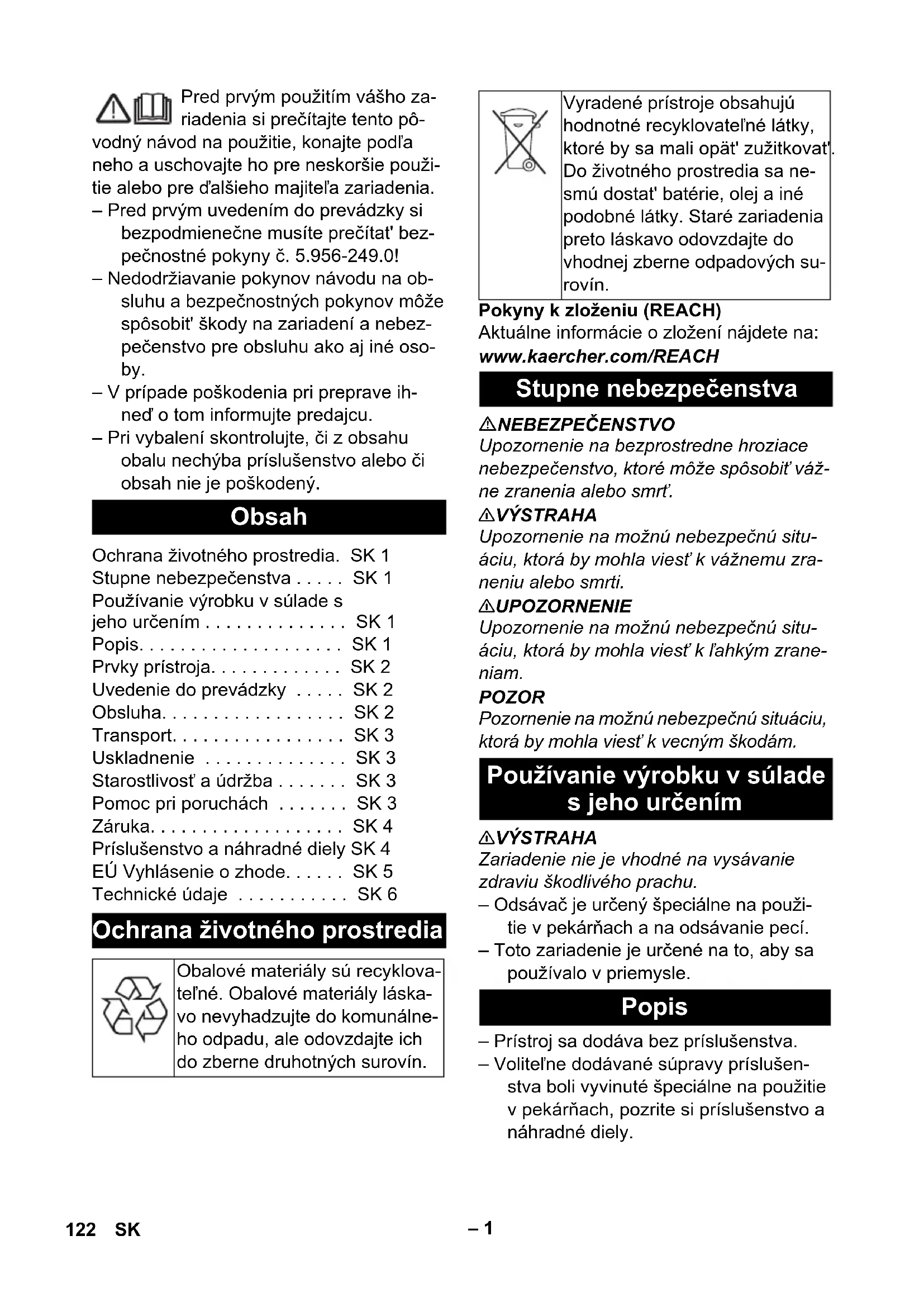 Nr. piesă Lungimea ca- blului EU 6.650-591.0 7,5 m 121RO– 1 Pred prvým použitím vášho za- riadenia si prečítajte tento pô- vodný návod na použitie, konajte podľa neho a uschovajte ho pre neskoršie použi- tie alebo pre ďalšieho majiteľa zariadenia. – Pred prvým uvedením do prevádzky si bezpodmienečne musíte prečítat' bez- pečnostné pokyny č. 5.956-249.0! – Nedodržiavanie pokynov návodu na ob- sluhu a bezpečnostných pokynov môže spôsobit' škody na zariadení a nebez- pečenstvo pre obsluhu ako aj iné oso- by. – V prípade poškodenia pri preprave ih- neď o tom informujte predajcu. – Pri vybalení skontrolujte, či z obsahu obalu nechýba príslušenstvo alebo či obsah nie je poškodený. Pokyny k zloženiu (REACH) Aktuálne informácie o zložení nájdete na: www.kaercher.com/REACH NEBEZPEČENSTVO Upozornenie na bezprostredne hroziace nebezpečenstvo, ktoré môže spôsobiť váž- ne zranenia alebo smrť. 몇 VÝSTRAHA Upozornenie na možnú nebezpečnú situ- áciu, ktorá by mohla viesť k vážnemu zra- neniu alebo smrti. 몇 UPOZORNENIE Upozornenie na možnú nebezpečnú situ- áciu, ktorá by mohla viesť k ľahkým zrane- niam. POZOR Pozornenie na možnú nebezpečnú situáciu, ktorá by mohla viesť k vecným škodám. 몇 VÝSTRAHA Zariadenie nie je vhodné na vysávanie zdraviu škodlivého prachu. – Odsávač je určený špeciálne na použi- tie v pekárňach a na odsávanie pecí. – Toto zariadenie je určené na to, aby sa používalo v priemysle. – Prístroj sa dodáva bez príslušenstva. – Voliteľne dodávané súpravy príslušen- stva boli vyvinuté špeciálne na použitie v pekárňach, pozrite si príslušenstvo a náhradné diely. Obsah Ochrana životného prostredia. SK 1 Stupne nebezpečenstva . . . . . SK 1 Používanie výrobku v súlade s jeho určením . . . . . . . . . . . . . . SK 1 Popis. . . . . . . . . . . . . . . . . . . . SK 1 Prvky prístroja. . . . . . . . . . . . . SK 2 Uvedenie do prevádzky . . . . . SK 2 Obsluha. . . . . . . . . . . . . . . . . . SK 2 Transport. . . . . . . . . . . . . . . . . SK 3 Uskladnenie . . . . . . . . . . . . . . SK 3 Starostlivosť a údržba . . . . . . . SK 3 Pomoc pri poruchách . . . . . . . SK 3 Záruka. . . . . . . . . . . . . . . . . . . SK 4 Príslušenstvo a náhradné diely SK 4 EÚ Vyhlásenie o zhode. . . . . . SK 5 Technické údaje . . . . . . . . . . . SK 6 Ochrana životného prostredia Obalové materiály sú recyklova- teľné. Obalové materiály láska- vo nevyhadzujte do komunálne- ho odpadu, ale odovzdajte ich do zberne druhotných surovín. Vyradené prístroje obsahujú hodnotné recyklovateľné látky, ktoré by sa mali opät' zužitkovat'. Do životného prostredia sa ne- smú dostat' batérie, olej a iné podobné látky. Staré zariadenia preto láskavo odovzdajte do vhodnej zberne odpadových su- rovín. Stupne nebezpečenstva Používanie výrobku v súlade s jeho určením Popis 122 SK– 2 1 Elektródy 2 Držiak na nasávaciu rúrku 3 Posuvná rukoväť 4 Hák na hadicu 5 Výstup vzduchu, pracovný vzduch 6 Vysávacia hlava 7 Uzáver vysávacej hlavy 8 Žliabok držiaka 9 Nádrž na nečistoty 10 Otočné koleso 11 Rukovät' 12 Vstup vzduchu, chladiaci vzduch motora 13 Sacie hrdlo 14 Doraz pre kufrík s náradím 15 Upevňovacie oko 16 Kryt filtra 17 Rukovät' na prenášanie 18 otočný spínač 19 Držiak pre podlahovú dýzu alebo dýzu pece 20 Upevňovacia skrutka posuvného rame-