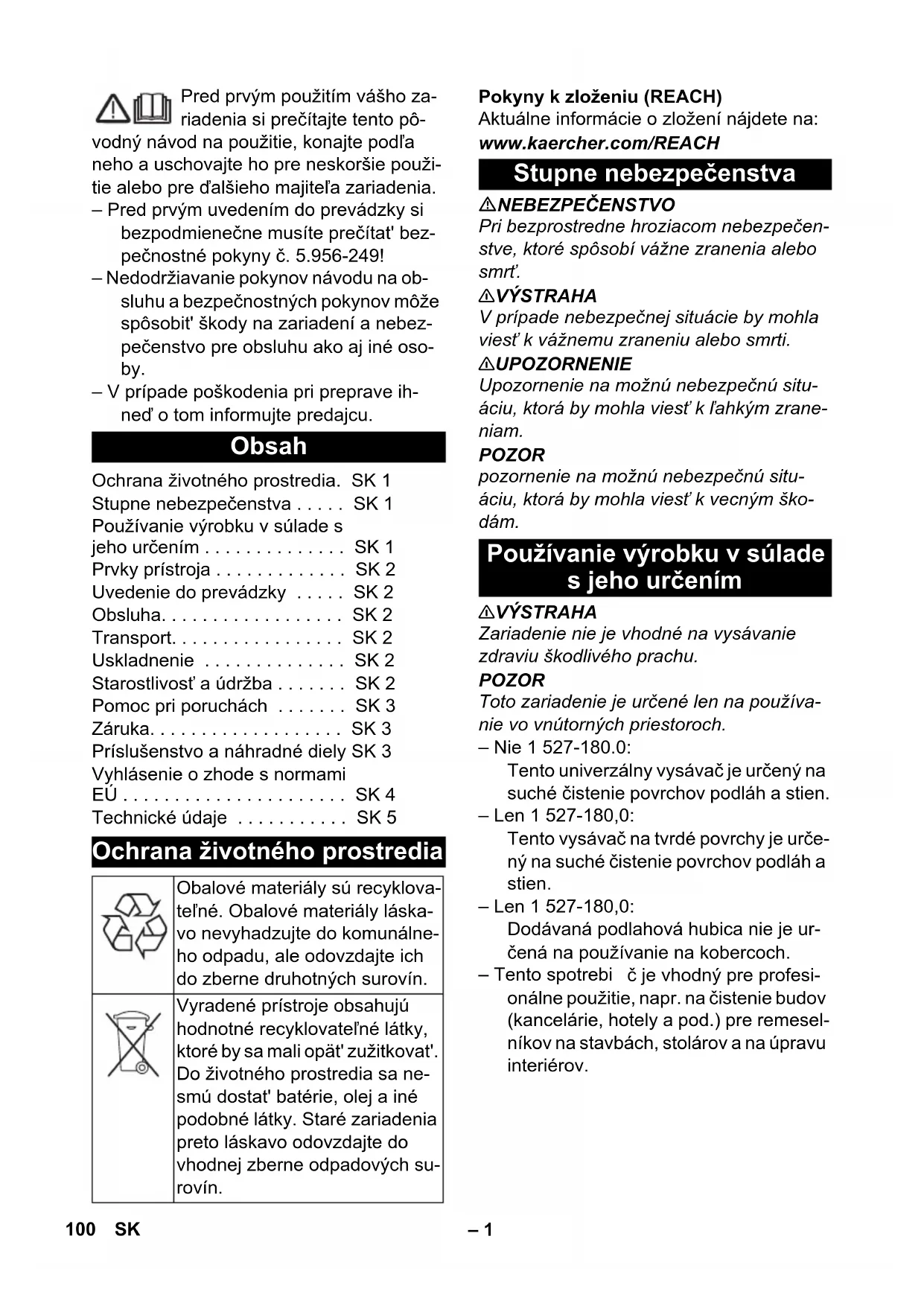 Nr. piesă Lungimea cablului EU 6.650-389.0 7,5 m GB 6.650-429.0 7,5 m 99RO– 1 Pred prvým použitím vášho za- riadenia si prečítajte tento pô- vodný návod na použitie, konajte podľa neho a uschovajte ho pre neskoršie použi- tie alebo pre ďalšieho majiteľa zariadenia. – Pred prvým uvedením do prevádzky si bezpodmienečne musíte prečítat' bez- pečnostné pokyny č. 5.956-249! – Nedodržiavanie pokynov návodu na ob- sluhu a bezpečnostných pokynov môže spôsobit' škody na zariadení a nebez- pečenstvo pre obsluhu ako aj iné oso- by. – V prípade poškodenia pri preprave ih- neď o tom informujte predajcu. Pokyny k zloženiu (REACH) Aktuálne informácie o zložení nájdete na: www.kaercher.com/REACH NEBEZPEČENSTVO Pri bezprostredne hroziacom nebezpečen- stve, ktoré spôsobí vážne zranenia alebo smrť. 몇 VÝSTRAHA V prípade nebezpečnej situácie by mohla viesť k vážnemu zraneniu alebo smrti. 몇 UPOZORNENIE Upozornenie na možnú nebezpečnú situ- áciu, ktorá by mohla viesť k ľahkým zrane- niam. POZOR pozornenie na možnú nebezpečnú situ- áciu, ktorá by mohla viesť k vecným ško- dám. 몇 VÝSTRAHA Zariadenie nie je vhodné na vysávanie zdraviu škodlivého prachu. POZOR Toto zariadenie je určené len na používa- nie vo vnútorných priestoroch. – Nie 1 527-180.0: Tento univerzálny vysávač je určený na suché čistenie povrchov podláh a stien. – Len 1 527-180,0: Tento vysávač na tvrdé povrchy je urče- ný na suché čistenie povrchov podláh a stien. – Len 1 527-180,0: Dodávaná podlahová hubica nie je ur- čená na používanie na kobercoch. – Tento spotrebi č je vhodný pre profesi- onálne použitie, napr. na čistenie budov (kancelárie, hotely a pod.) pre remesel- níkov na stavbách, stolárov a na úpravu interiérov. Obsah Ochrana životného prostredia. SK 1 Stupne nebezpečenstva . . . . . SK 1 Používanie výrobku v súlade s jeho určením . . . . . . . . . . . . . . SK 1 Prvky prístroja . . . . . . . . . . . . . SK 2 Uvedenie do prevádzky . . . . . SK 2 Obsluha. . . . . . . . . . . . . . . . . . SK 2 Transport. . . . . . . . . . . . . . . . . SK 2 Uskladnenie . . . . . . . . . . . . . . SK 2 Starostlivosť a údržba . . . . . . . SK 2 Pomoc pri poruchách . . . . . . . SK 3 Záruka. . . . . . . . . . . . . . . . . . . SK 3 Príslušenstvo a náhradné diely SK 3 Vyhlásenie o zhode s normami EÚ . . . . . . . . . . . . . . . . . . . . . . SK 4 Technické údaje . . . . . . . . . . . SK 5 Ochrana životného prostredia Obalové materiály sú recyklova- teľné. Obalové materiály láska- vo nevyhadzujte do komunálne- ho odpadu, ale odovzdajte ich do zberne druhotných surovín. Vyradené prístroje obsahujú hodnotné recyklovateľné látky, ktoré by sa mali opät' zužitkovat'. Do životného prostredia sa ne- smú dostat' batérie, olej a iné podobné látky. Staré zariadenia preto láskavo odovzdajte do vhodnej zberne odpadových su- rovín. Stupne nebezpečenstva Používanie výrobku v súlade s jeho určením 100 SK– 2 1 Tkaninová filtračná vložka 2 Sacie hrdlo 3 Sacia hadica 4 Výrobný štítok 5 Rukovät' na prenášanie 6 Držiak hadice 7 Držiak káblov 8 Siet'ový kábel 9 Vysávacia hlava 10 Uzáver vysávacej hlavy 11 Otočné koleso 12 Nádrž na nečistoty 13 Hlavný vypínač 14 Prepínač tvrdá plocha/koberec (vždy podľa vybavenia) 15 Podlahová hubica 16 Vysávacia rúra 17 Regulátor sily vysávania (plynulé nasta- venie) (vždy podľa vybavenia) 18 Koleno 19 Hlavný filtračný kôš 20 Ochranný filter motora 1 Prevádzka s filtračným vreckom 2 Prevádzka bez filtračnej vložky Skontrolujte, či je hlavný filtračný kôš vložený do zariadenia. Uvoľnite saciu hlavicu a vyberte ju. Odoberte hlavný filtračný kôš. Nasuňte vrecko s látkovým filtrom. Nasaďte hlavný filtračný koš. Nasaďte a zaistite saciu hlavicu. Zastrčte siet'ovú zástrčku. Zariadenie zapnite pomocou hlavného vypínača. Nie 1 527-180.0: Prepínač trysky na podlahu nastavte na tvrdú plochu alebo koberec. Iba ProT 200: Na regulátore sily vysávania nastavte silu vysávania (plynulé nastavenie). Preveďte čistenie. Zariadenie vypnite pomocou hlavného vypínača. Vytiahnite sieťovú zástrčku. Vyprázdnite nádrž.