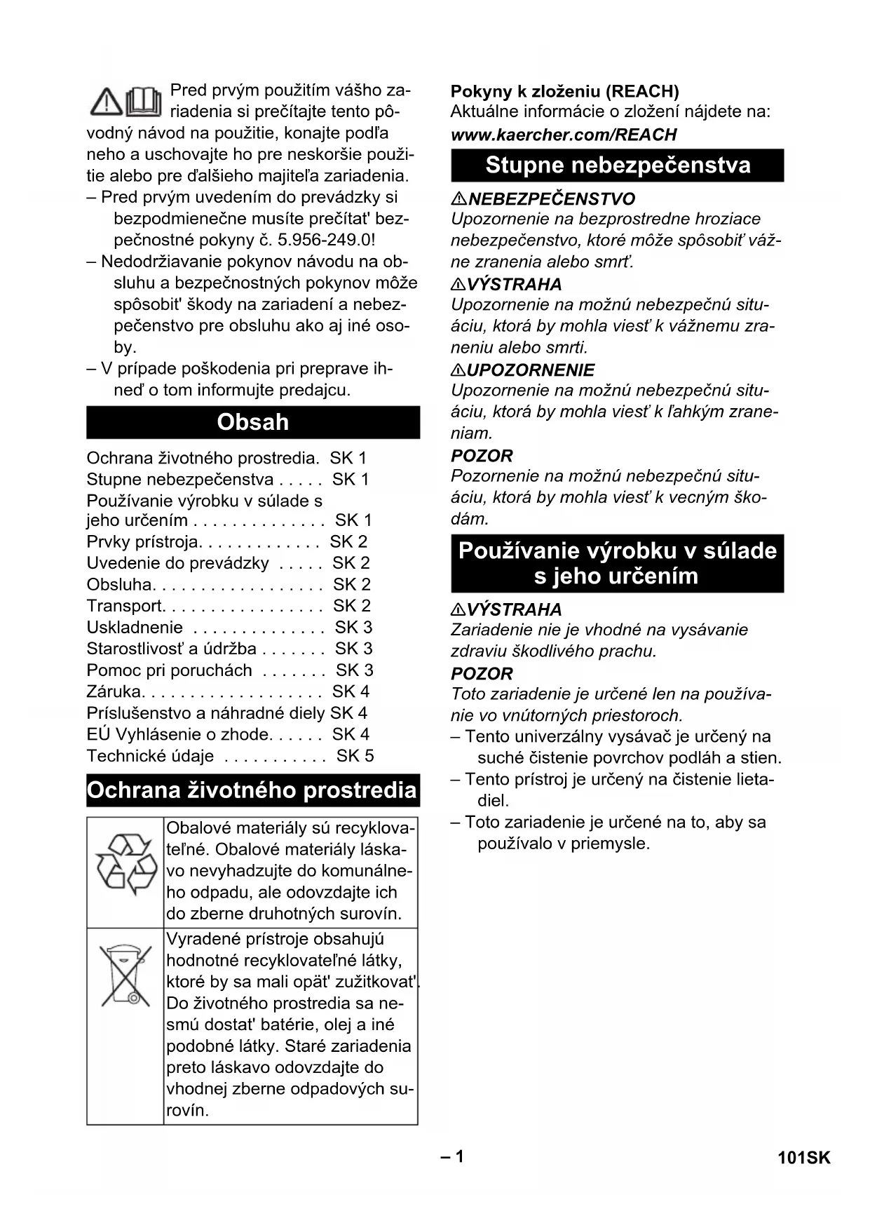 0,2 Design eco conf. 666/2013 Clasă de eficienţă energetică -- C Consum de energie electrică indicativă anual kWh/a 36,0 Clasă de curăţare covoare -- E Clasă de curăţare podele dure -- D Clasă de emisii de praf -- C Nivel de putere acustică L wA, garantat dB(A) 78 Consum nominal de putere W 900 Cablu de ali- mentare SJT 2x16 AWG (105 °C) Nr. piesă Lungimea cablului 6.650-589.0 25 m 100 RO– 1 Pred prvým použitím vášho za- riadenia si prečítajte tento pô- vodný návod na použitie, konajte podľa neho a uschovajte ho pre neskoršie použi- tie alebo pre ďalšieho majiteľa zariadenia. – Pred prvým uvedením do prevádzky si bezpodmienečne musíte prečítat' bez- pečnostné pokyny č. 5.956-249.0! – Nedodržiavanie pokynov návodu na ob- sluhu a bezpečnostných pokynov môže spôsobit' škody na zariadení a nebez- pečenstvo pre obsluhu ako aj iné oso- by. – V prípade poškodenia pri preprave ih- neď o tom informujte predajcu. Pokyny k zloženiu (REACH) Aktuálne informácie o zložení nájdete na: www.kaercher.com/REACH NEBEZPEČENSTVO Upozornenie na bezprostredne hroziace nebezpečenstvo, ktoré môže spôsobiť váž- ne zranenia alebo smrť. 몇 VÝSTRAHA Upozornenie na možnú nebezpečnú situ- áciu, ktorá by mohla viesť k vážnemu zra- neniu alebo smrti. 몇 UPOZORNENIE Upozornenie na možnú nebezpečnú situ- áciu, ktorá by mohla viesť k ľahkým zrane- niam. POZOR Pozornenie na možnú nebezpečnú situ- áciu, ktorá by mohla viesť k vecným ško- dám. 몇 VÝSTRAHA Zariadenie nie je vhodné na vysávanie zdraviu škodlivého prachu. POZOR Toto zariadenie je určené len na používa- nie vo vnútorných priestoroch. – Tento univerzálny vysávač je určený na suché čistenie povrchov podláh a stien. – Tento prístroj je určený na čistenie lieta- diel. – Toto zariadenie je určené na to, aby sa používalo v priemysle. Obsah Ochrana životného prostredia. SK 1 Stupne nebezpečenstva . . . . . SK 1 Používanie výrobku v súlade s jeho určením . . . . . . . . . . . . . . SK 1 Prvky prístroja. . . . . . . . . . . . . SK 2 Uvedenie do prevádzky . . . . . SK 2 Obsluha. . . . . . . . . . . . . . . . . . SK 2 Transport. . . . . . . . . . . . . . . . . SK 2 Uskladnenie . . . . . . . . . . . . . . SK 3 Starostlivosť a údržba . . . . . . . SK 3 Pomoc pri poruchách . . . . . . . SK 3 Záruka. . . . . . . . . . . . . . . . . . . SK 4 Príslušenstvo a náhradné diely SK 4 EÚ Vyhlásenie o zhode. . . . . . SK 4 Technické údaje . . . . . . . . . . . SK 5 Ochrana životného prostredia Obalové materiály sú recyklova- teľné. Obalové materiály láska- vo nevyhadzujte do komunálne- ho odpadu, ale odovzdajte ich do zberne druhotných surovín. Vyradené prístroje obsahujú hodnotné recyklovateľné látky, ktoré by sa mali opät' zužitkovat'. Do životného prostredia sa ne- smú dostat' batérie, olej a iné podobné látky. Staré zariadenia preto láskavo odovzdajte do vhodnej zberne odpadových su- rovín. Stupne nebezpečenstva Používanie výrobku v súlade s jeho určením 101SK– 2 1 Tkaninová filtračná vložka 2Sacie hrdlo 3 Sacia hadica 4 Výrobný štítok 5 Hák na kábel 6 Rukovät' na prenášanie 7 Siet'ový kábel 8 Vysávacia hlava 9 Uzáver vysávacej hlavy 10 Otočné koleso 11 Nádrž na nečistoty 12 Hlavný vypínač 13 Prepínač tvrdá plocha/koberec 14 Podlahová hubica 15 Vysávacia rúra 16 Upevnenie zástrčky elektrickej siete 17 Priestor na uloženie trysky na podlahu 18 Zablokovanie krytu 19 Kryt 20 Regulátor sily vysávania (plynulé nasta- venie) 21 Koleno 22 Teleso filtra 23 Filter odvádzaného vzduchu 24 Hlavný filtračný kôš 25 Ochranný filter motora 26 Mriežka ochranného filtra motora – Ovládacie prvky pre čistiaci proces sú žlté. – Ovládacie prvky pre údržbu a servis sú svetlosivé. Skontrolujte, či je hlavný filtračný kôš vložený do zariadenia. 1 Prevádzka s tkaninovou alebo papiero- vou filtračnou vložkou (špeciálne príslu- šenstvo) 2 Prevádzka bez filtračnej vložky Uvoľnite saciu hlavicu a vyberte ju. Odoberte hlavný filtračný kôš. Nasaďte tkaninovú alebo papierovú vložku filtra (špeciálne príslušenstvo). Nasaďte hlavný filtračný koš. Nasaďte a zaistite saciu hlavicu. Zastrčte siet'ovú zástrčku. Zariadenie zapnite pomocou hlavného vypínača. Prepínač trysky na podlahu nastavte na tvrdú plochu alebo koberec. Na regulátore sily vysávania nastavte silu vysávania (plynulé nastavenie). Preveďte čistenie. Zariadenie vypnite pomocou hlavného vypínača. Vytiahnite sieťovú zástrčku. Vyprázdnite nádrž. Prístroj vyčistite zvnútra aj zvonku od- sávaním a utrite ho pomocou vlhkej handričky. 몇 UPOZORNENIE Nebezpečenstvo zranenia a poškodenia! Pri prepravovaní zariadenia zohľadnite jeho hmotnosť. Pri preprave vo vozidlách zariadenie zaistite proti zošmyknutiu a prevráteniu podľa platných smerníc. Prvky prístroja Farebné označenie Uvedenie do prevádzky Režimy prevádzky Nasadenie vložky filtra Obsluha Zapnutie prístroja Režim prevádzky Čistenie Vypnutie prístroja Po každom použití Transport 102 SK– 3 몇 UPOZORNENIE Nebezpečenstvo zranenia a poškodenia! Pri uskladnení zariadenia zohľadnite jeho hmotnosť. Toto zariadenie sa smie uschovávať len vo vnútri. NEBEZPEČENSTVO Pred všetkými prácami prístroj vypnite a vy- tiahnite sieťovú zástrčku. Hlavný kôš filtra (umývateľný) v prípade potreby vyčistite pod tečúcou vodou. POZOR Nebezpečenstvo poškodenia! Hlavný fil- tračný kôš nenasadzujte vlhký. Filter odvádzaného vzduchu: výmena 1x ročne Uvoľnite kryt a vyberte ho. Vyberte teleso filtra. Z telesa filtra vyberte filter odvádzané- ho vzduchu. Do telesa filtra vložte nový filter odvá- dzaného vzduchu. Nasaďte teleso filtra. Namontujte a zablokujte kryt. Uvoľnite saciu hlavicu a vyberte ju. Mriežku ochranného filtra m