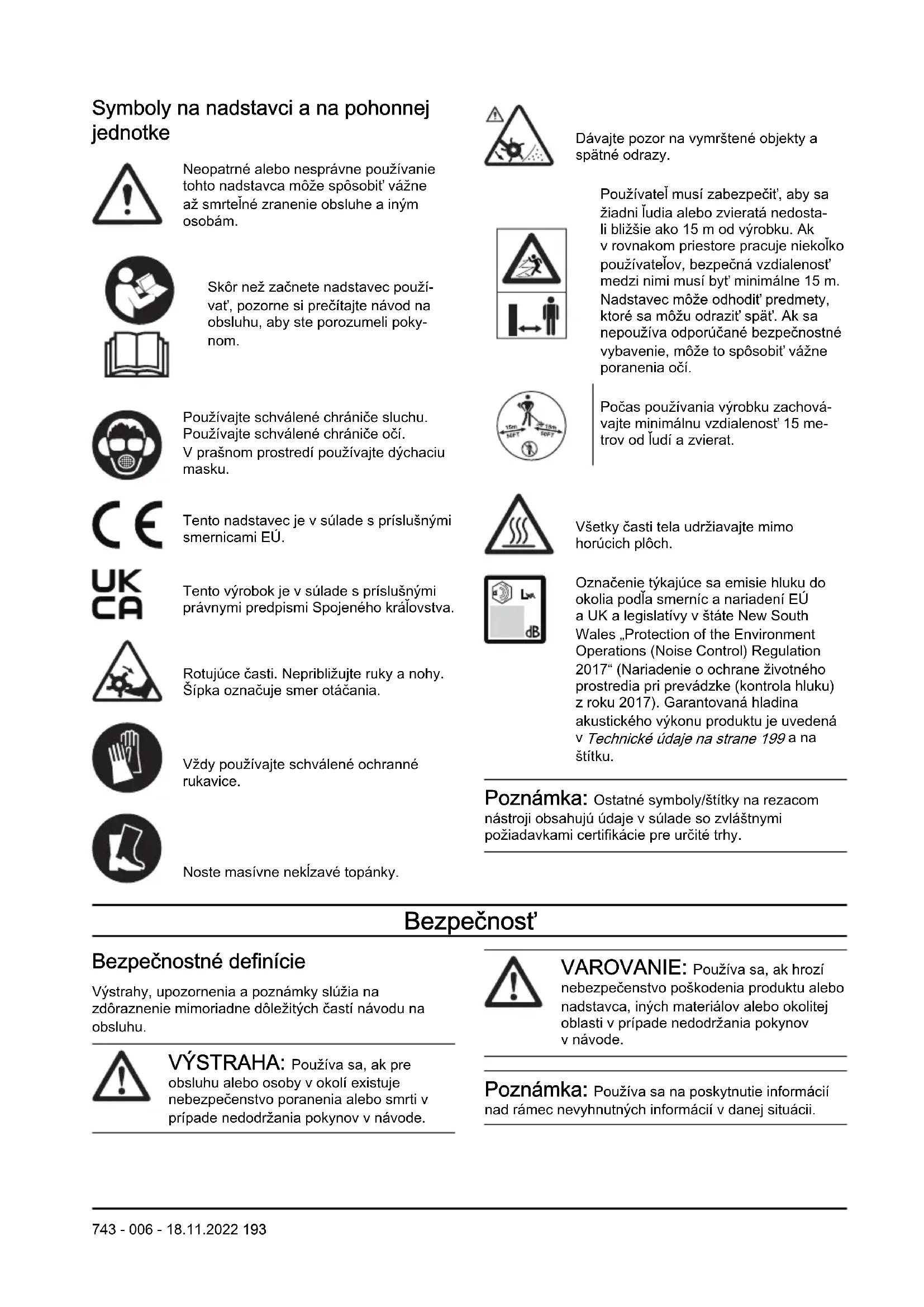 192 743 - 006 - 18.11.2022Symboly na nadstavci a na pohonnej jednotke Neopatrné alebo nesprávne používanie tohto nadstavca môže spôsobiť vážne až smrteľné zranenie obsluhe ainým osobám. Skôr než začnete nadstavec použí- vať, pozorne si prečítajte návod na obsluhu, aby ste porozumeli poky- nom. Používajte schválené chrániče sluchu. Používajte schválené chrániče očí. Vprašnom prostredí používajte dýchaciu masku. Tento nadstavec je v súlade s príslušnými smernicami EÚ. Tento výrobok je vsúlade spríslušnými právnymi predpismi Spojeného kráľovstva. Rotujúce časti. Nepribližujte ruky a nohy. Šípka označuje smer otáčania. Vždy používajte schválené ochranné rukavice. Noste masívne nekĺzavé topánky. Dávajte pozor na vymrštené objekty a spätné odrazy. Používateľ musí zabezpečiť, aby sa žiadni ľudia alebo zvieratá nedosta- li bližšie ako 15m od výrobku. Ak vrovnakom priestore pracuje niekoľko používateľov, bezpečná vzdialenosť medzi nimi musí byť minimálne 15m. Nadstavec môže odhodiť predmety, ktoré sa môžu odraziť späť. Ak sa nepoužíva odporúčané bezpečnostné vybavenie, môže to spôsobiť vážne poranenia očí. Počas používania výrobku zachová- vajte minimálnu vzdialenosť 15me- trov od ľudí azvierat. Všetky časti tela udržiavajte mimo horúcich plôch. Označenie týkajúce sa emisie hluku do okolia podľa smerníc anariadení EÚ a UK alegislatívy vštáte New South Wales „Protection of the Environment Operations (Noise Control) Regulation 2017“ (Nariadenie oochrane životného prostredia pri prevádzke (kontrola hluku) zroku 2017). Garantovaná hladina akustického výkonu produktu je uvedená