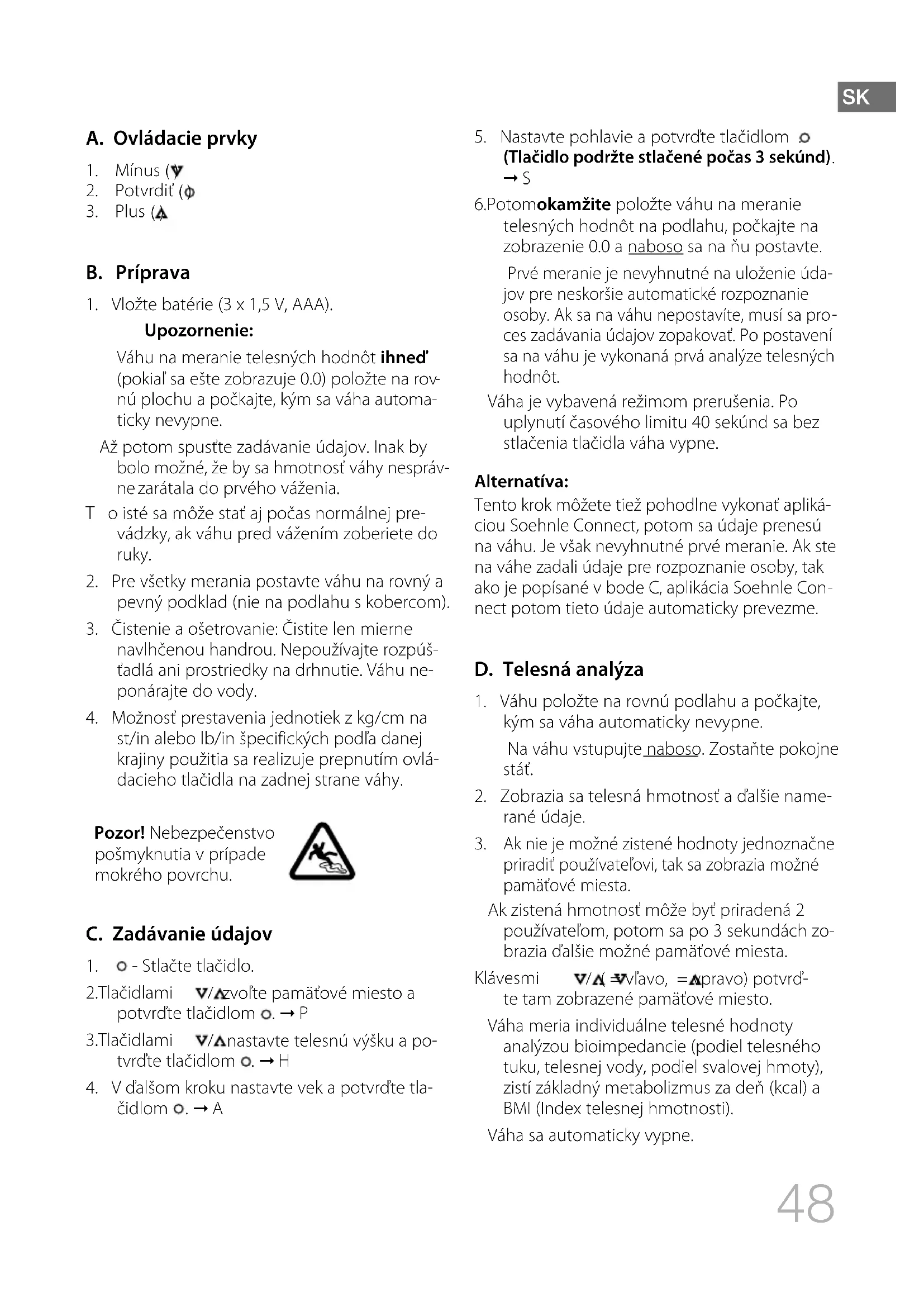 st/in alebo lb/in špecifických podľa danej krajiny použitia sa realizuje prepnutím ovlá- dacieho tlačidla na zadnej strane váhy. Pozor! Nebezpečenstvo pošmyknutia v prípade mokrého povrchu. C. Zadávanie údajov