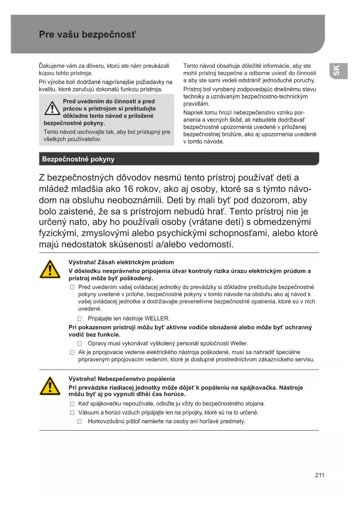Pre vašu bezpečnosť Ďakujemevámzadôveru,ktorústenámpreukázali kúpoutohtoprístroja. Privýrobebolidodržanénajprísnejšiepožiadavkyna kvalitu,ktorézaručujúdokonalúfunkciuprístroja. Pred uvedením do činnosti a pred prácou s prístrojom si preštudujte dôkladne tento návod a priložené bezpečnostné pokyny. Tentonávoduschovajtetak,abybolprístupnýpre všetkýchpoužívateľov. Tentonávodobsahujedôležitéinformácie,abyste mohliprístrojbezpečneaodborneuviesťdočinnosti aabystesamivedeliodstrániťjednoduchéporuchy. Prístrojbolvyrobenýzodpovedajúcdnešnémustavu technikyauznávanýmbezpečnostno-technickým pravidlám. Napriektomuhrozínebezpečenstvovznikupor- aneniaavecnýchškôd,aknebudetedodržiavať bezpečnostnéupozorneniauvedenévpriloženej bezpečnostnejbrožúre,akoajupozorneniauvedené vtomtonávode. Bezpečnostné pokyny Zbezpečnostnýchdôvodovnesmútentoprístrojpoužívaťdetia mládežmladšiaako16rokov,akoajosoby,ktorésastýmtonávo- domnaobsluhuneoboznámili.Detibymalibyťpoddozorom,aby bolozaistené,žesasprístrojomnebudúhrať.Tentoprístrojnieje určenýnato,abyhopoužívaliosoby(vrátanedetí)sobmedzenými fyzickými,zmyslovýmialebopsychickýmischopnosťami,aleboktoré majúnedostatokskúsenostía/alebovedomostí. Výstraha! Zásah elektrickým prúdom V dôsledku nesprávneho pripojenia útvar kontroly rizika úrazu elektrickým prúdom a prístroj môže byť poškodený. Preduvedenímvašejovládacejjednotkydoprevádzkysidôkladnepreštudujtebezpečnostné pokynyuvedenévprílohe,bezpečnostnépokynyvtomtonávodenaobsluhuakoajnávodk vašejovládacejjednotkeadodržiavajteprevenetívnebezpečnostnéopatrenia,ktorésúvnich uvedené. PripájajtelennástrojeWELLER. Pri pokazenom prístroji môžu byť aktívne vodiče obnažené alebo môže byť ochranný vodič bez funkcie. OpravymusívykonávaťvyškolenýpersonálspoločnostiWeller. Akjepripojovacievedenieelektrickéhonástrojapoškodené,musísanahradiťšpeciálne pripravenýmpripojovacímvedením,ktoréjedostupnéprostredníctvomzákazníckehoservisu. Výstraha! Nebezpečenstvo popálenia Pri prevádzke riadiacej jednotky môže dôjsť k popáleniu na spájkovačka. Nástroje môžu byť aj po vypnutí dlhší čas horúce. Keďspájkovačkunepoužívate,odložtejuvždydobezpečnostnéhostojana. Vákuumahorúcivzduchpripájajtelennaprípojky,ktorésúnatourčené. Horkovzdušnúpištoľnemiertenaosobyanihorľavépredmety. SK212