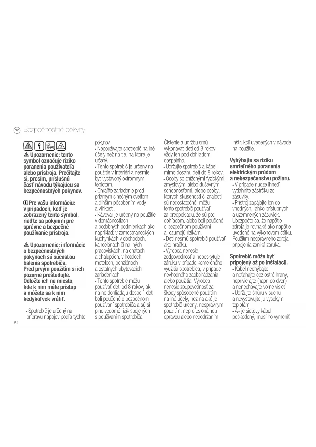 Upozornenie: tento symbol označuje riziko poranenia používateľa alebo prístroja. Prečítajte si, prosím, príslušnú časť návodu týkajúcu sa bezpečnostných pokynov. Pre vašu informáciu: v prípadoch, keď je zobrazený tento symbol, riaďte sa pokynmi pre správne a bezpečné používanie prístroja. Upozornenie: informácie o bezpečnostných pokynoch sú súčasťou balenia spotrebiča. Pred prvým použitím si ich pozorne preštudujte. Odložte ich na miesto, kde k nim máte prístup a môžete sa k nim kedykoľvek vrátiť.