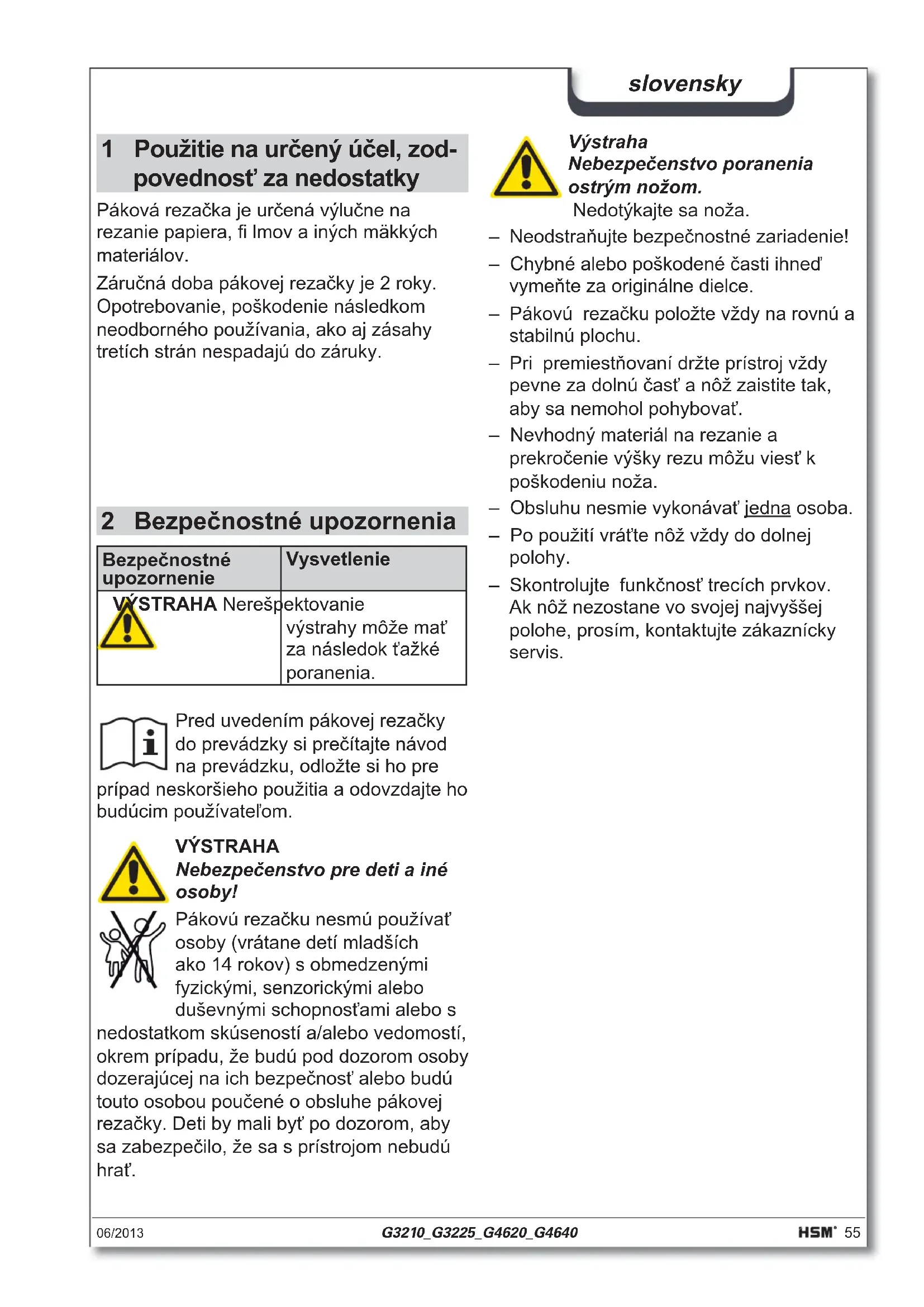 Max. výška střihu (mm) 1,0 2,5 2,0 4,0 Max. formát A4 A4 A3 A3 Délka řezu (mm) 325 325 460 460 Přítlak ruční automatický automatický automatický Pracovní stůl (mm) 325 x 155 325 x 230 460 x 230 460 x 320 Rozměry (mm) 605 x 280 x 75 606 x 308 x 122 737 x 362 x 122 750 x 406 x 133 Hmotnost (kg) 2,12 3,72 4,66 7,30 Upozornění: Z důvodu úspory místa při skladování a k fi xaci nože během přepravy pákové řezačky můžete ochranný štít sklopit. Tuto možnost můžete ovšem využít pouze za předpokladu, že je nůž ve spodní poloze.54 G3210_G3225_G4620_G4640 06/2013 česky06/2013 G3210_G3225_G4620_G4640 55 slovensky 1 Použitie na určený účel, zod- povednosť za nedostatky Páková rezačka je určená výlučne na rezanie papiera, fi lmov a iných mäkkých materiálov. Záručná doba pákovej rezačky je 2 roky. Opotrebovanie, poškodenie následkom neodborného používania, ako aj zásahy tretích strán nespadajú do záruky. 2 Bezpečnostné upozornenia Bezpečnostné upozornenie Vysvetlenie VÝSTRAHA Nerešpektovanie výstrahy môže mať za následok ťažké poranenia. Pred uvedením pákovej rezačky do prevádzky si prečítajte návod na prevádzku, odložte si ho pre prípad neskoršieho použitia a odovzdajte ho budúcim používateľom. VÝSTRAHA Nebezpečenstvo pre deti a iné osoby! Pákovú rezačku nesmú používať osoby (vrátane detí mladších ako 14 rokov) s obmedzenými fyzickými, senzorickými alebo duševnými schopnosťami alebo s nedostatkom skúseností a/alebo vedomostí, okrem prípadu, že budú pod dozorom osoby dozerajúcej na ich bezpečnosť alebo budú touto osobou poučené o obsluhe pákovej rezačky. Deti by mali byť po dozorom, aby sa zabezpečilo, že sa s prístrojom nebudú hrať. Výstraha Nebezpečenstvo poranenia ostrým nožom. Nedotýkajte sa noža. – Neodstraňujte bezpečnostné zariadenie! – Chybné alebo poškodené časti ihneď vymeňte za originálne dielce. – Pákovú rezačku položte vždy na rovnú a stabilnú plochu. – Pri premiestňovaní držte prístroj vždy pevne za dolnú časť a nôž zaistite tak, aby sa nemohol pohybovať. – Nevhodný materiál na rezanie a prekročenie výšky rezu môžu viesť k poškodeniu noža. – Obsluhu nesmie vykonávať jedna osoba. – Po použití vráťte nôž vždy do dolnej polohy. – Skontrolujte funkčnosť trecích prvkov. Ak nôž nezostane vo svojej najvyššej polohe, prosím, kontaktujte zákaznícky servis.56 G3210_G3225_G4620_G4640 06/2013 slovensky