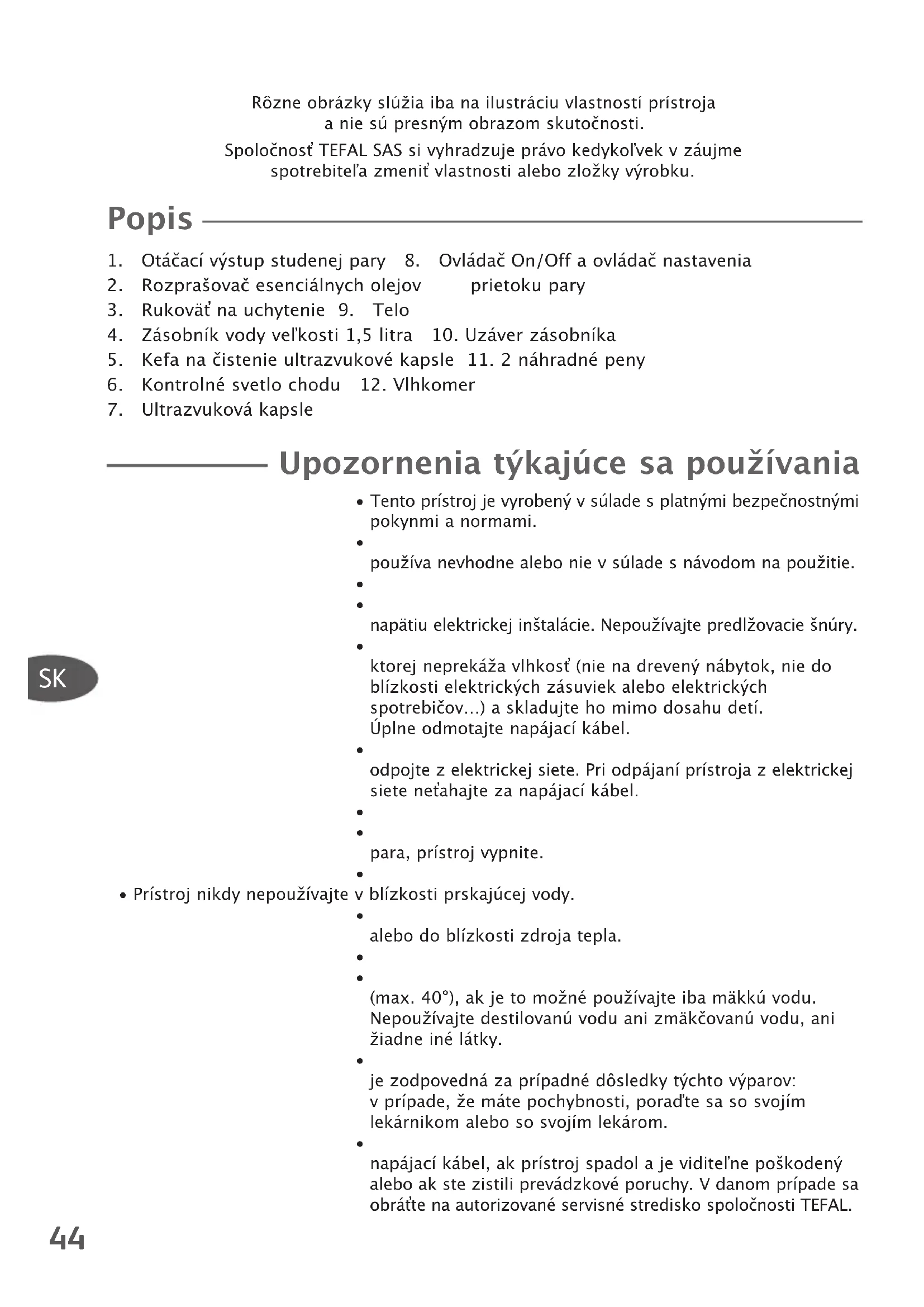 Rôzne obrázky slúžia iba na ilustráciu vlastností prístroja a nie sú presným obrazom skutočnosti. Spoločnosť TEFAL SAS si vyhradzuje právo kedykoľvek v záujme spotrebiteľa zmeniť vlastnosti alebo zložky výrobku. Popis
