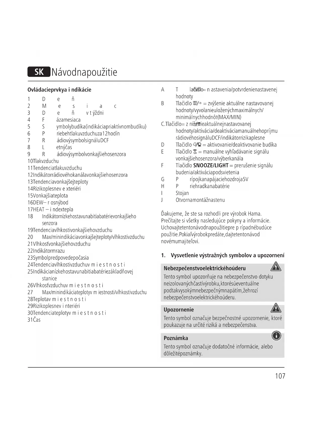 Max/min indikácia teploty vmiestnosti/vlhkosti vzduchu 28 Teplota vmiestnosti 29 Riziko plesne vinteriéri 30 Tendencia teploty vmiestnosti 31 Čas ATlačidlo =nastavenia/potvrdenie nastavenej hodnoty BTlačidlo =zvýšenie aktuálne nastavovanej hodnoty/vyvolanie uložených maximálnych/ minimálnych hodnôt (MAX/MIN) C. Tlačidlo =zníženie aktuálnej nastavovanej hodnoty/aktivácia/deaktivácia manuálneho príjmu rádiového signálu DCF/indikátor rizika plesne DTlačidlo =aktivovanie/deaktivovanie budíka ETlačidlo =manuálne vyhľadávanie signálu vonkajšieho senzora/výber kanála FTlačidlo SNOOZE/LIGHT =prerušenie signálu budenia/aktivácia podsvietenia GPrípojka napájacieho zdroja 5V HPriehradka na batérie IStojan JOtvor na montáž na stenu Ďakujeme, že ste sa rozhodli prevýrobok Hama. Prečítajte si všetky nasledujúce pokyny ainformácie. Uchovajte tento návod na použitie preprípadné budúce použitie. Pokiaľ výrobok predáte, dajte tento návod novému majiteľovi.