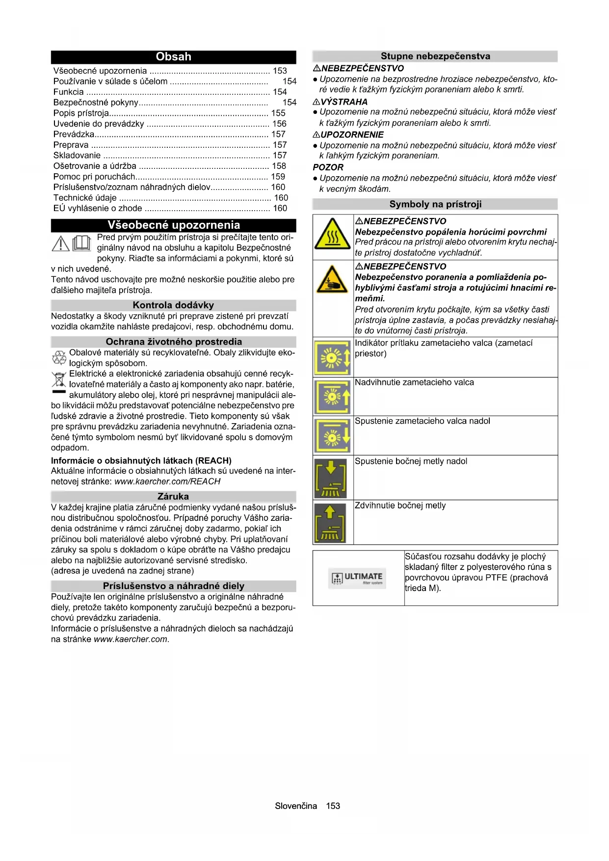 - dB(A) 2 Chairman of the Board of Management Director Regulatory Affairs & Certification H. Jenner S. ReiserSlovenčina 153 Obsah Všeobecné upozornenia Pred prvým použitím prístroja si prečítajte tento ori- ginálny návod na obsluhu a kapitolu Bezpečnostné pokyny. Riaďte sa informáciami a pokynmi, ktoré sú v nich uvedené. Tento návod uschovajte pre možné neskoršie použitie alebo pre ďalšieho majiteľa prístroja. Kontrola dodávky Nedostatky a škody vzniknuté pri preprave zistené pri prevzatí vozidla okamžite nahláste predajcovi, resp. obchodnému domu. Ochrana životného prostredia Obalové materiály sú recyklovateľné. Obaly zlikvidujte eko- logickým spôsobom. Elektrické a elektronické zariadenia obsahujú cenné recyk- lovateľné materiály a často aj komponenty ako napr. batérie, akumulátory alebo olej, ktoré pri nesprávnej manipulácii ale- bo likvidácii môžu predstavovať potenciálne nebezpečenstvo pre ľudské zdravie a životné prostredie. Tieto komponenty sú však pre správnu prevádzku zariadenia nevyhnutné. Zariadenia ozna- čené týmto symbolom nesmú byť likvidované spolu s domovým odpadom. Informácie o obsiahnutých látkach (REACH) Aktuálne informácie o obsiahnutých látkach sú uvedené na inter- netovej stránke: www.kaercher.com/REACH Záruka V každej krajine platia záručné podmienky vydané našou prísluš- nou distribučnou spoločnosťou. Prípadné poruchy Vášho zaria- denia odstránime v rámci záručnej doby zadarmo, pokiaľ ich príčinou boli materiálové alebo výrobné chyby. Pri uplatňovaní záruky sa spolu s dokladom o kúpe obráťte na Vášho predajcu alebo na najbližšie autorizované servisné stredisko. (adresa je uvedená na zadnej strane) Príslušenstvo a náhradné diely Používajte len originálne príslušenstvo a originálne náhradné diely, pretože takéto komponenty zaručujú bezpečnú a bezporu- chovú prevádzku zariadenia. Informácie o príslušenstve a náhradných dieloch sa nachádzajú na stránke www.kaercher.com. Stupne nebezpečenstva NEBEZPEČENSTVO ● Upozornenie na bezprostredne hroziace nebezpečenstvo, kto- ré vedie k ťažkým fyzickým poraneniam alebo k smrti. 몇 VÝSTRAHA ● Upozornenie na možnú nebezpečnú situáciu, ktorá môže viesť k ťažkým fyzickým poraneniam alebo k smrti. 몇 UPOZORNENIE ● Upozornenie na možnú nebezpečnú situáciu, ktorá môže viesť k ľahkým fyzickým poraneniam. POZOR ● Upozornenie na možnú nebezpečnú situáciu, ktorá môže viesť k vecným škodám. Symboly na prístroji Všeobecné upozornenia p. 153