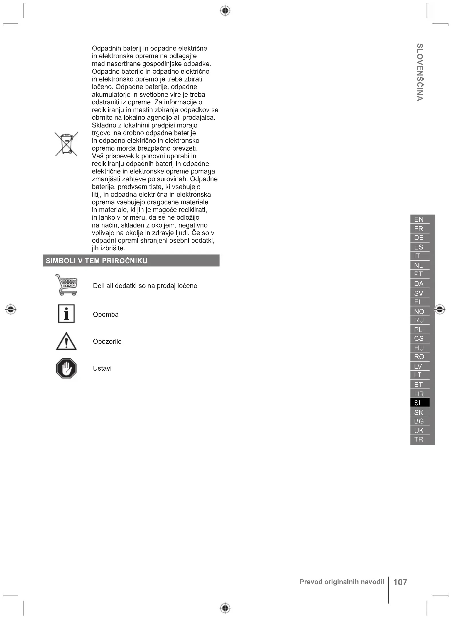 TROdistený vychyľovač žľabu Tlačidlo na uvoľnenie vychyľovača žľabu Odpadové batérie a akumulátory a odpadové elektrické a elektronické zariadenia nelikvidujte ako netriedený komunálny odpad. Odpadové batérie a akumulátory a odpadové elektrické a elektronické zariadenia sa musia zbierať separovane. Odpadové batérie, odpadové akumulátory a svetelné zdroje treba z výrobku vybrať. Informácie o zbernom mieste získate od miestneho orgánu verejnej správy alebo vám ich poskytne maloobchodný predajca. Podľa miestnych predpisov môžu mať maloobchodníci povinnosť bezplatne prevziať odpadové batérie a akumulátory a odpadové elektrické a elektronické zariadenia. Váš príspevok k opätovnému použitiu a recyklácii odpadových batérií a akumulátorov a odpadových elektrických a elektronických zariadení pomáha znižovať dopyt po surovinách. Odpadové batérie a akumulátory, konkrétne tie, ktoré obsahujú lítium, a odpadové elektrické a elektronické zariadenia obsahujú cenné a recyklovateľné materiály, ktoré môžu mať nepriaznivý vplyv na životné prostredie a ľudské zdravie, ak sa nelikvidujú ekologicky vhodným spôsobom. Odstráňte prípadné osobné údaje z odpadového zariadenia.