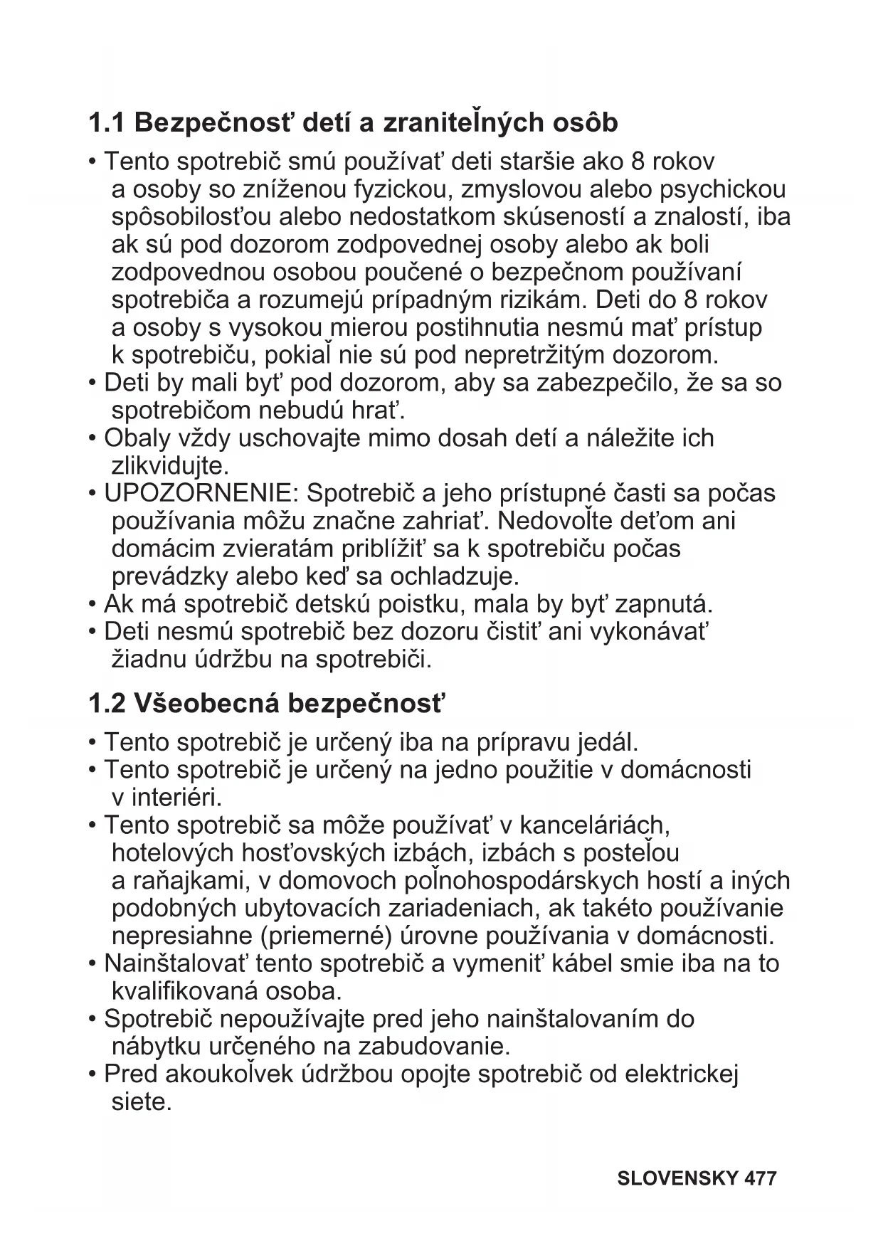 Pred inštaláciou a používaním spotrebiča si pozorne prečítajte priložený návod na používanie. Výrobca nezodpovedá za zranenia ani za škody spôsobené nesprávnou montážou alebo používaním. Tieto pokyny uskladnite na bezpečnom a prístupnom mieste, aby ste do nich mohli v budúcnosti nahliadnuť. 476 SLOVENSKY1.1 Bezpečnosť detí a zraniteľných osôb