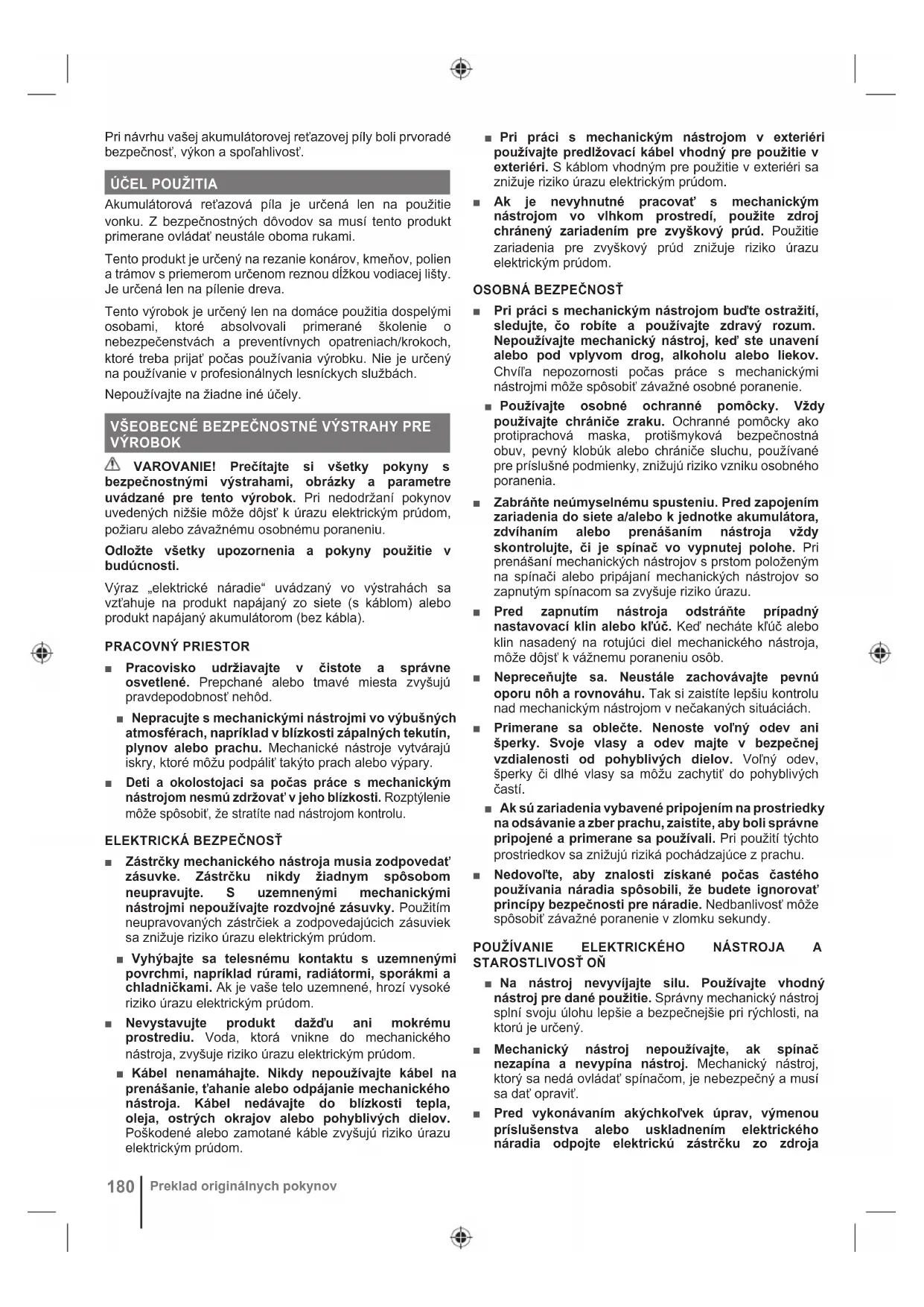 Akumulátorová reťazová píla je určená len na použitie vonku. Z bezpečnostných dôvodov sa musí tento produkt primerane ovládať neustále oboma rukami. Tento produkt je určený na rezanie konárov, kmeňov, polien a trámov s priemerom určenom reznou dĺžkou vodiacej lišty. Je určená len na pílenie dreva. Tento výrobok je určený len na domáce použitia dospelými osobami, ktoré absolvovali primerané školenie o nebezpečenstvách a preventívnych opatreniach/krokoch, ktoré treba prijať počas používania výrobku. Nie je určený na používanie v profesionálnych lesníckych službách. Nepoužívajte na žiadne iné účely. VŠEOBECNÉ BEZPEČNOSTNÉ VÝSTRAHY PRE VÝROBOK VAROVANIE! Prečítajte si všetky pokyny s bezpečnostnými výstrahami, obrázky a parametre uvádzané pre tento výrobok. Pri nedodržaní pokynov uvedených nižšie môže dôjsť k úrazu elektrickým prúdom, požiaru alebo závažnému osobnému poraneniu. Odložte všetky upozornenia a pokyny použitie v budúcnosti. Výraz „elektrické náradie“ uvádzaný vo výstrahách sa vzťahuje na produkt napájaný zo siete (s káblom) alebo produkt napájaný akumulátorom (bez kábla). PRACOVNÝ PRIESTOR ■ Pracovisko udržiavajte v čistote a správne osvetlené. Prepchané alebo tmavé miesta zvyšujú pravdepodobnosť nehôd. ■ Nepracujte s mechanickými nástrojmi vo výbušných atmosférach, napríklad v blízkosti zápalných tekutín, plynov alebo prachu. Mechanické nástroje vytvárajú iskry, ktoré môžu podpáliť takýto prach alebo výpary. ■ Deti a okolostojaci sa počas práce s mechanickým nástrojom nesmú zdržovať v jeho blízkosti. Rozptýlenie môže spôsobiť, že stratíte nad nástrojom kontrolu.