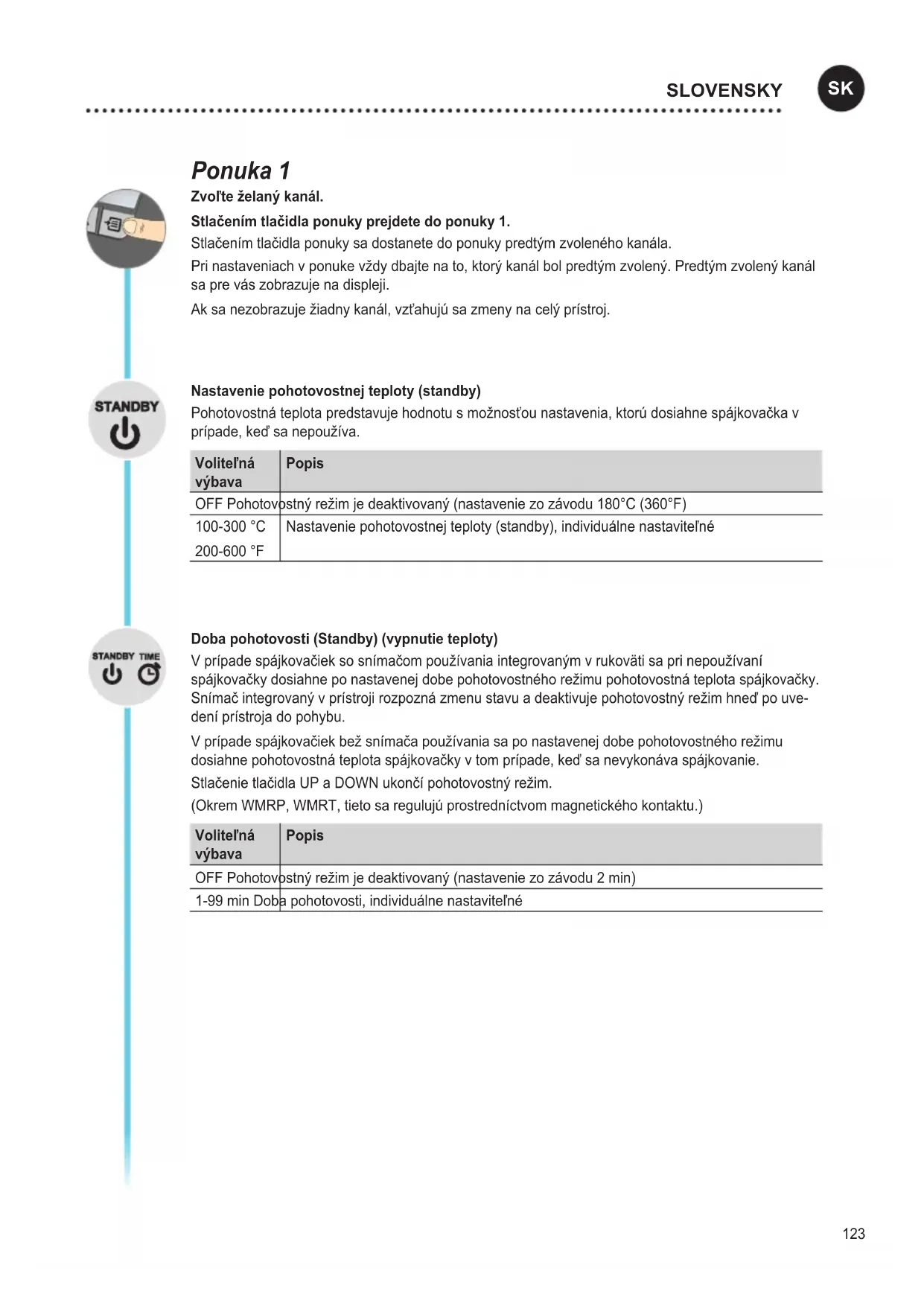 - Csatlakozási hely beállításainak ellenőrzése123 Ponuka 1 Zvoľte želaný kanál. Stlačenm tlačidla ponuky prejdete do ponuky 1. Stlačením tlačidla ponuky sa dostanete do ponuky predtým zvoleného kanála. Pri nastaveniach v ponuke vždy dbajte na to, ktorý kanál bol predtým zvolený. Predtým zvolený kanál sa pre vás zobrazuje na displeji. Ak sa nezobrazuje žiadny kanál, vzťahujú sa zmeny na celý prístroj. Nastavenie pohotovostnej teploty (standby) Pohotovostná teplota predstavuje hodnotu s možnosťou nastavenia, ktorú dosiahne spájkovačka v prípade, keď sa nepoužíva. Voliteľná výbava Popis OFF Pohotovostný režim je deaktivovaný (nastavenie zo závodu 180°C (360°F) 100-300 °C 200-600 °F Nastavenie pohotovostnej teploty (standby), individuálne nastaviteľné Doba pohotovosti (Standby) (vypnutie teploty) V prípade spájkovačiek so snímačom používania integrovaným v rukoväti sa pri nepoužívaní spájkovačky dosiahne po nastavenej dobe pohotovostného režimu pohotovostná teplota spájkovačky. Snímač integrovaný v prístroji rozpozná zmenu stavu a deaktivuje pohotovostný režim hneď po uve- dení prístroja do pohybu. V prípade spájkovačiek bež snímača používania sa po nastavenej dobe pohotovostného režimu dosiahne pohotovostná teplota spájkovačky v tom prípade, keď sa nevykonáva spájkovanie. Stlačenie tlačidla UP a DOWN ukončí pohotovostný režim. (Okrem WMRP, WMRT, tieto sa regulujú prostredníctvom magnetického kontaktu.) Voliteľná výbava Popis OFF Pohotovostný režim je deaktivovaný (nastavenie zo závodu 2 min) 1-99 min Doba pohotovosti, individuálne nastaviteľné