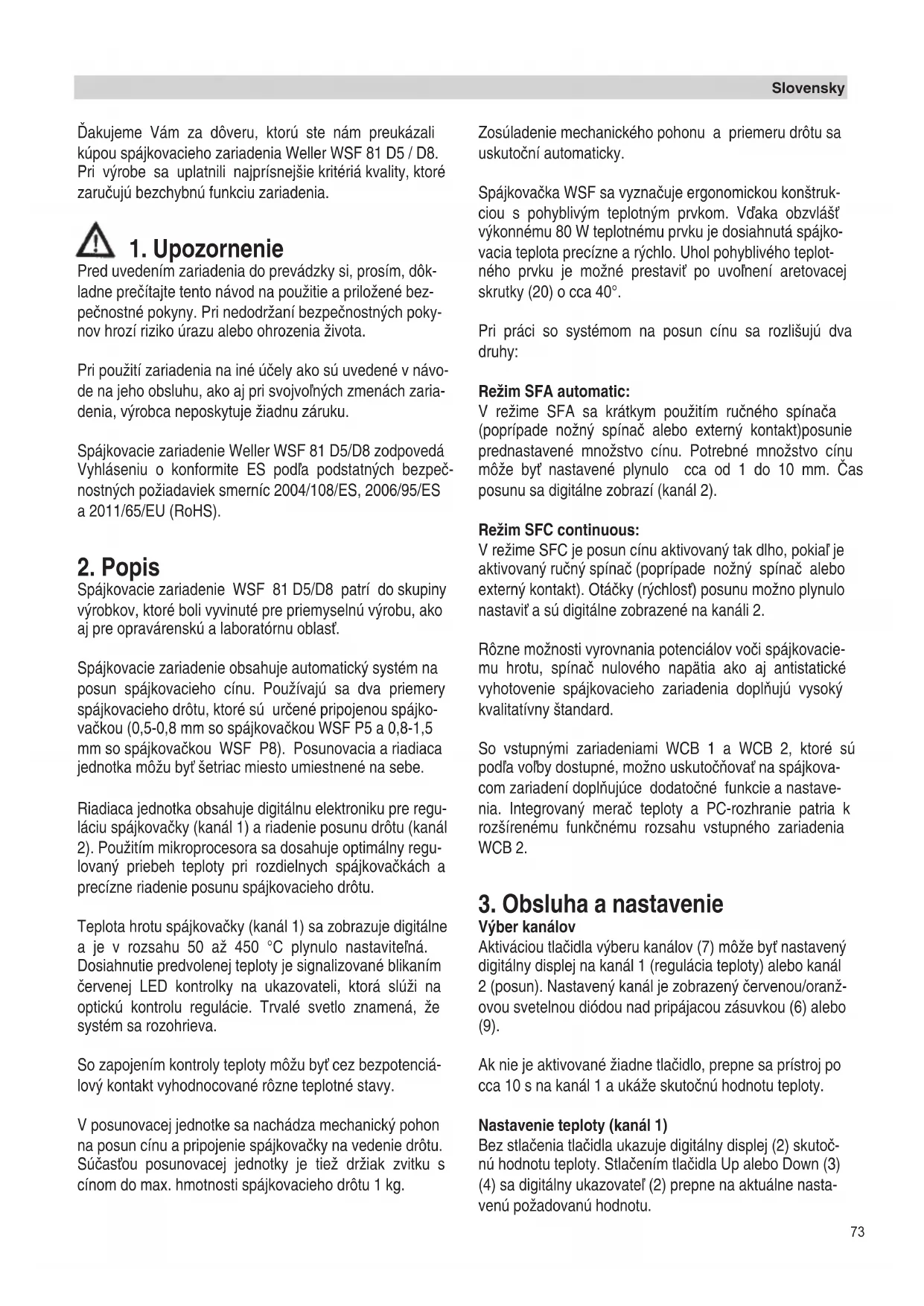 Pred uvedením zariadenia do prevádzky si, prosím, dôk- ladne preãítajte tento návod na pouÏitie a priloÏené bez- peãnostné pokyny. Pri nedodrÏaní bezpeãnostn˘ch poky- nov hrozí riziko úrazu alebo ohrozenia Ïivota. Pri pouÏití zariadenia na iné úãely ako sú uvedené v návo- de na jeho obsluhu, ako aj pri svojvoºn˘ch zmenách zaria- denia, v˘robca neposkytuje Ïiadnu záruku. Spájkovacie zariadenie Weller WSF 81 D5/D8 zodpovedá Vyhláseniu o konformite ES podºa podstatn˘ch bezpeã- nostn˘ch poÏiadaviek smerníc 2004/108/ES, 2006/95/ES a 2011/65/EU (RoHS).
