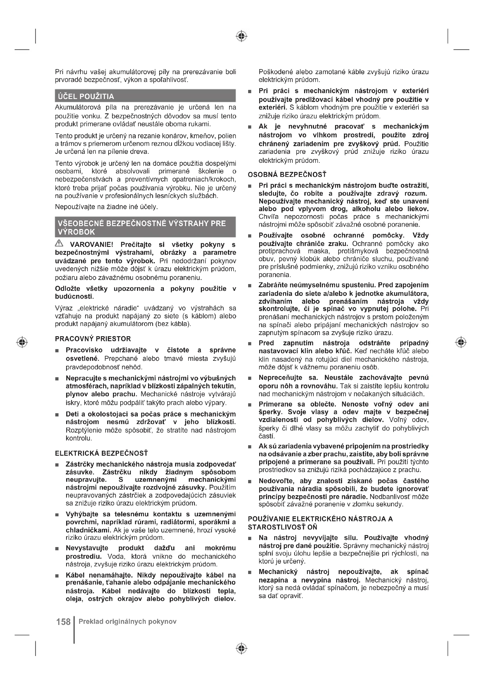 Akumulátorová píla na prerezávanie je určená len na použitie vonku. Z bezpečnostných dôvodov sa musí tento produkt primerane ovládať neustále oboma rukami. Tento produkt je určený na rezanie konárov, kmeňov, polien a trámov s priemerom určenom reznou dĺžkou vodiacej lišty. Je určená len na pílenie dreva. Tento výrobok je určený len na domáce použitia dospelými osobami, ktoré absolvovali primerané školenie o nebezpečenstvách a preventívnych opatreniach/krokoch, ktoré treba prijať počas používania výrobku. Nie je určený na používanie v profesionálnych lesníckych službách. Nepoužívajte na žiadne iné účely. VŠEOBECNÉ BEZPEČNOSTNÉ VÝSTRAHY PRE VÝROBOK VAROVANIE! Prečítajte si všetky pokyny s bezpečnostnými výstrahami, obrázky a parametre uvádzané pre tento výrobok. Pri nedodržaní pokynov uvedených nižšie môže dôjsť k úrazu elektrickým prúdom, požiaru alebo závažnému osobnému poraneniu. Odložte všetky upozornenia a pokyny použitie v budúcnosti. Výraz „elektrické náradie“ uvádzaný vo výstrahách sa vzťahuje na produkt napájaný zo siete (s káblom) alebo produkt napájaný akumulátorom (bez kábla). PRACOVNÝ PRIESTOR ■ Pracovisko udržiavajte v čistote a správne osvetlené. Prepchané alebo tmavé miesta zvyšujú pravdepodobnosť nehôd. ■ Nepracujte s mechanickými nástrojmi vo výbušných atmosférach, napríklad v blízkosti zápalných tekutín, plynov alebo prachu. Mechanické nástroje vytvárajú iskry, ktoré môžu podpáliť takýto prach alebo výpary. ■ Deti a okolostojaci sa počas práce s mechanickým nástrojom nesmú zdržovať v jeho blízkosti. Rozptýlenie môže spôsobiť, že stratíte nad nástrojom kontrolu.