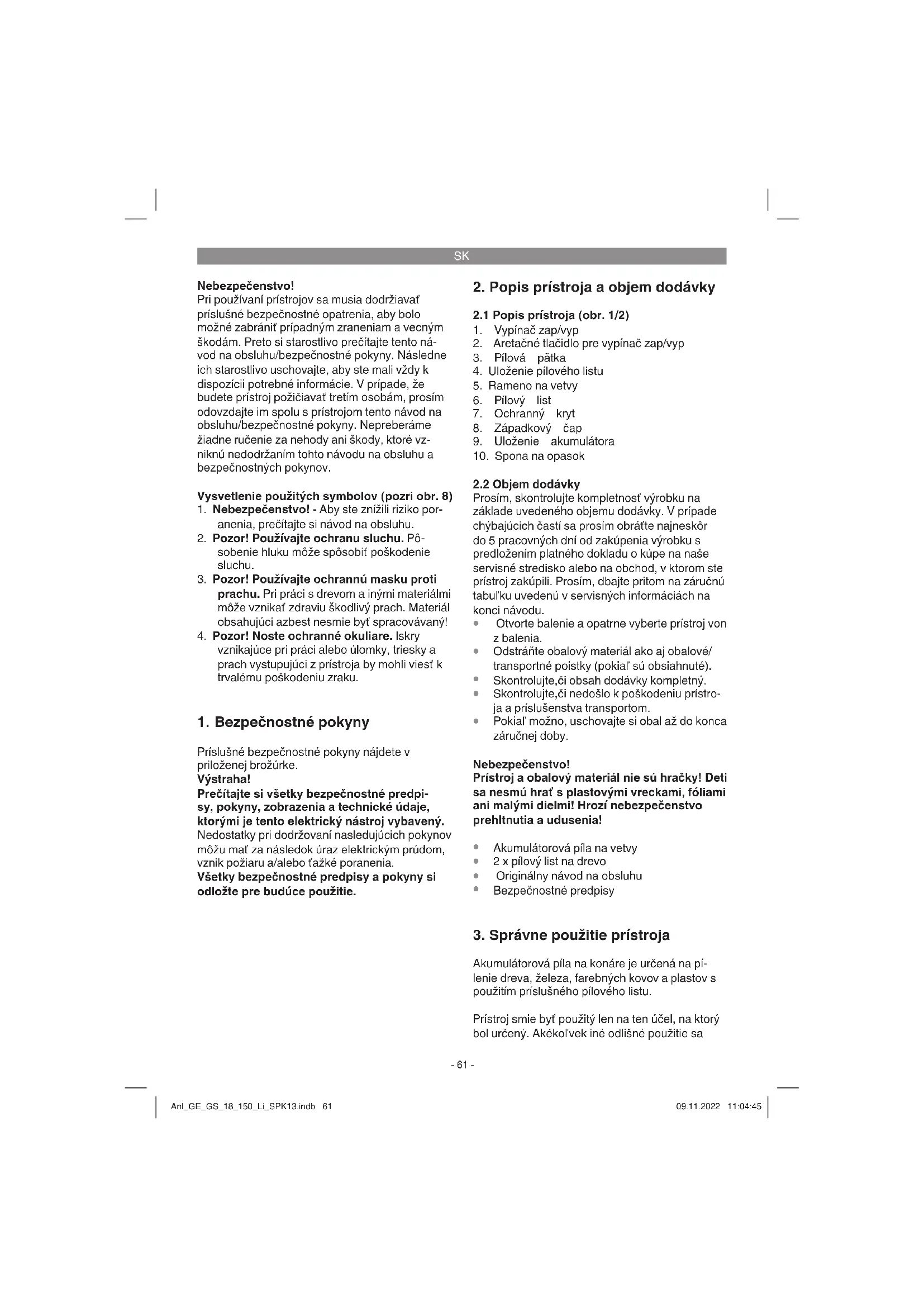 Akumulátorová píla na konáre je určená na pí- lenie dreva, železa, farebných kovov a plastov s použitím príslušného pílového listu. Prístroj smie byť použitý len na ten účel, na ktorý bol určený. Akékoľvek iné odlišné použitie sa Anl_GE_GS_18_150_Li_SPK13.indb 61Anl_GE_GS_18_150_Li_SPK13.indb 61 09.11.2022 11:04:4509.11.2022 11:04:45SK