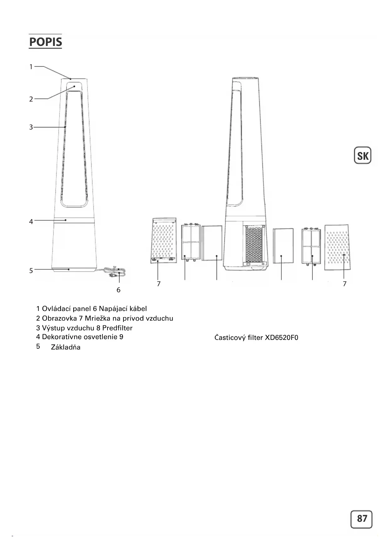 Než za nete vykonáva akúko vek údržbu alebo istenie, spotrebi vždy vypnite a odpojte od napájania. Na istenie povrchov produktu použite navlh enú tkaninu. Dôležité: Nepoužívajte žiadne abrazívne materiály, pretože by mohlo dôjs k poškodeniu povr- chu produktu. 1 Model ltra: XD6520F0 (vrátane 2 súprav) 3 Vymeňte lter za nový. Nútený reset: Ak ste filter vymenili ešte pre koncom životnosti, bude potrebné uskutočniť nútený reset cyklu výmeny filtra: Tlačidlo resetu podržte stlačené po dobu 3 sekúnd. 4 Dlhým stlačením tlačidla ltra po dobu 3 sekúnd dôjde k zhasnutiu indikátora na výmenu ltra. 2 Indikátor sa rozsvieti v prípade potreby výmeny časticového ltra.