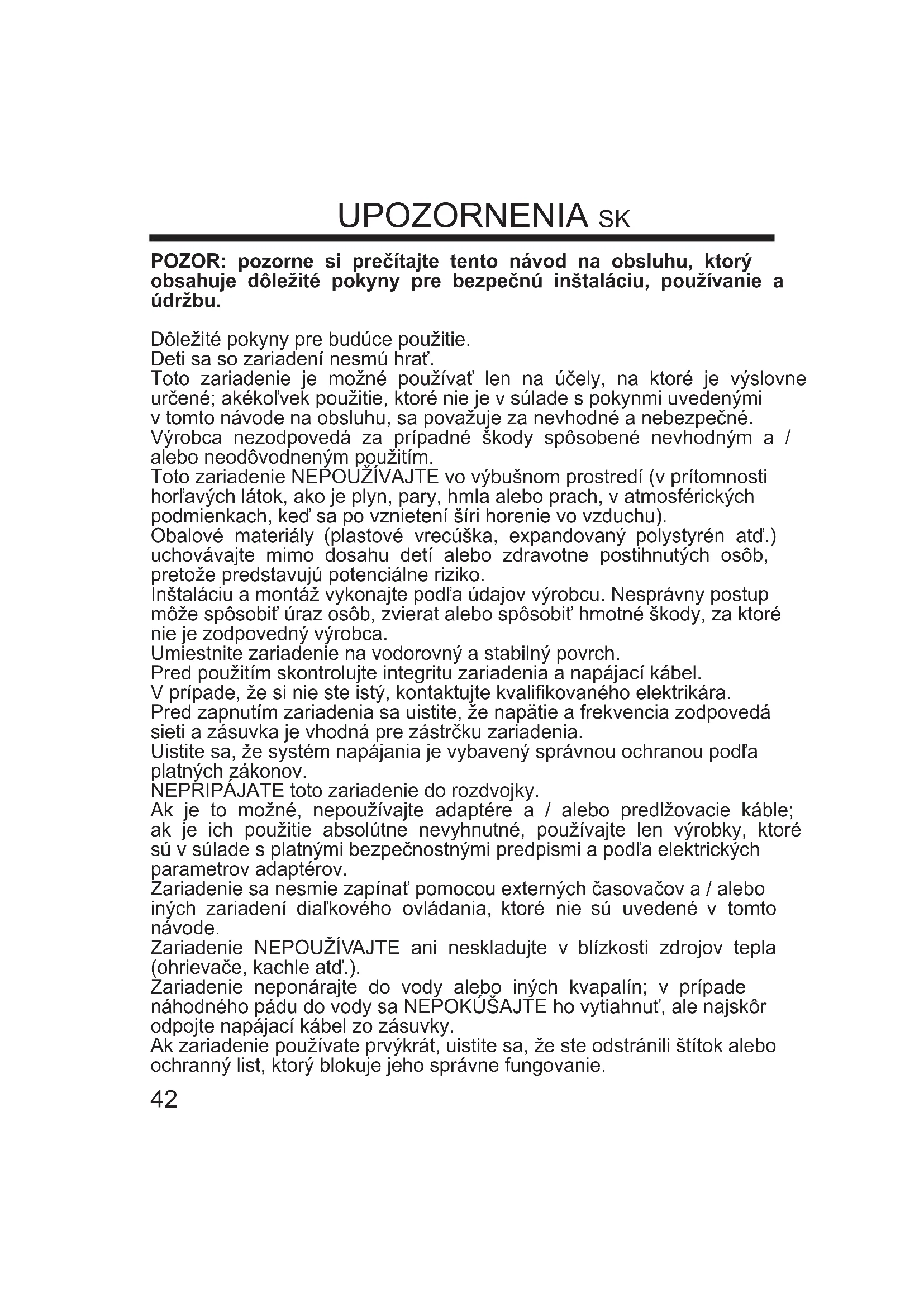 Dátum/podpis: ...................................................................................................................................................................................48 Informácie o likvidácii opotrebovaného elektrického zariadenia (súkromné domácnosti) Tento symbol na produktoch a/alebo na priložených dokumentoch znamená, že sa pri likvidácii nesmú elektrické a elektronické zariadenia miešať so všeobecným domácim odpadom. V záujme správneho obhospodarovania, obnovy a recyklácie odvezte, prosím, tieto produkty na určené zberné miesta, kde budú prijaté bez poplatku. V niektorých krajinách je možné tieto produkty vrátiť priamo miestnemu maloobchodu v prípade, ak si objednáte podobný nový výrobok. Správna likvidácia týchto produktov pomôže ušetriť hodnotné zdroje a zabrániť možným negatívnym vplyvom na ľudské zdravie a prostredie, ktoré môžu inak vzniknúť v dôsledku nesprávneho zaobchádzania s odpadom. Bližšie informácie o najbližšom zbernom mieste získate na miestnom úrade. V prípade nesprávnej likvidácie odpadu môžu byť uplatnené pokuty v súlade s platnou legislatívou. Pre právnické osoby v Európskej únii Ak potrebujete zlikvidovať opotrebované elektrické a elektronické zariadenia, bližšie informácie získate od svojho miestneho predajcu alebo dodávateľa. Informácie o likvidácii v krajinách mimo Európskej únie Tento symbol je platný len v Európskej únii. Ak si želáte zlikvidovať toto zariadenie, obráťte sa na miestny úrad alebo predajcu a poinformujte sa o správnom spôsobe likvidácie tohto typu odpadu. Dovozca: PRIVEST s.r.o. Na Zlatnici 301/2 Praha 4, PSČ 147 00 www: www.privest.cz Email: info@privest.cz Telefón: (+420) 241 410 8194950515A50.100920
