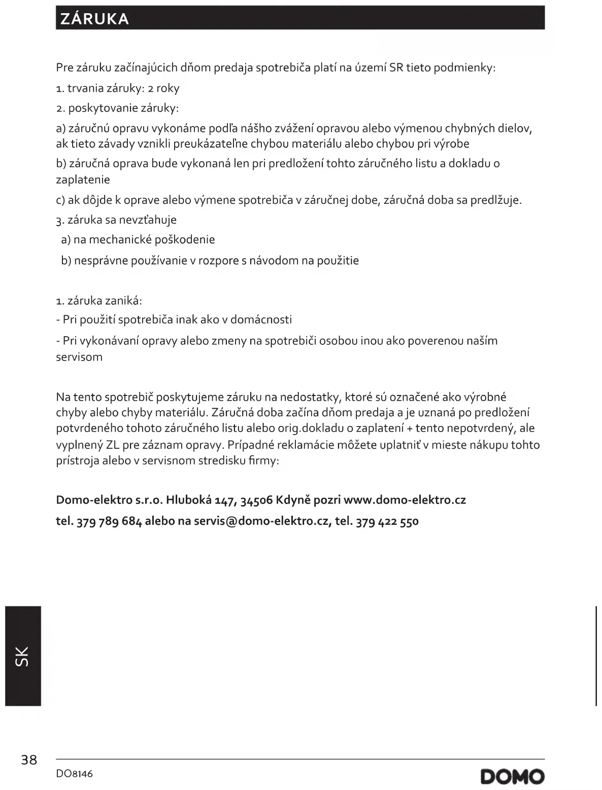 - Pri použití spotrebiča inak ako v domácnosti - Pri vykonávaní opravy alebo zmeny na spotrebiči osobou inou ako poverenou naším servisom Na tento spotrebič poskytujeme záruku na nedostatky, ktoré sú označené ako výrobné chyby alebo chyby materiálu. Záručná doba začína dňom predaja a je uznaná po predložení potvrdeného tohoto záručného listu alebo orig.dokladu o zaplatení + tento nepotvrdený, ale vyplnený ZL pre záznam opravy. Prípadné reklamácie môžete uplatniť v mieste nákupu tohto prístroja alebo v servisnom stredisku rmy: Domo-elektro s.r.o. Hluboká 147, 34506 Kdyně pozri www.domo-elektro.cz tel. 379 789 684 alebo na servis@domo-elektro.cz, tel. 379 422 55039 DO8146 www.domo-elektro.be