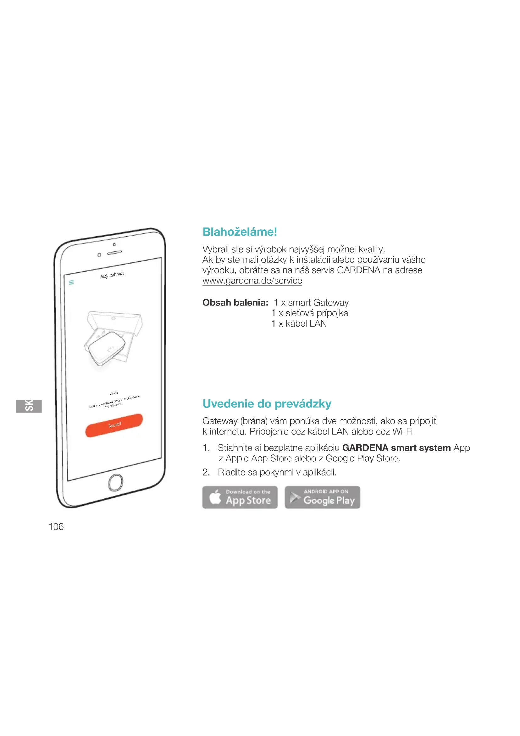 Blahoželáme! Vybrali ste si výrobok najvyššej možnej kvality. Ak by ste mali otázky k inštalácii alebo používaniu vášho výrobku, obráťte sa na náš servis GARDENA na adrese www.gardena.de/service Obsah balenia: 1 x smart Gateway 1 x sieťová prípojka 1 x kábel LAN Uvedenie do prevádzky Gateway (brána) vám ponúka dve možnosti, ako sa pripojiť k internetu. Pripojenie cez kábel LAN alebo cez Wi-Fi.