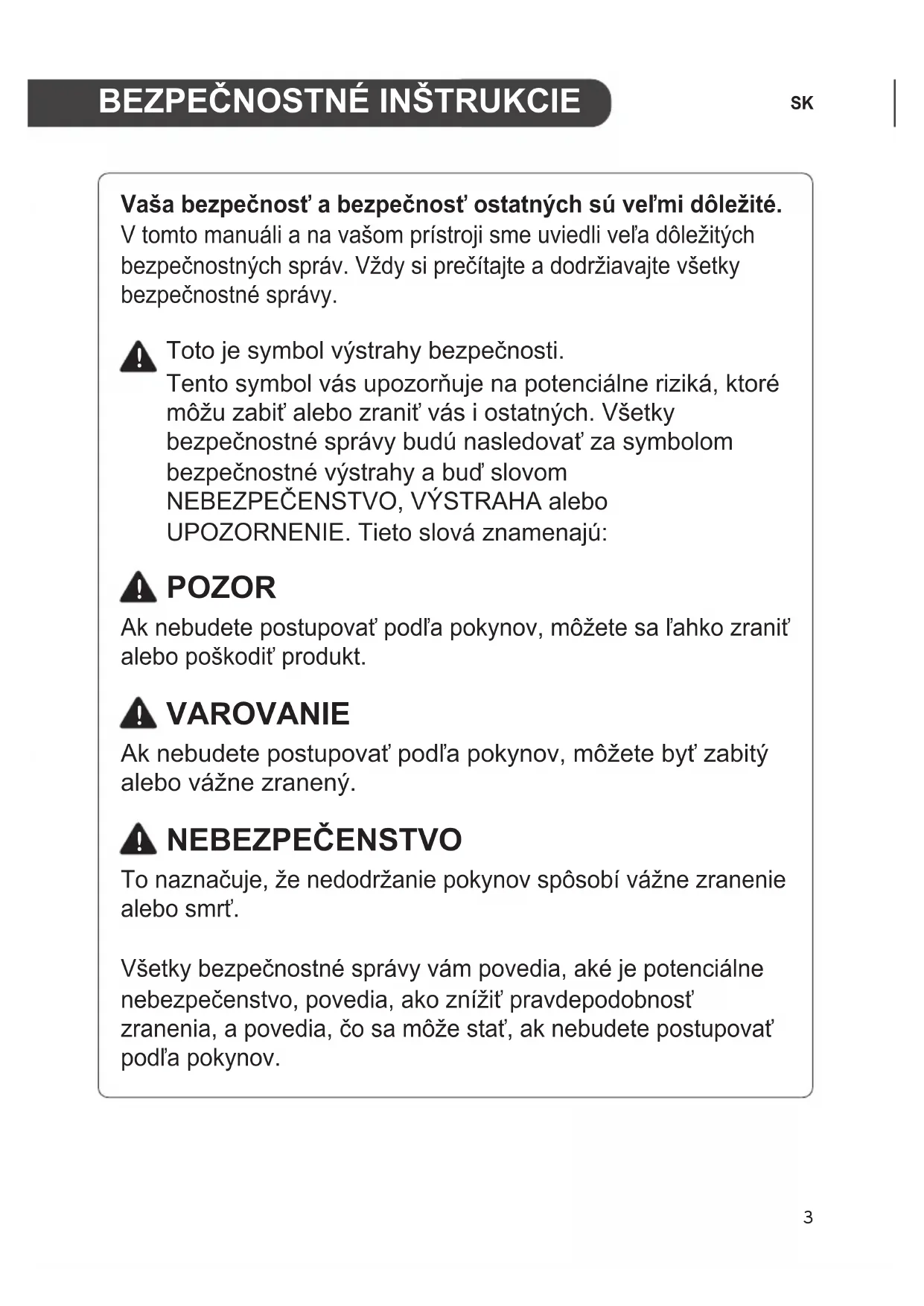 Vaša bezpečnosť a bezpečnosť ostatných sú veľmi dôležité. V tomto manuáli a na vašom prístroji sme uviedli veľa dôležitých bezpečnostných správ. Vždy si prečítajte a dodržiavajte všetky bezpečnostné správy. Toto je symbol výstrahy bezpečnosti. Tento symbol vás upozorňuje na potenciálne riziká, ktoré môžu zabiť alebo zraniť vás i ostatných. Všetky bezpečnostné správy budú nasledovať za symbolom bezpečnostné výstrahy a buď slovom NEBEZPEČENSTVO, VÝSTRAHA alebo UPOZORNENIE. Tieto slová znamenajú: POZOR Ak nebudete postupovať podľa pokynov, môžete sa ľahko zraniť alebo poškodiť produkt. VAROVANIE Ak nebudete postupovať podľa pokynov, môžete byť zabitý alebo vážne zranený. NEBEZPEČENSTVO To naznačuje, že nedodržanie pokynov spôsobí vážne zranenie alebo smrť. Všetky bezpečnostné správy vám povedia, aké je potenciálne nebezpečenstvo, povedia, ako znížiť pravdepodobnosť zranenia, a povedia, čo sa môže stať, ak nebudete postupovať podľa pokynov.