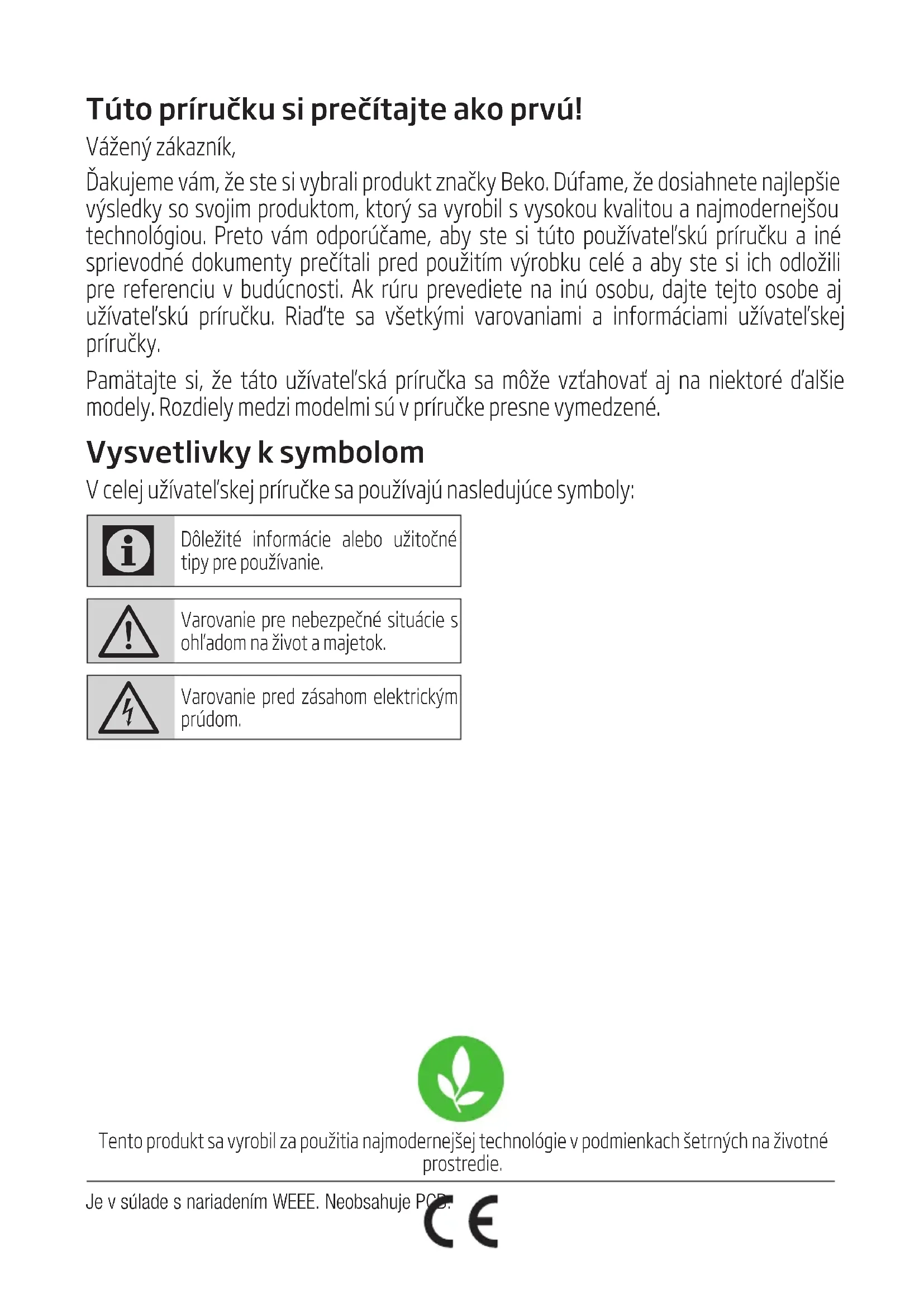 Čščenje n vzdrževanjeTúto príručku si prečítajte ako prvú! Vážený zákazník, Ďakujeme vám, že ste si vybrali produkt značky Beko. Dúfame, že dosiahnete najlepšie výsledky so svojim produktom, ktorý sa vyrobil s vysokou kvalitou a najmodernejšou technológiou. Preto vám odporúčame, aby ste si túto používateľskú príručku a iné sprievodné dokumenty prečítali pred použitím výrobku celé a aby ste si ich odložili pre referenciu v budúcnosti. Ak rúru prevediete na inú osobu, dajte tejto osobe aj užívateľskú príručku. Riaďte sa všetkými varovaniami a informáciami užívateľskej príručky. Pamätajte si, že táto užívateľská príručka sa môže vzťahovať aj na niektoré ďalšie modely. Rozdiely medzi modelmi sú v príručke presne vymedzené. Vysvetlivky k symbolom V celej užívateľskej príručke sa používajú nasledujúce symboly: