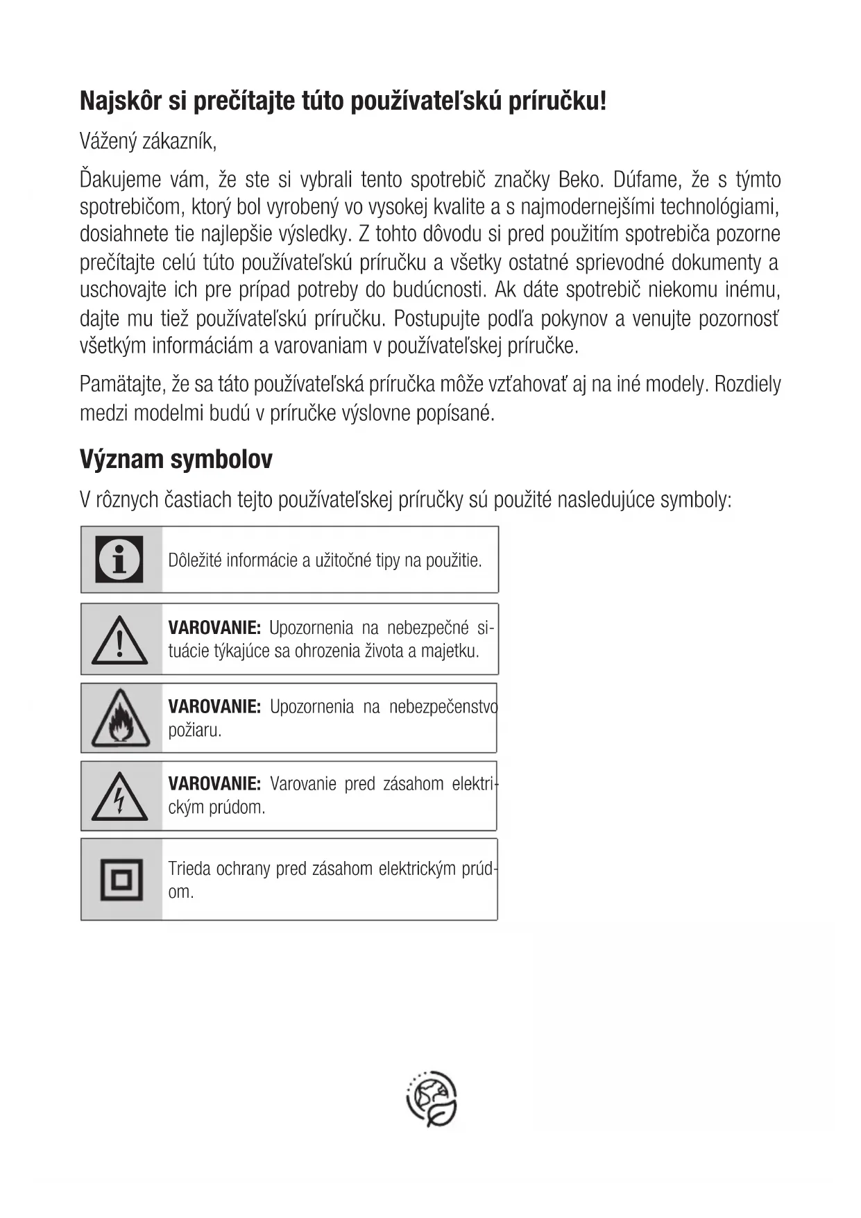Dôležité bezpečnostné pokyny: Dôkladne si ich prečítajte a uscho- vajte pre nahliadnutie v budúcnosti Táto časť obsahuje bezpečnostné pokyny, ktoré pomôžu ochrániť pred zranením osôb, poškodením majetku, vznikom požiaru ale- bo pred zásahom elektrickým prúdom. Nedodržanie týchto po- kynov zruší platnosť akejkoľvek záruky.