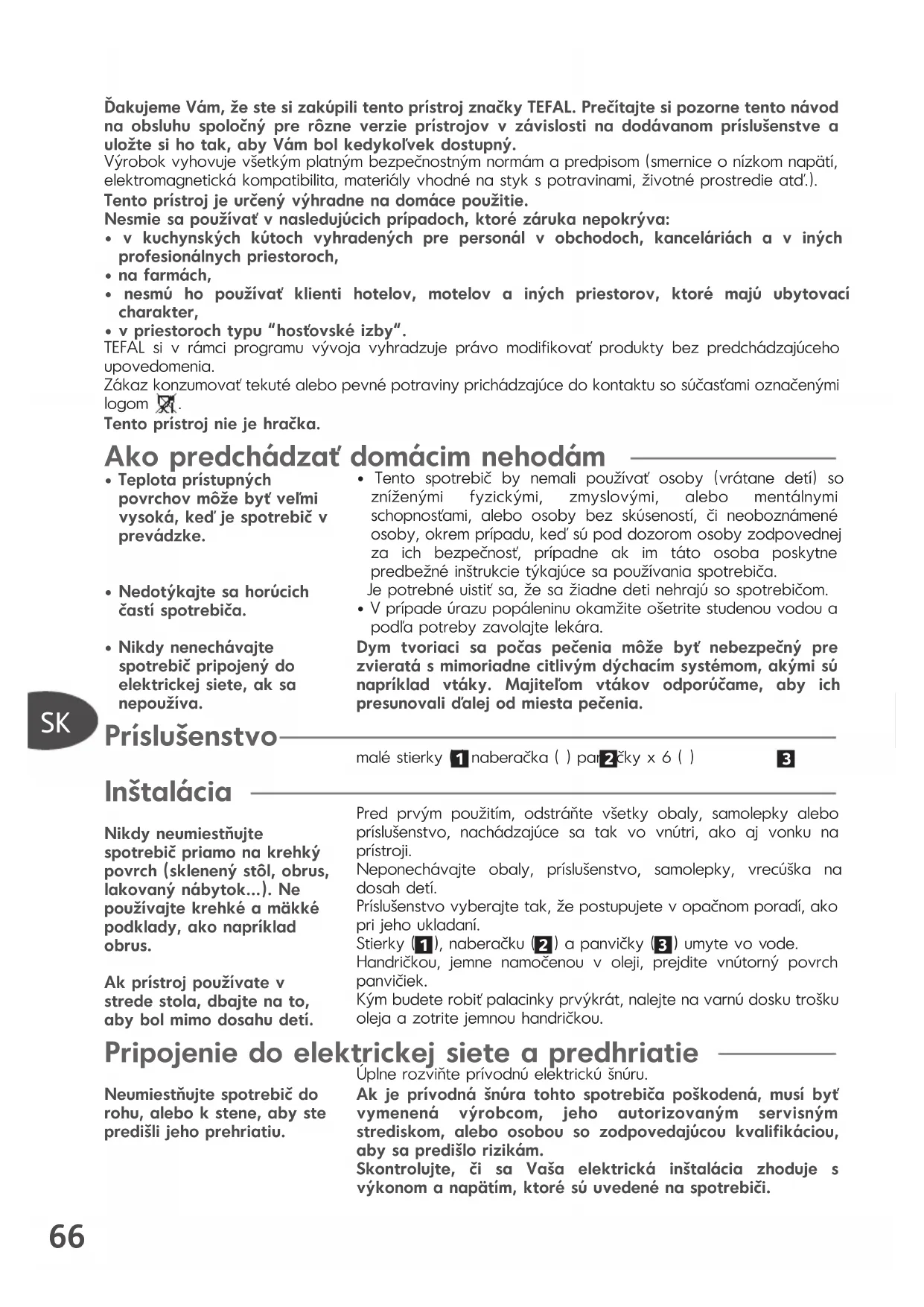 Ďakujeme Vám, že ste si zakúpili tento prístroj značky TEFAL. Prečítajte si pozorne tento návod na obsluhu spoločný pre rôzne verzie prístrojov v závislosti na dodávanom príslušenstve a uložte si ho tak, aby Vám bol kedykoľvek dostupný. Výrobok vyhovuje všetkým platným bezpečnostným normám a predpisom (smernice o nízkom napätí, elektromagnetická kompatibilita, materiály vhodné na styk s potravinami, životné prostredie atď.). Tento prístroj je určený výhradne na domáce použitie. Nesmie sa používať v nasledujúcich prípadoch, ktoré záruka nepokrýva: