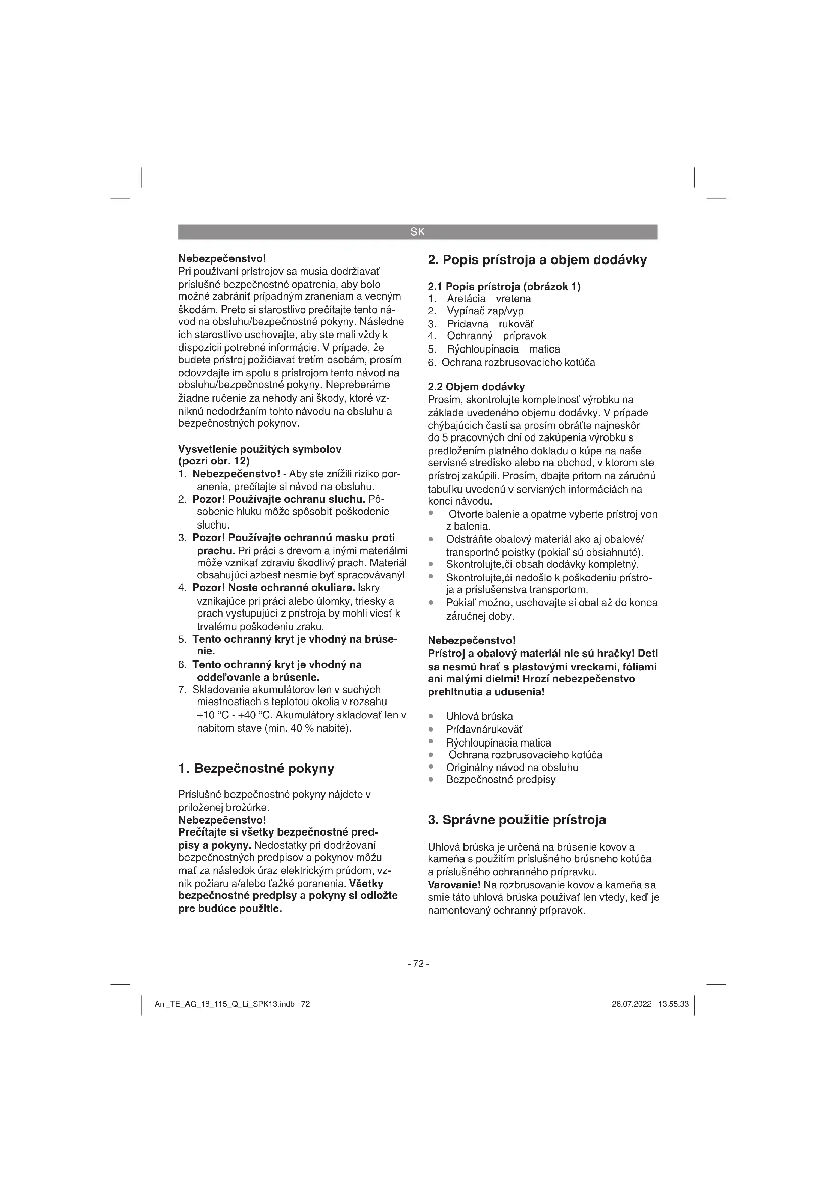 Uhlová brúska je určená na brúsenie kovov a kameňa s použitím príslušného brúsneho kotúča a príslušného ochranného prípravku. Varovanie! Na rozbrusovanie kovov a kameňa sa smie táto uhlová brúska používať len vtedy, keď je namontovaný ochranný prípravok. Anl_TE_AG_18_115_Q_Li_SPK13.indb 72Anl_TE_AG_18_115_Q_Li_SPK13.indb 72 26.07.2022 13:55:3326.07.2022 13:55:33SK