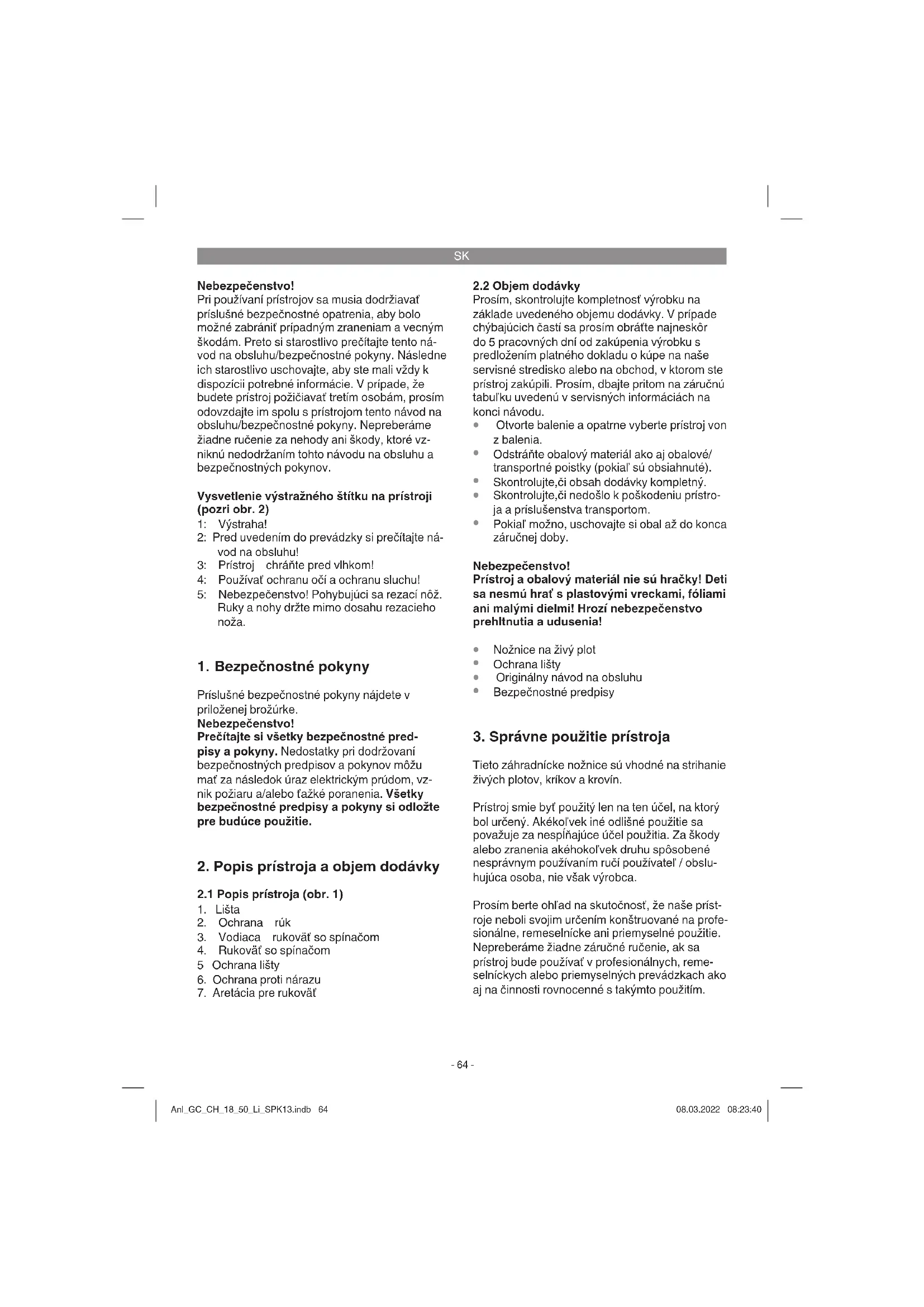 Tieto záhradnícke nožnice sú vhodné na strihanie živých plotov, kríkov a krovín. Prístroj smie byť použitý len na ten účel, na ktorý bol určený. Akékoľvek iné odlišné použitie sa považuje za nespĺňajúce účel použitia. Za škody alebo zranenia akéhokoľvek druhu spôsobené nesprávnym používaním ručí používateľ / obslu- hujúca osoba, nie však výrobca. Prosím berte ohľad na skutočnosť, že naše príst- roje neboli svojim určením konštruované na profe- sionálne, remeselnícke ani priemyselné použitie. Nepreberáme žiadne záručné ručenie, ak sa prístroj bude používať v profesionálnych, reme- selníckych alebo priemyselných prevádzkach ako aj na činnosti rovnocenné s takýmto použitím. Anl_GC_CH_18_50_Li_SPK13.indb 64Anl_GC_CH_18_50_Li_SPK13.indb 64 08.03.2022 08:23:4008.03.2022 08:23:40SK
